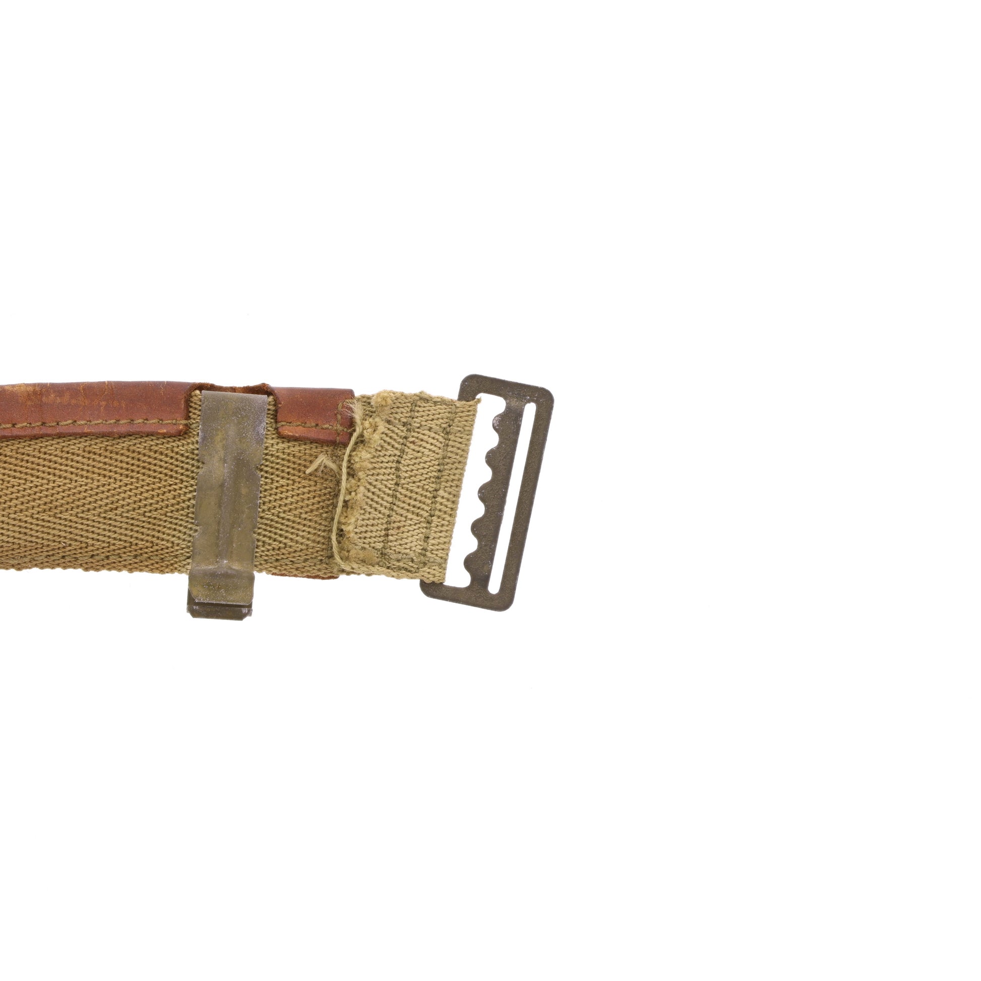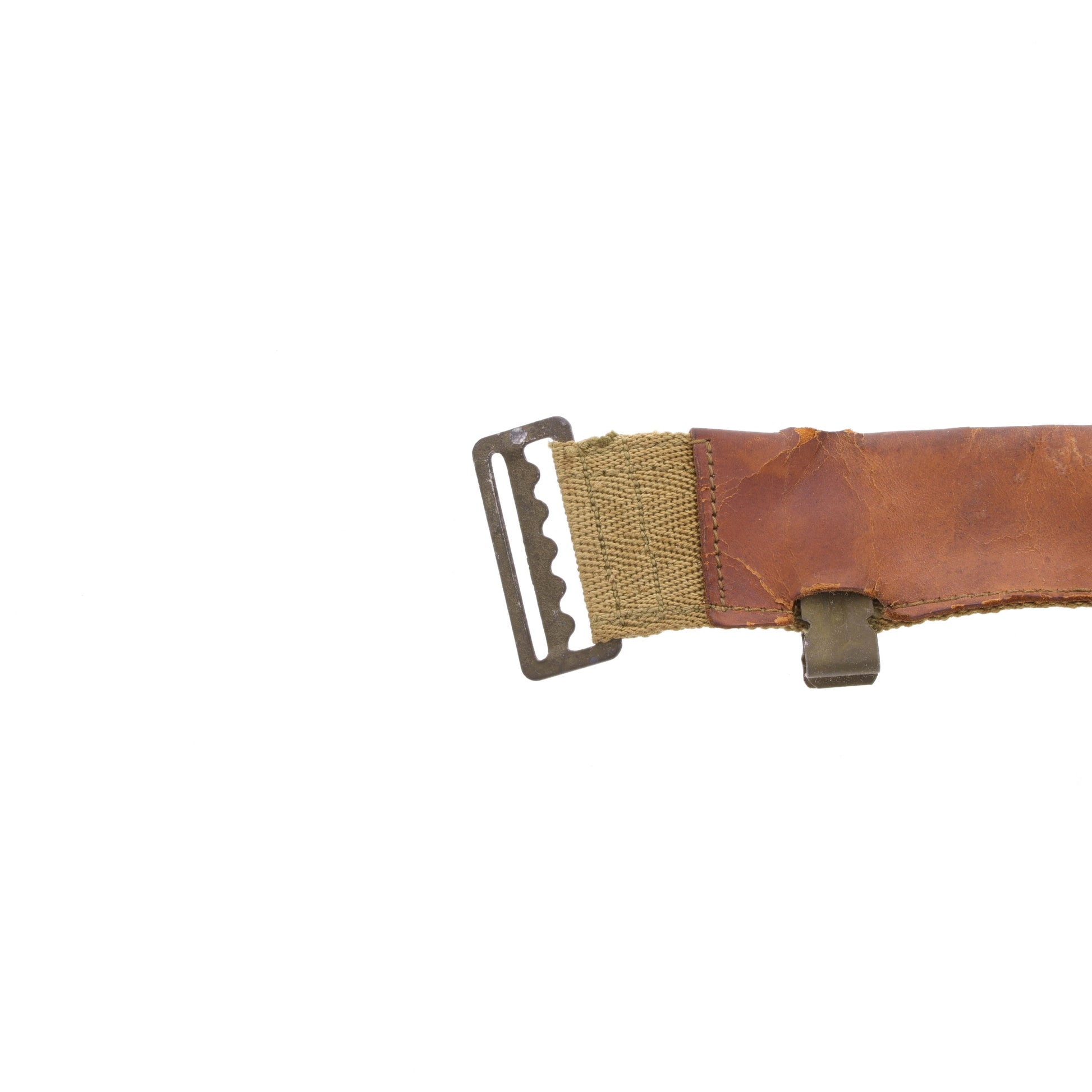 This original WWII U.S. M-1 helmet liner headband was produced by Vogt Manufacturing Corp. The hardware is green painted steel, approximately dating its production from mid-1942 to late-1943. It exhibits third pattern spring clips, which have a fold in the metal's bottom edge. This would be an ideal headband for a helmet liner with either non-painted or green painted steel A-washers.