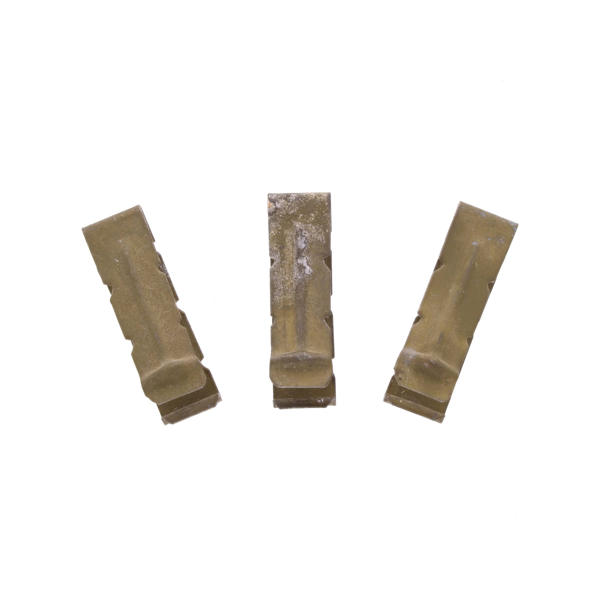 This listing is for a single original WWII U.S. M-1 helmet liner headband spring clip; however, several are available - all of which were recovered from wartime headbands. These are all green painted steel third pattern spring clips, which have a fold in the metal's bottom edge. These are commonly seen on headbands produced from 1942 to 1945.