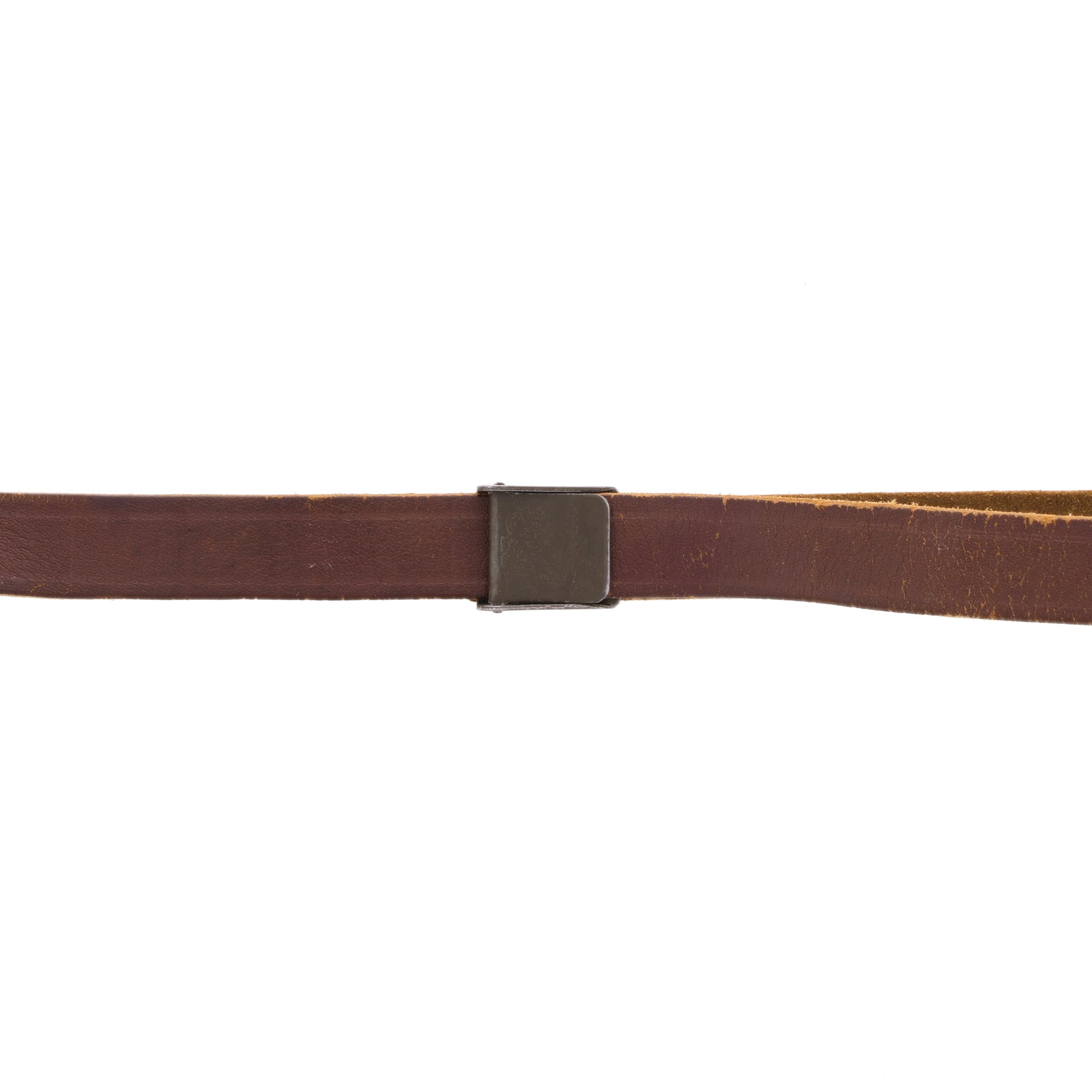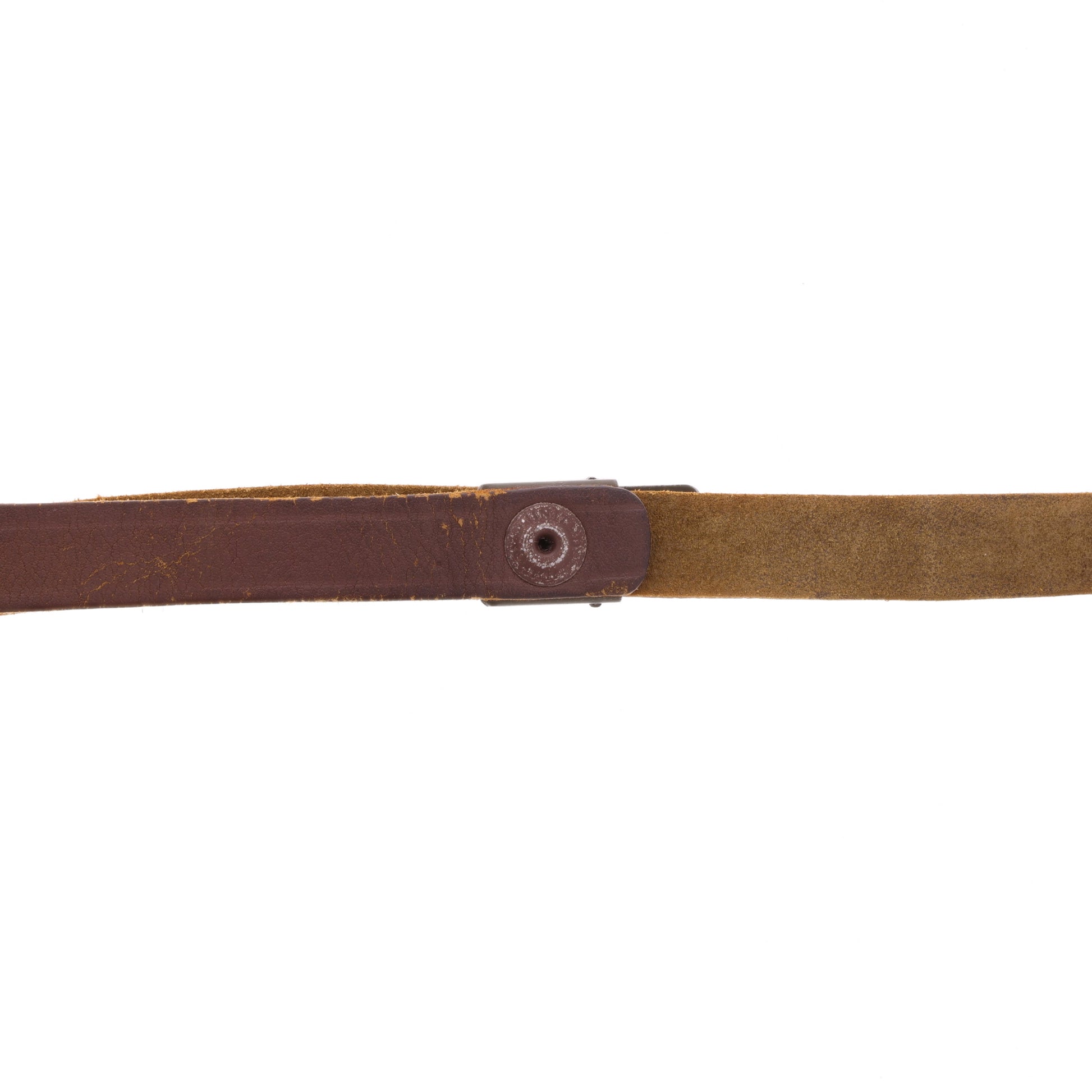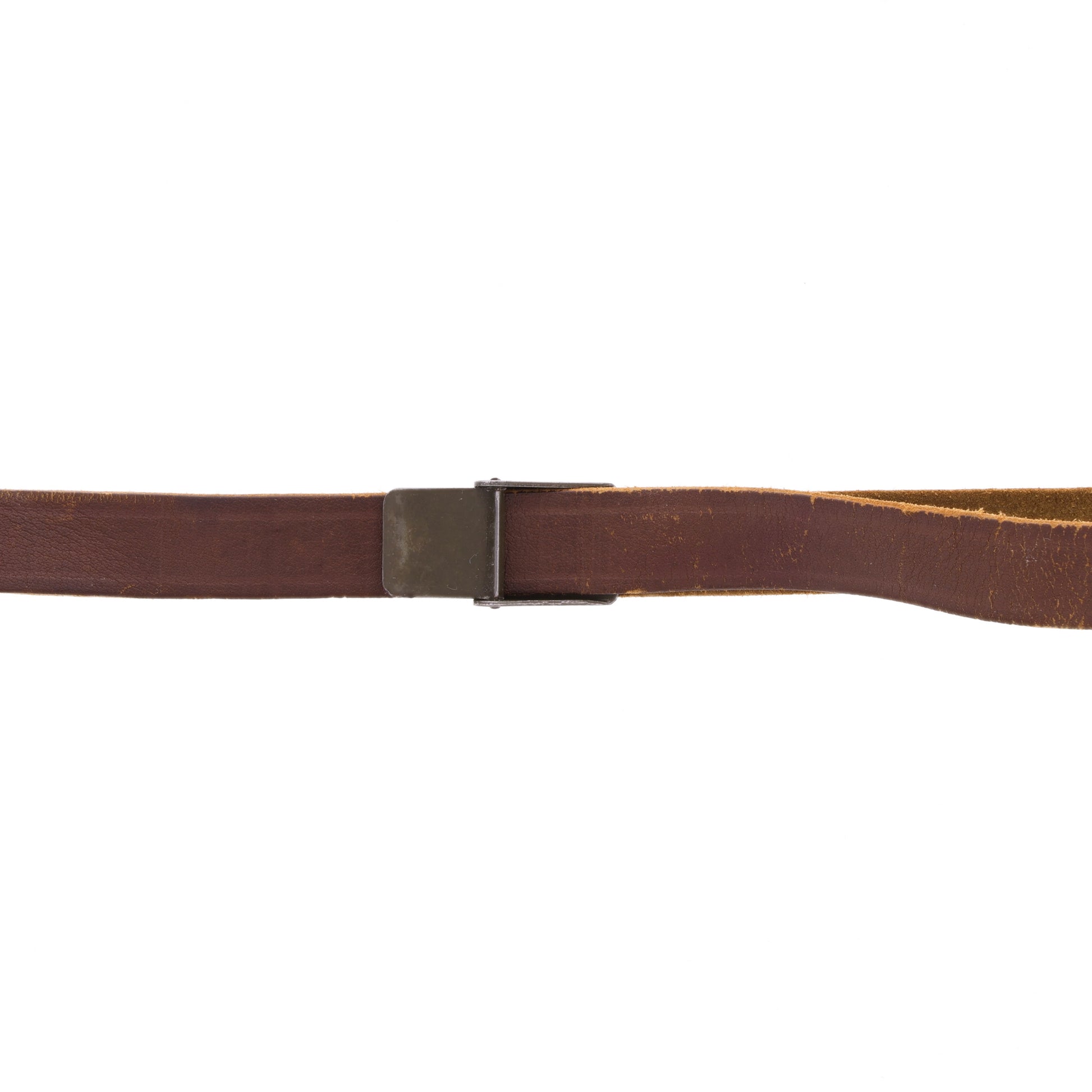 This is an original WWII U.S. M-1 helmet liner leather chinstrap. The green painted steel buckle is the early variation with the flat cam lever, approximately dating the chinstrap's production from late-1942 to mid-1943. The buckle is secured by a brown painted United Carr rivet. The vast majority of early-war liner chinstraps exhibit green hardware; however, a limited amount was produced with brown buckles and rivets. This example was produced using the remaining rivets from that stock. This would be an ideal chinstrap for a helmet liner with either non-painted or green painted steel A-washers.