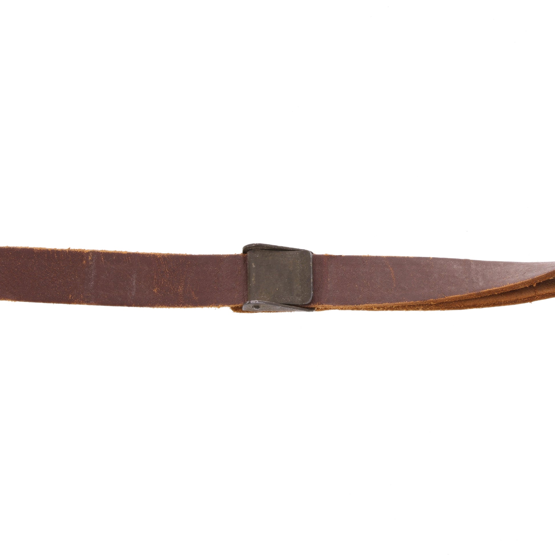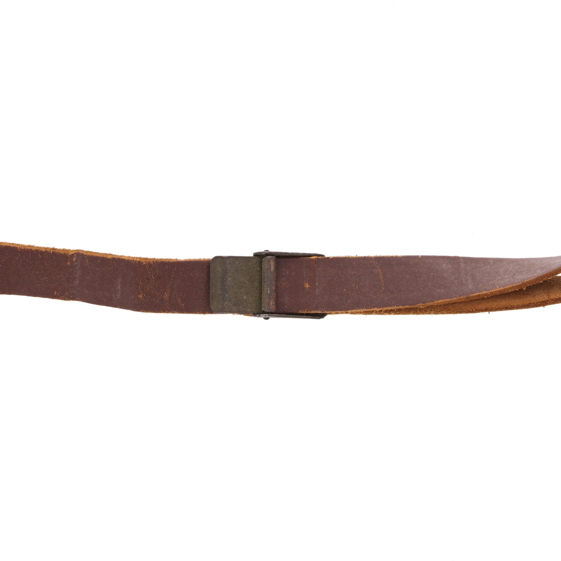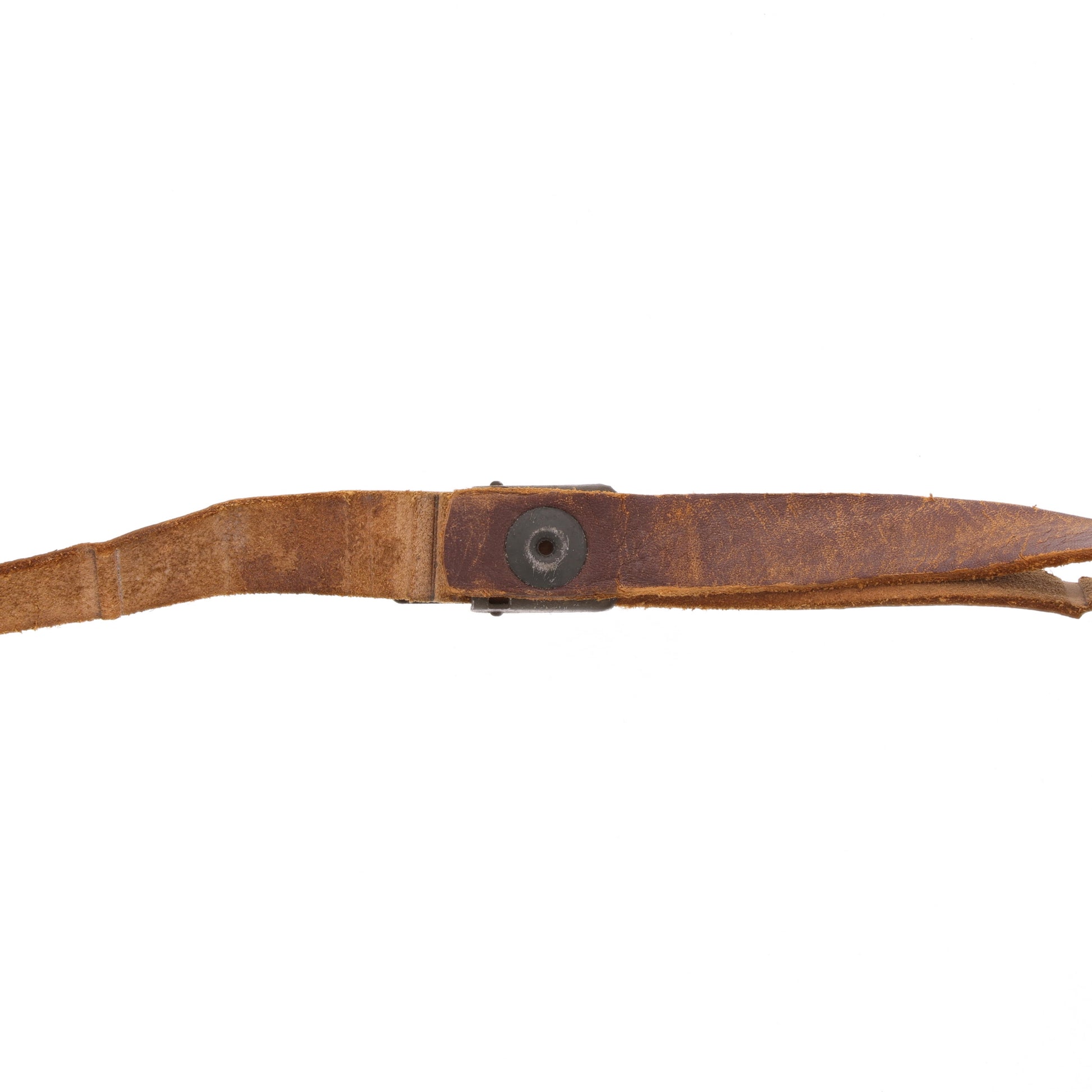 This is an original WWII U.S. M-1 helmet liner leather chinstrap. It features a green painted steel buckle and unmarked rivets, approximately dating its production from mid-1943 to mid-1944. This would be an ideal chinstrap for a high-pressure helmet liner with either green painted steel or blackened brass A-washers.