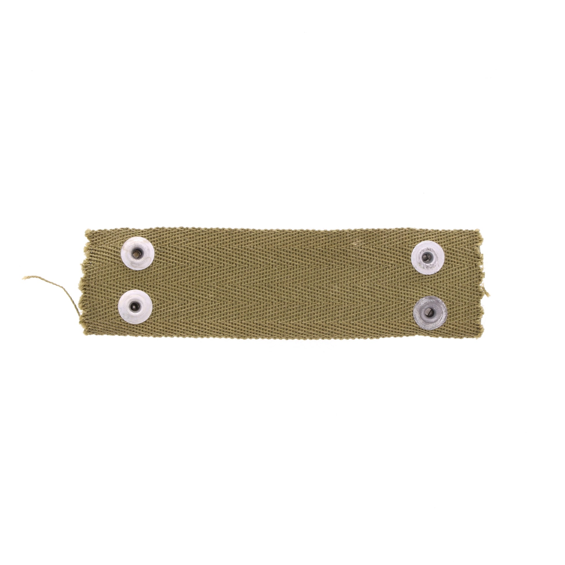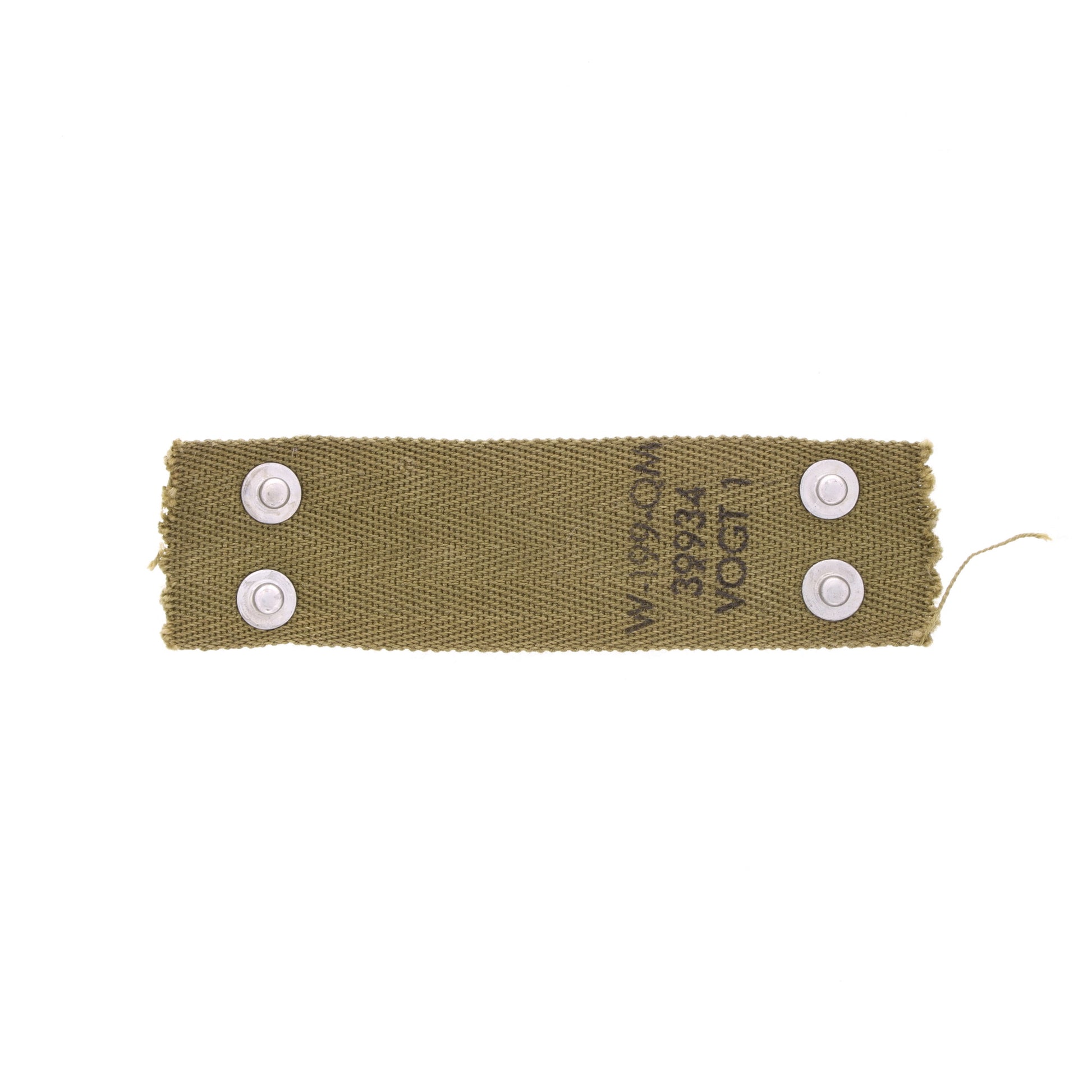 This original WWII U.S. M-1 helmet liner neckband was manufactured by Vogt Manufacturing Corp. and is from the "W-199-QM 39934" contract. The earliest OD#3 (khaki) neckbands were produced in three different sizes during the war: 1, 3 and 5. This example, with its "1" marking, is equivalent to a size small. It exhibits steel unmarked snaps. This neckband would be ideal for a helmet liner with non-painted steel A-washers (including Hawleys and low-pressure liners).