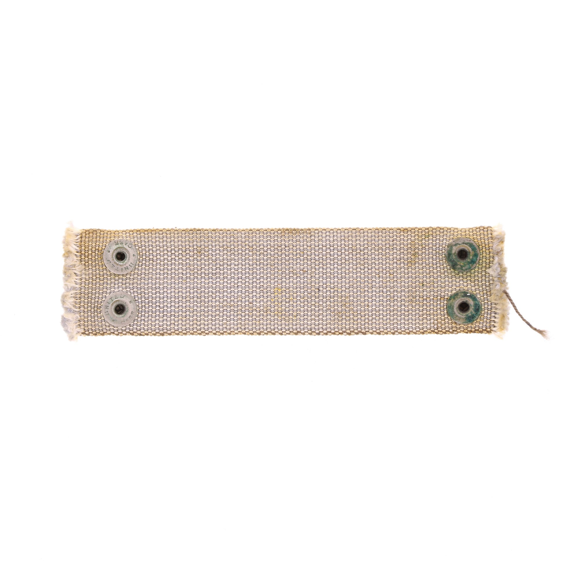 This neckband is in good, used condition. The fabric is strong, and all four snaps are intact; however, two show signs of verdigris.