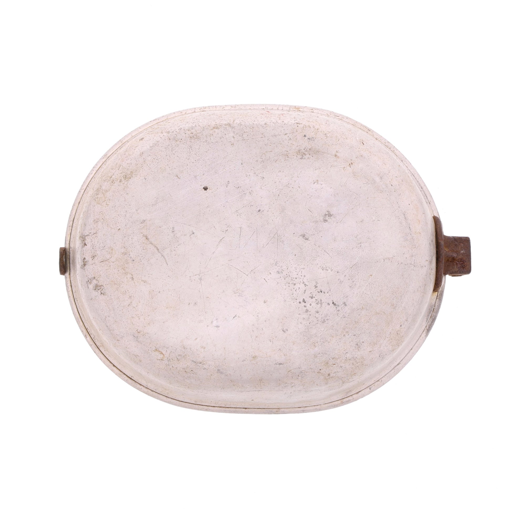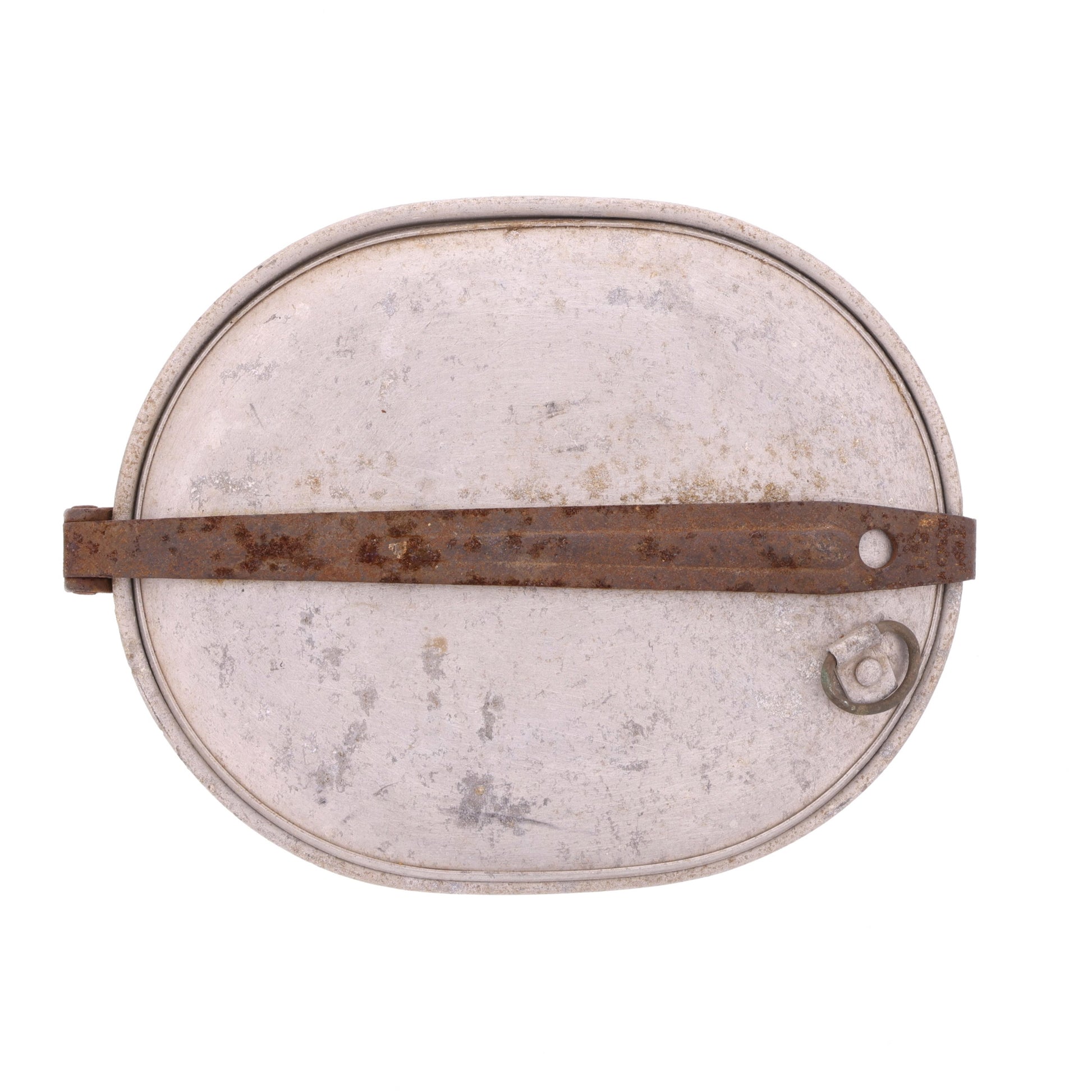This mess kit is in good condition and even retains its original and often missing D-ring. The steel handle, though, has rusted.