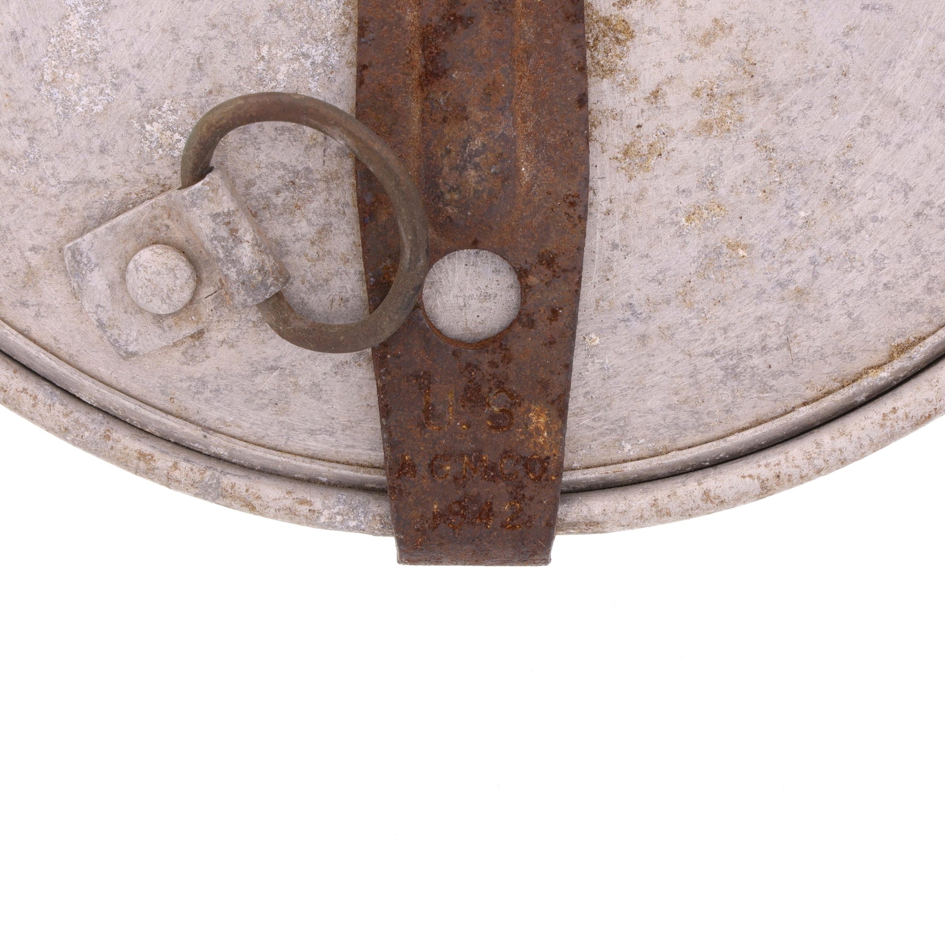 This original WWII U.S. M1918 aluminum mess kit was manufactured in 1942 by Aluminum Goods Manufacturing Company of Manitowoc, Wisconsin. Later that same year, A.G.M. Co. began production of the M1942 mess kit, making this a unique, transitional piece. Interestingly, etched into the bottom is the original owner's initials, "JAA".