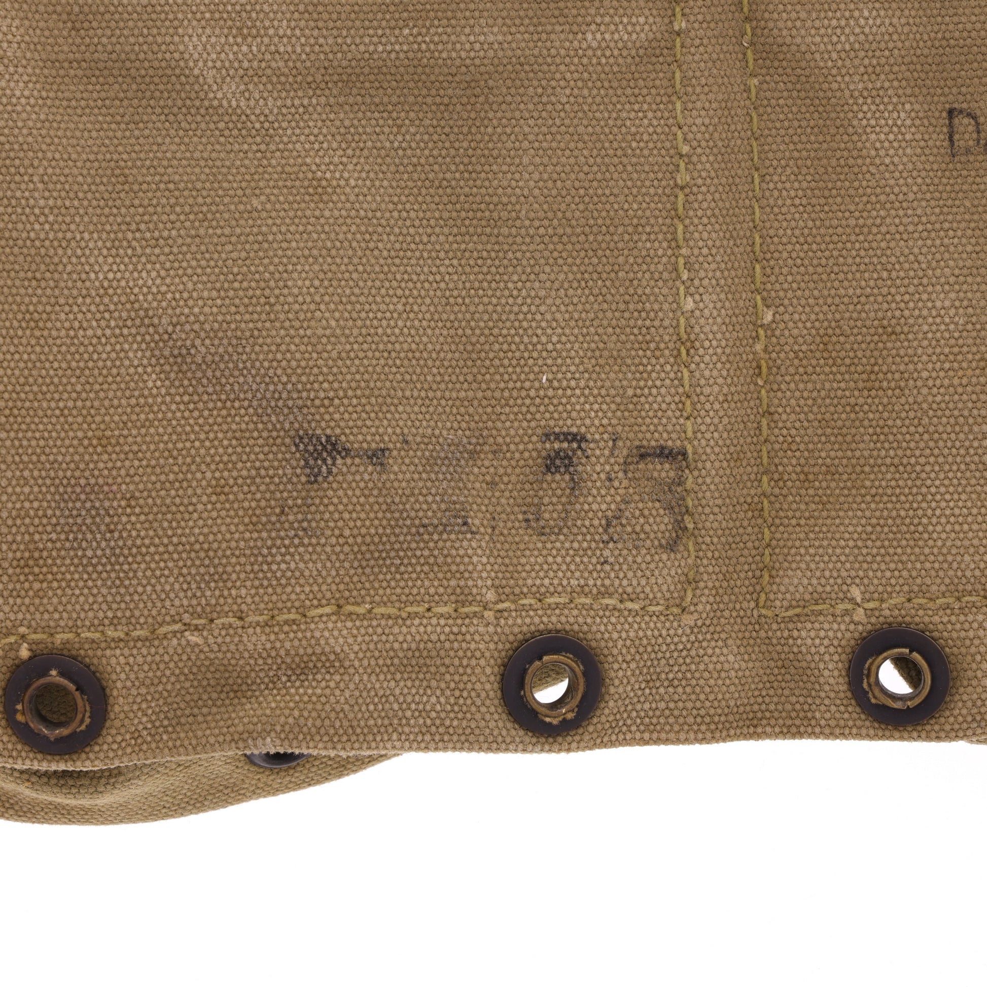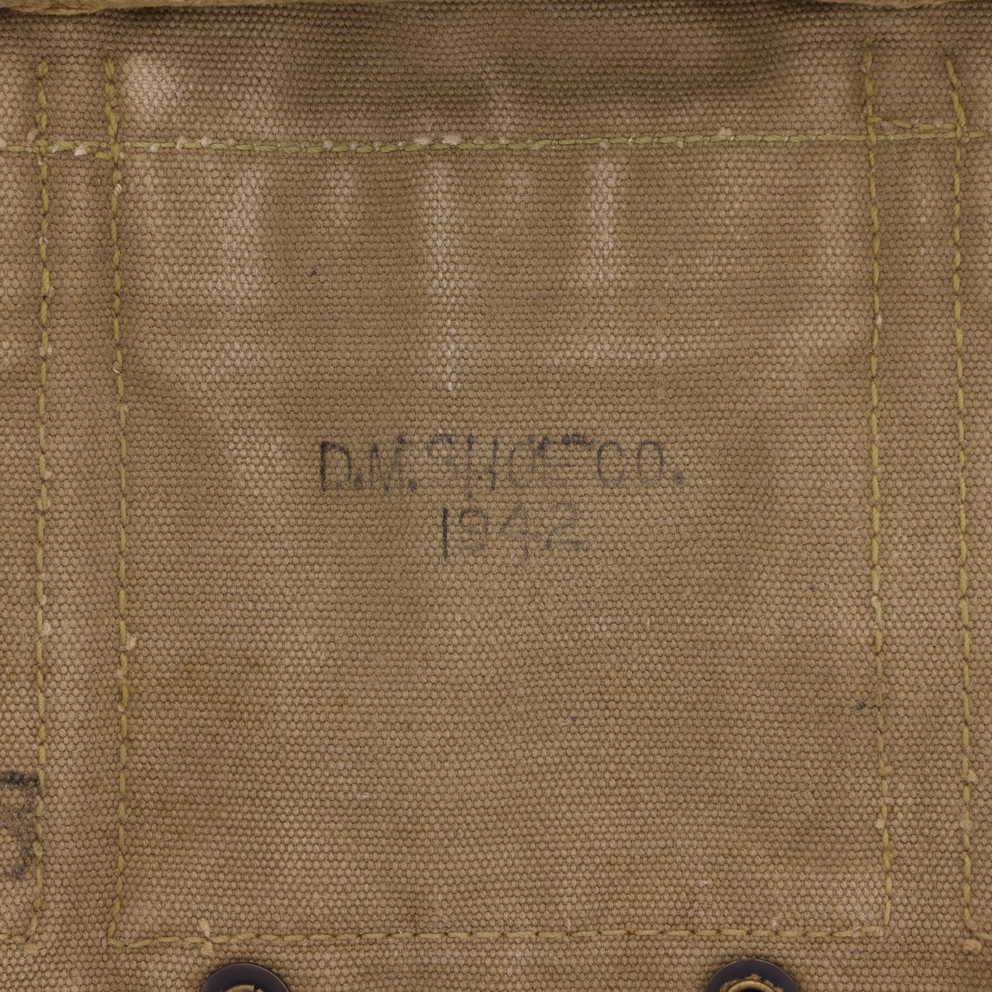 This is an original WWII U.S. Army M1937 ammunition belt for the 1918A2 Browning Automatic Rifle (BAR) magazines. It is a matching set, with both pouches being manufactured by D. M. Shoe Co. in 1942. The webbing exhibits the faint laundry number of its original owner.