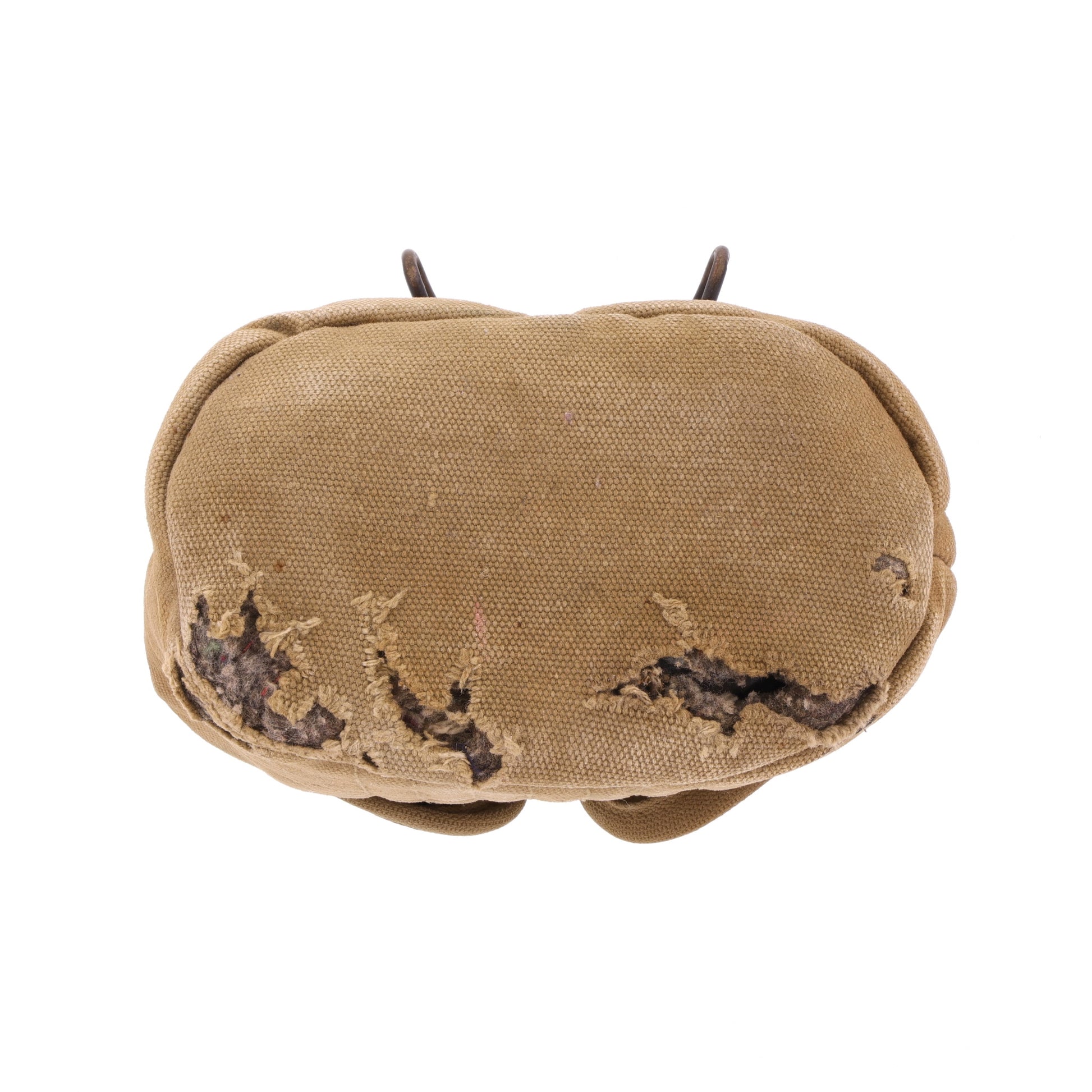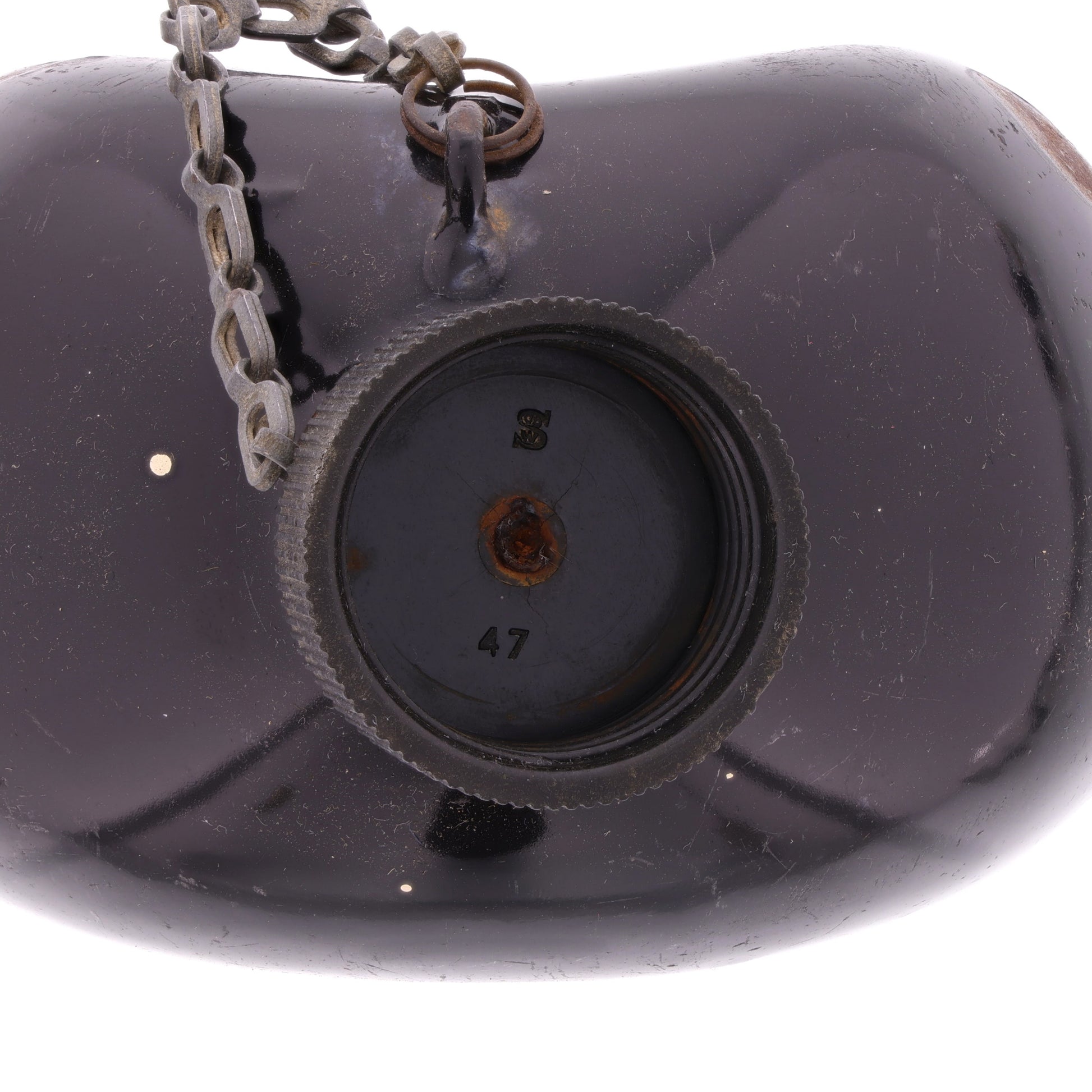 This is an original and rather uncommon WWII U.S. M1942 black porcelain enamel canteen with its original cover. The canteen was manufactured in 1942 by United States Stamping Co. of Moundsville, West Virginia. Due to aluminum shortages, alternative material was sought for canteens. Among those considered was lower quality metals finished in porcelain enamel. They were not well received by troops, though. When the canteen was dented, small chips of enamel would flake off, contaminating the water inside. As a result, most enamel canteens were removed from service, making them quite rare today. Its black bakelite cap is marked inside with a small, interlaced "W.S. Co." marking and mold number of "47", denoting production by Wheeling Stamping Co. of Wheeling, West Virginia. The canvas cover's manufacturer's and date marking have unfortunately faded beyond legibility, however it exhibits a side seam, first introduced in 1941 and standardized the following year.