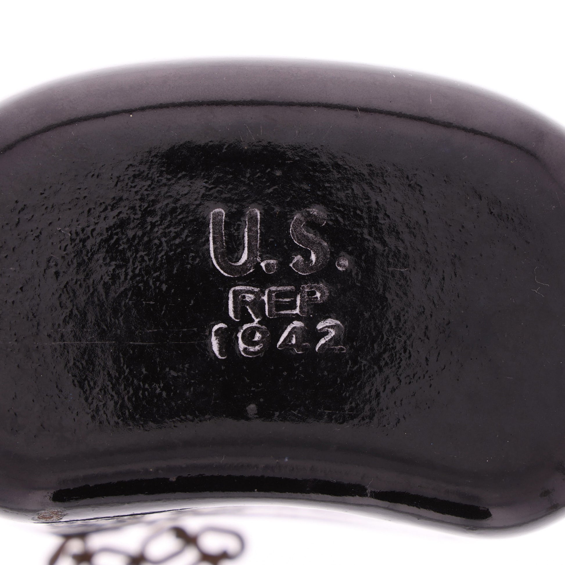 This is an original and rather uncommon WWII U.S. M1942 black porcelain enamel canteen with its original P1941 3rd pattern USMC cover. The canteen was manufactured in 1942 by Republic Stamping and Enameling Co. of Canton, Ohio. Due to aluminum shortages, alternative material was sought for canteens. Among those considered was lower quality metals finished in porcelain enamel. They were not well received by troops, though. When the canteen was dented, small chips of enamel would flake off, contaminating the water inside. As a result, most enamel canteens were removed from service, making them quite rare today. Its black bakelite cap is marked inside with a small, interlaced "W.S. Co." marking and mold number of "79", denoting production by Wheeling Stamping Co. of Wheeling, West Virginia. The unmarked canvas cover is a 3rd pattern variation with "dog ear" cross closure flaps.