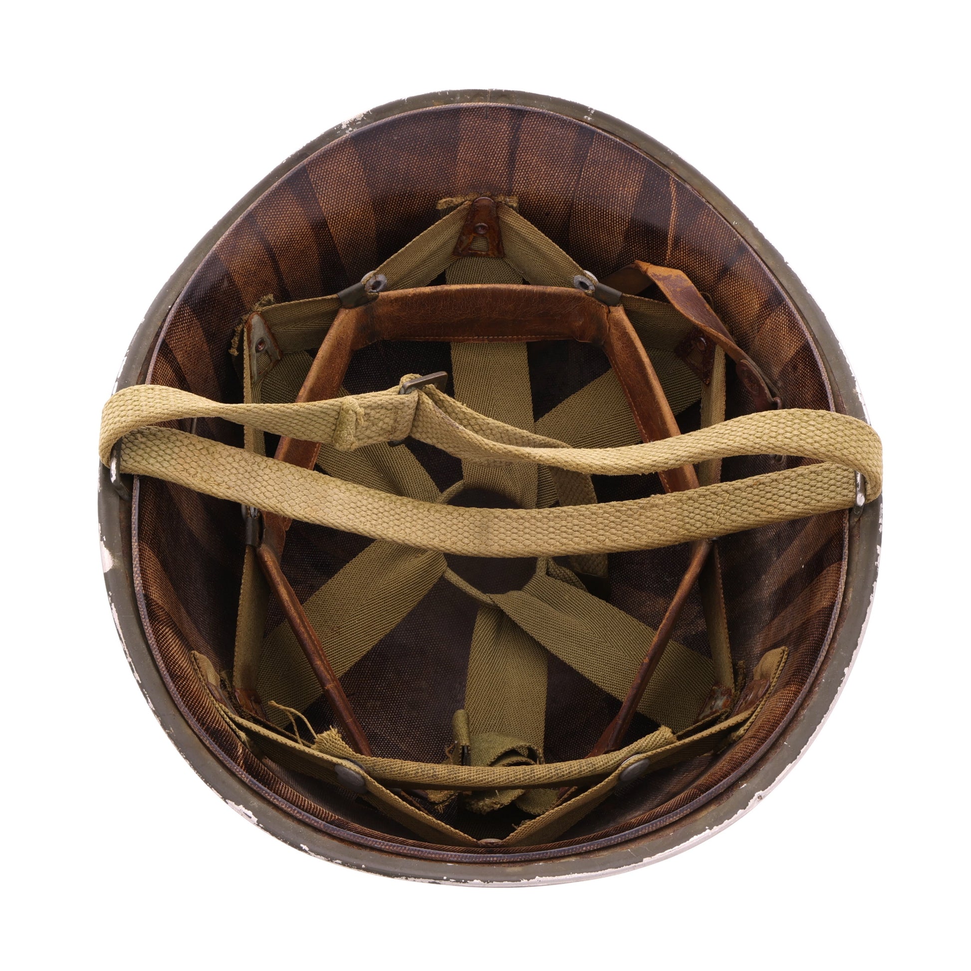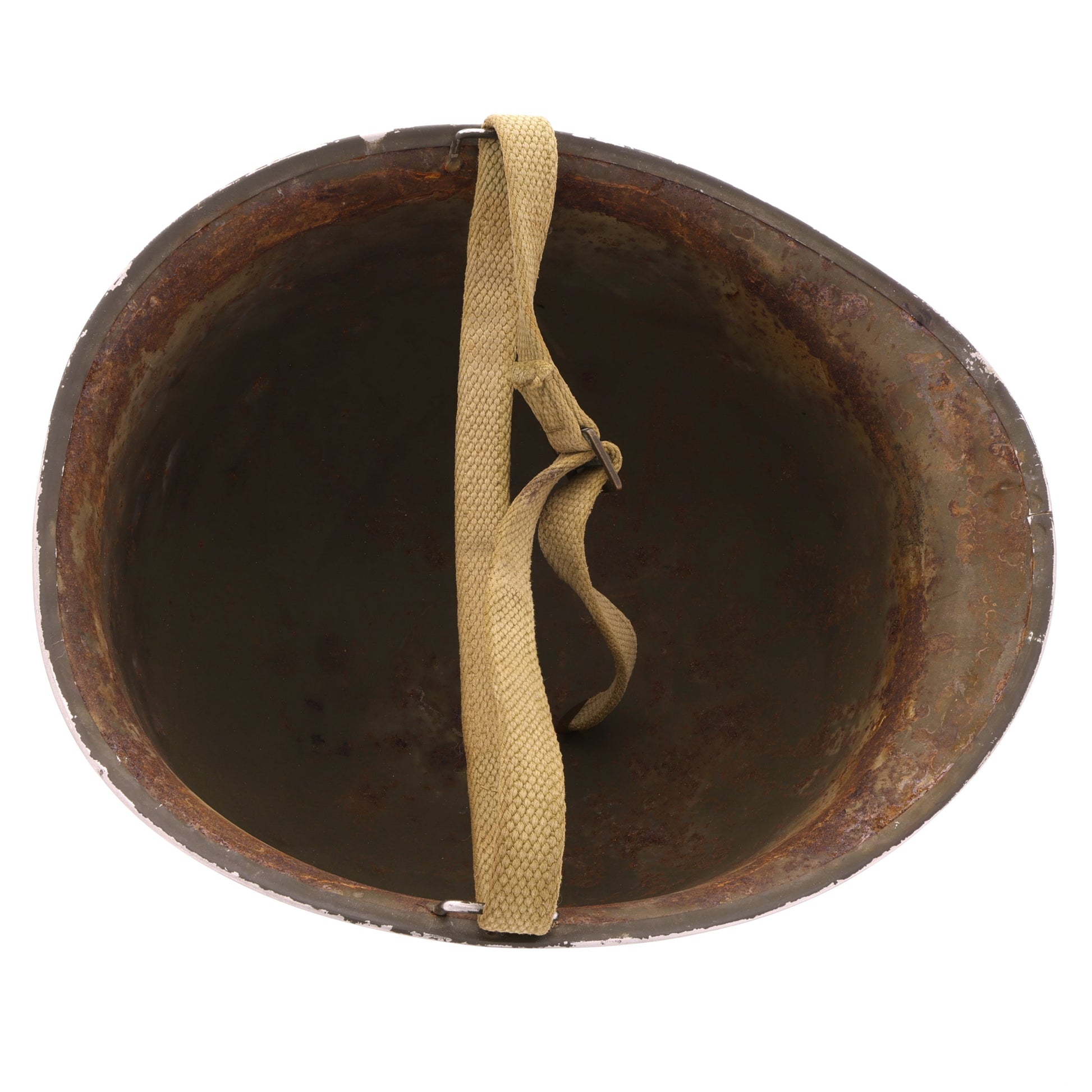 This is an original WWII U.S. M-1 helmet set. The front seam fixed loop helmet shell was manufactured by McCord Radiator & Manufacturing Co. of Detroit, Michigan and exhibits a lot number of "363D", approximately dating its production to late-1942. The helmet retains its original olive drab factory finish and cork texture. Interestingly, the chinstrap is actually a field-improvised replacement. The helmet's liner was produced by Inland Manufacturing Division, a subsidiary of General Motors Company located in Dayton, Ohio. It features non-painted steel A-washers and a transitional OD#3 suspension with snaps designed to accommodate the rayon headband and folded ends on the neck support, which approximately dates the liner's production from mid-1942 to mid-1943. The suspension comes complete with its original headband, neckband, and damaged leather chinstrap. Like the steel shell, the liner also retains its original olive drab factory finish with rust staining matching that of the shell's interior, showcasing their long history together as a set.
