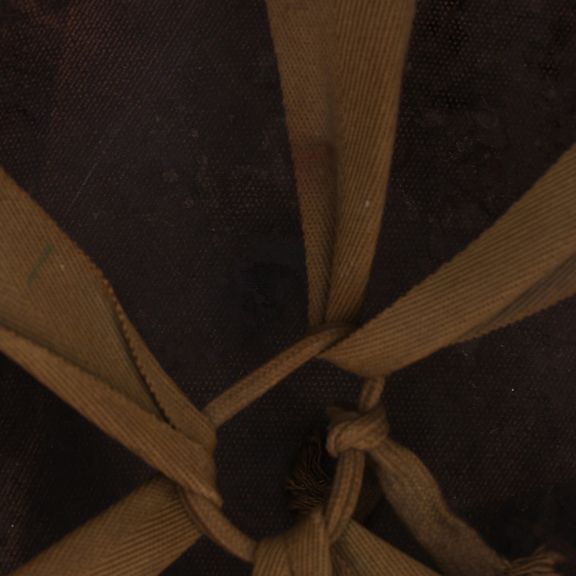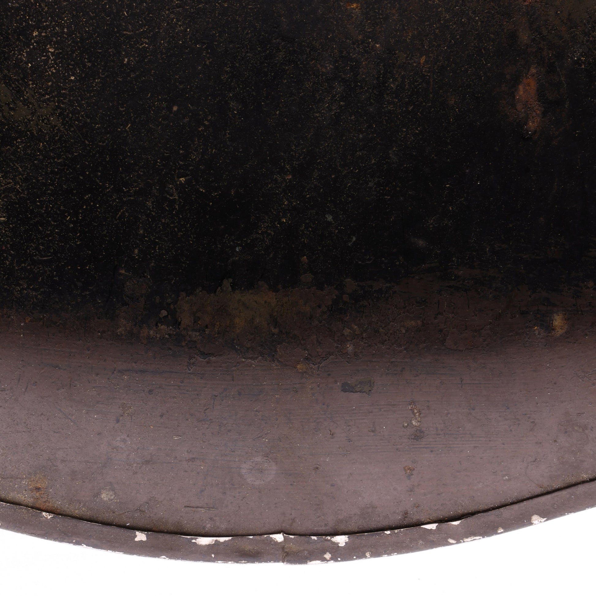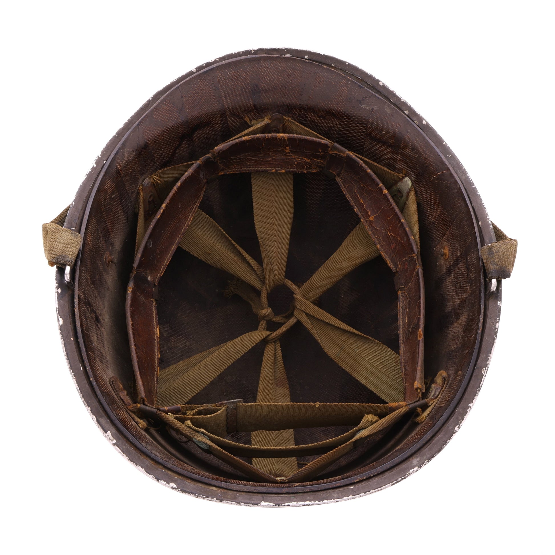 This original WWII U.S. M-1 helmet set showcases an original, and rather subtle brown field repaint, often attributed to the Mediterranean Theater of Operations. The front seam fixed loop helmet shell was manufactured by McCord Radiator & Manufacturing Co. of Detroit, Michigan. The lot number is concealed beneath the interior's field repaint; however, judging by the later style fixed loops, it likely dates from mid-1942 to late-1943. In addition to the original field repaint, the helmet retains its original cork texture and OD#3 (khaki) chinstraps with brass hardware. Interestingly, a rumor started circulating among soldiers that the blast of a nearby explosion could snap the wearer’s neck if their helmet’s chinstraps were secured under their chin. This helmet's original owner heeded these warnings and modified his chinstraps by cutting through just enough of the shorter side’s stitching to extend the length of the strap, allowing it to be fastened around the helmet's brim. The helmet's liner was produced by Inland Manufacturing Division, a subsidiary of General Motors Company located in Dayton, Ohio. It features non-painted steel A-washers and an OD#3 suspension, approximately dating the liner's production from late-1942 to mid-1943. The suspension comes complete with its original headband and neckband. Like the steel shell, the helmet liner is painted with the same brown field repaint, showcasing their long history together as a set.