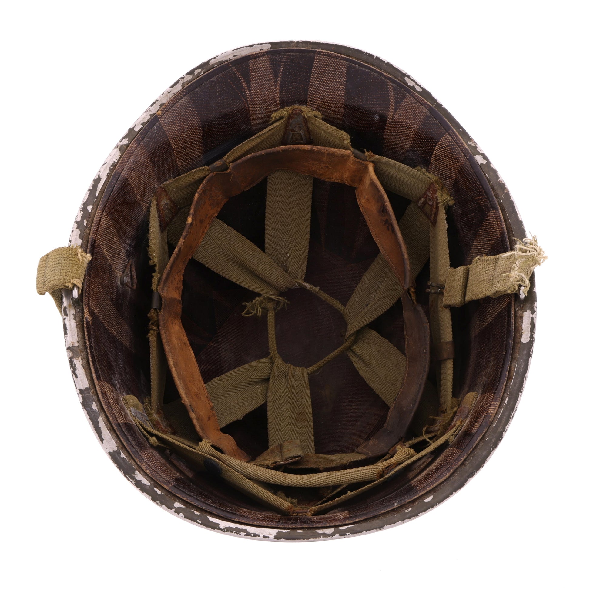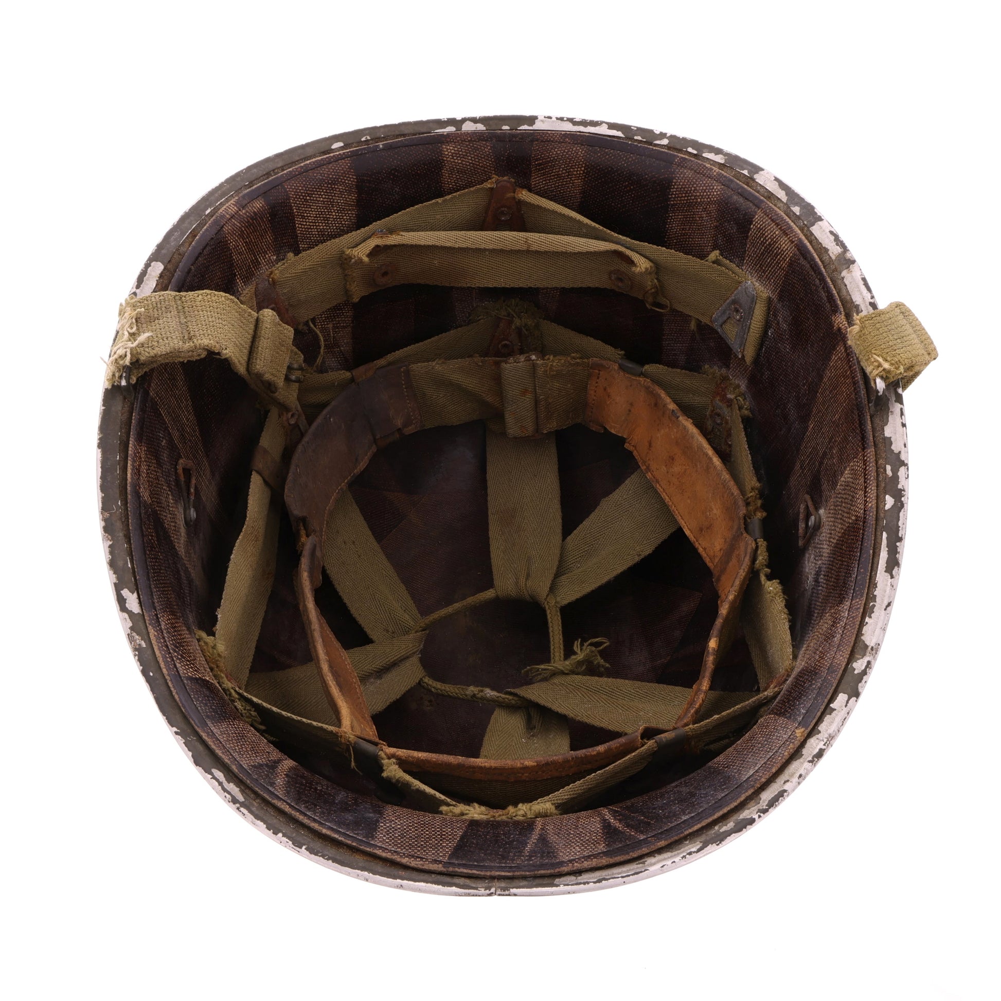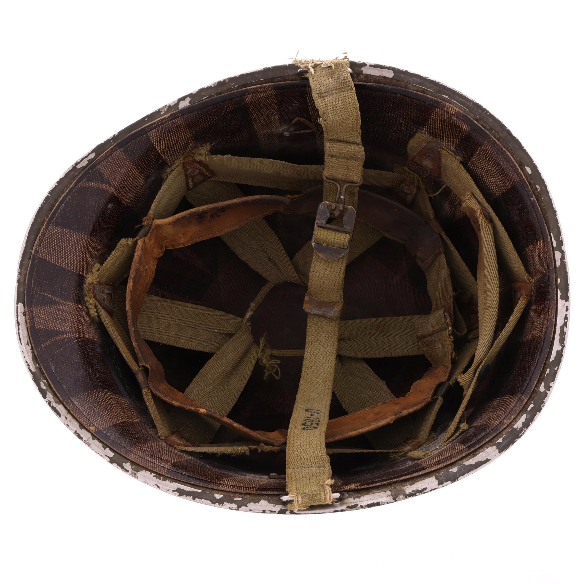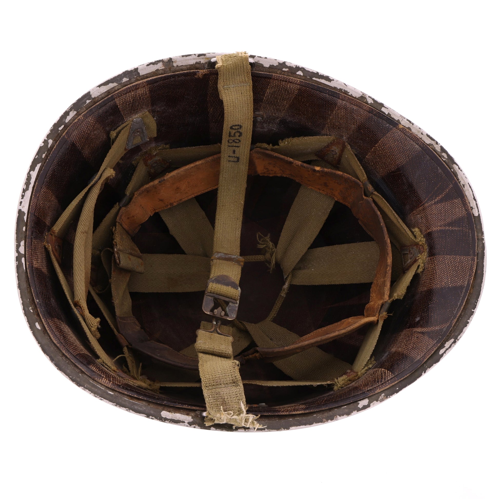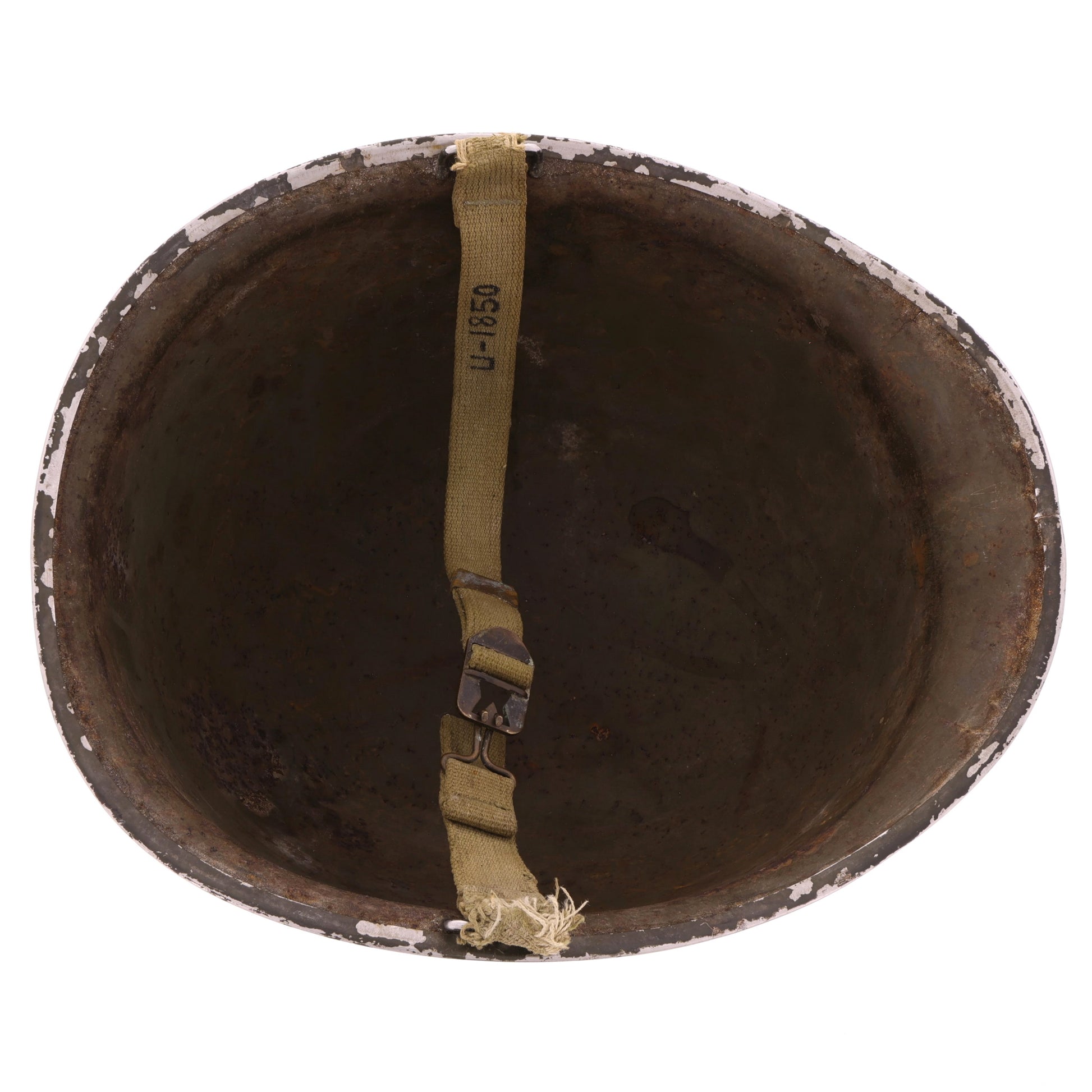 This original WWII U.S. M-1 helmet set is identified to Donald E. Upchurch, 16161850. View the Veteran's Information section for more details regarding Upchurch's life and military service. The front seam fixed loop helmet shell was manufactured by McCord Radiator & Manufacturing Co. of Detroit, Michigan and exhibits a lot number of "94A", approximately dating its production to early-1942. The helmet retains its original olive drab factory finish, cork texture, and OD#3 (khaki) chinstraps with brass hardware and a raised bar buckle. The chinstrap is marked with Upchurch's laundry number, "U-1850". The helmet's liner was produced by Westinghouse Electric & Manufacturing Company of Pittsburgh, Pennsylvania. It features non-painted steel A-washers and an OD#3 suspension with folded ends on the neck support, which approximately dates the liner's production to late-1942. It comes complete with its original neckband. When first acquired, this helmet was missing its headband; we sourced a faithful replacement that matches not only the production timeframe of the other components but their condition as well. Like the steel shell, the liner also retains its original olive drab factory finish with rust staining matching that of the shell's interior, showcasing their long history together as a set.