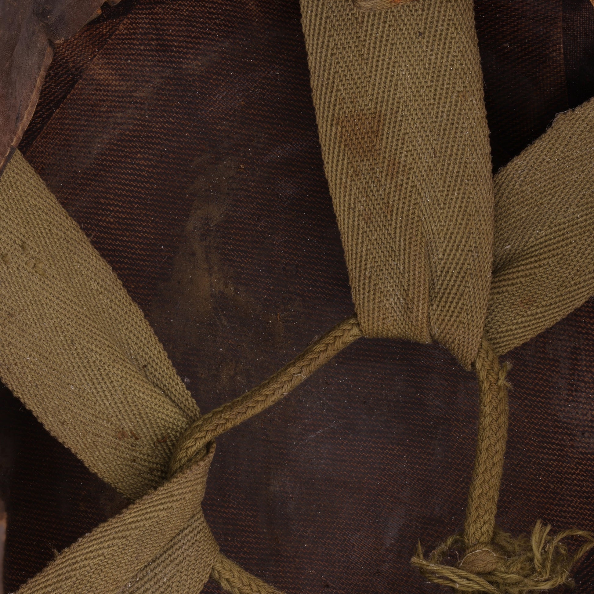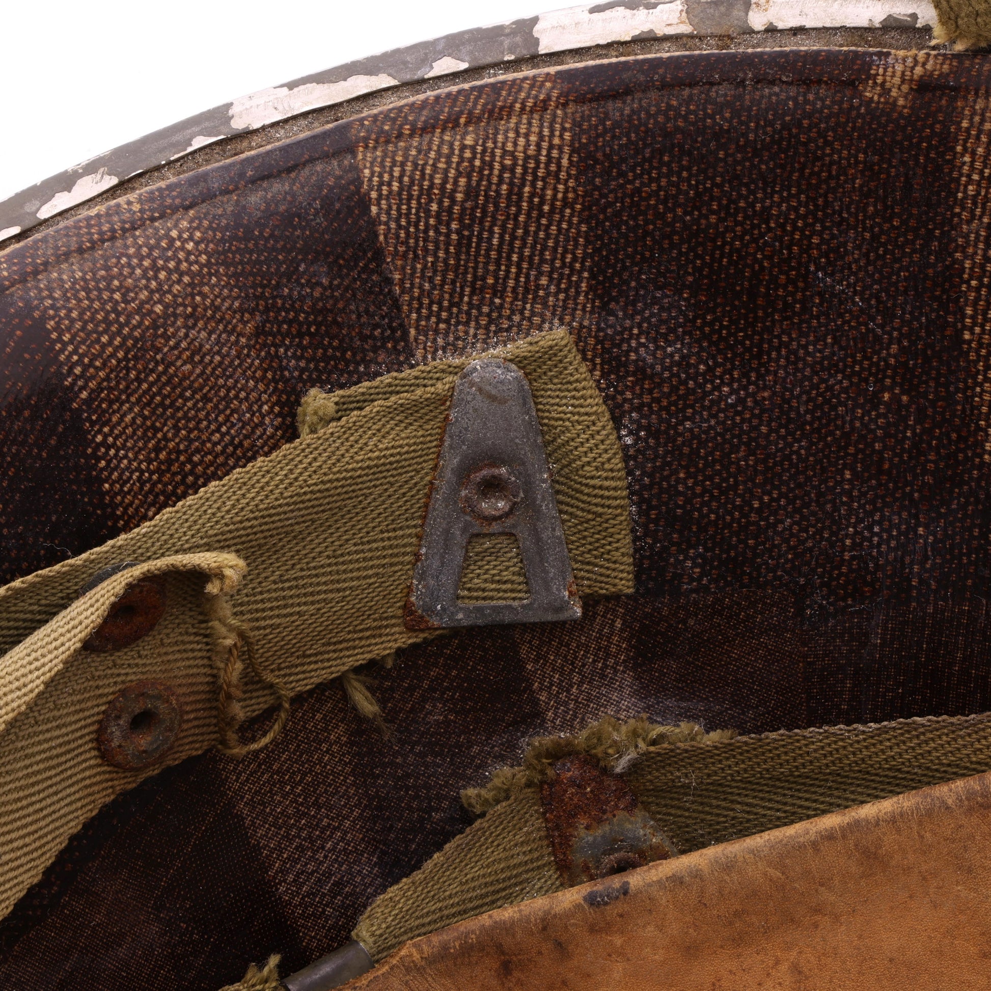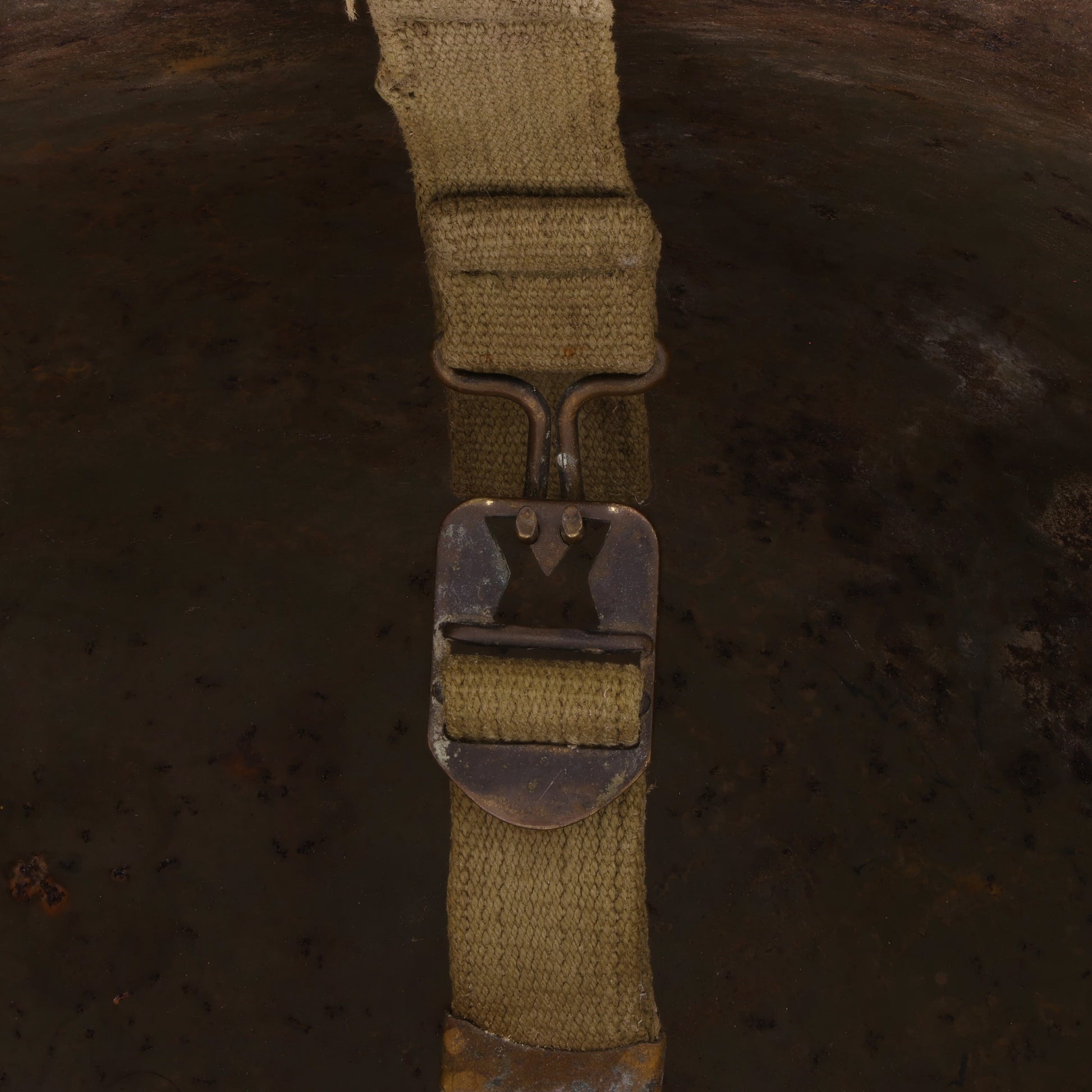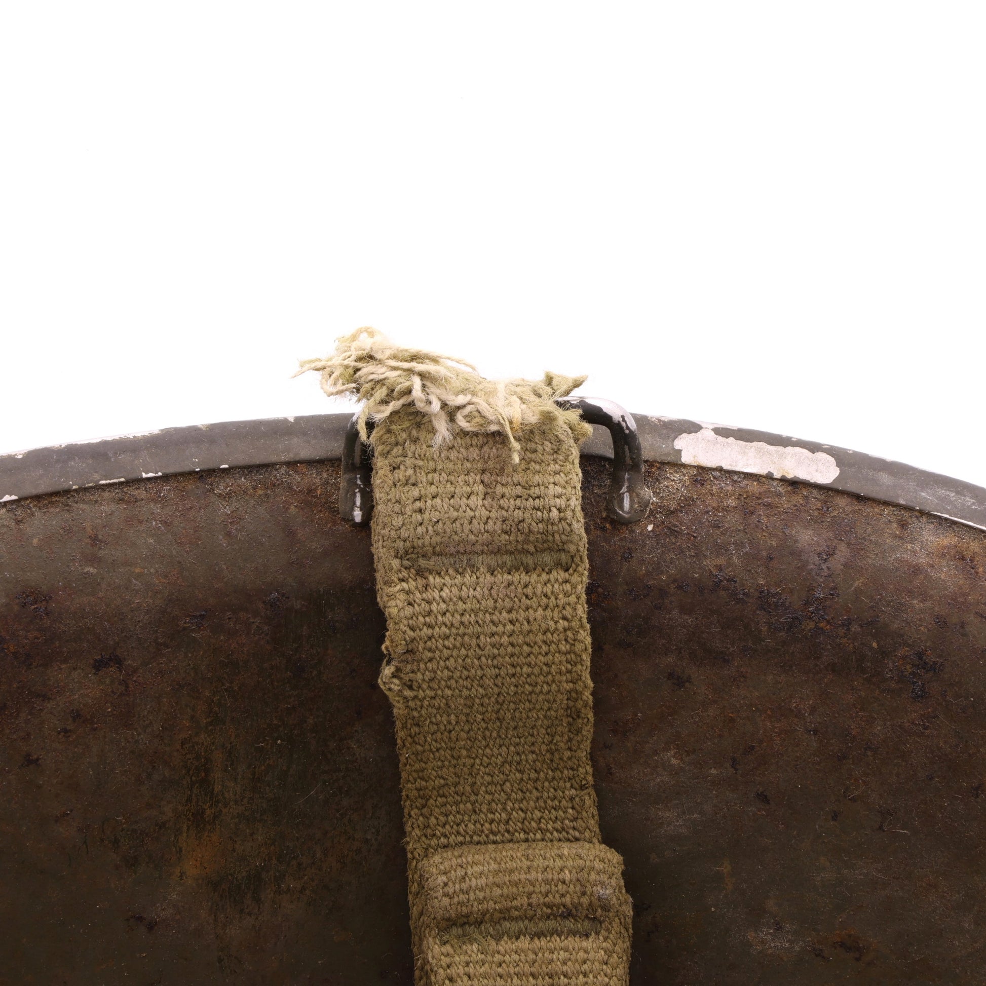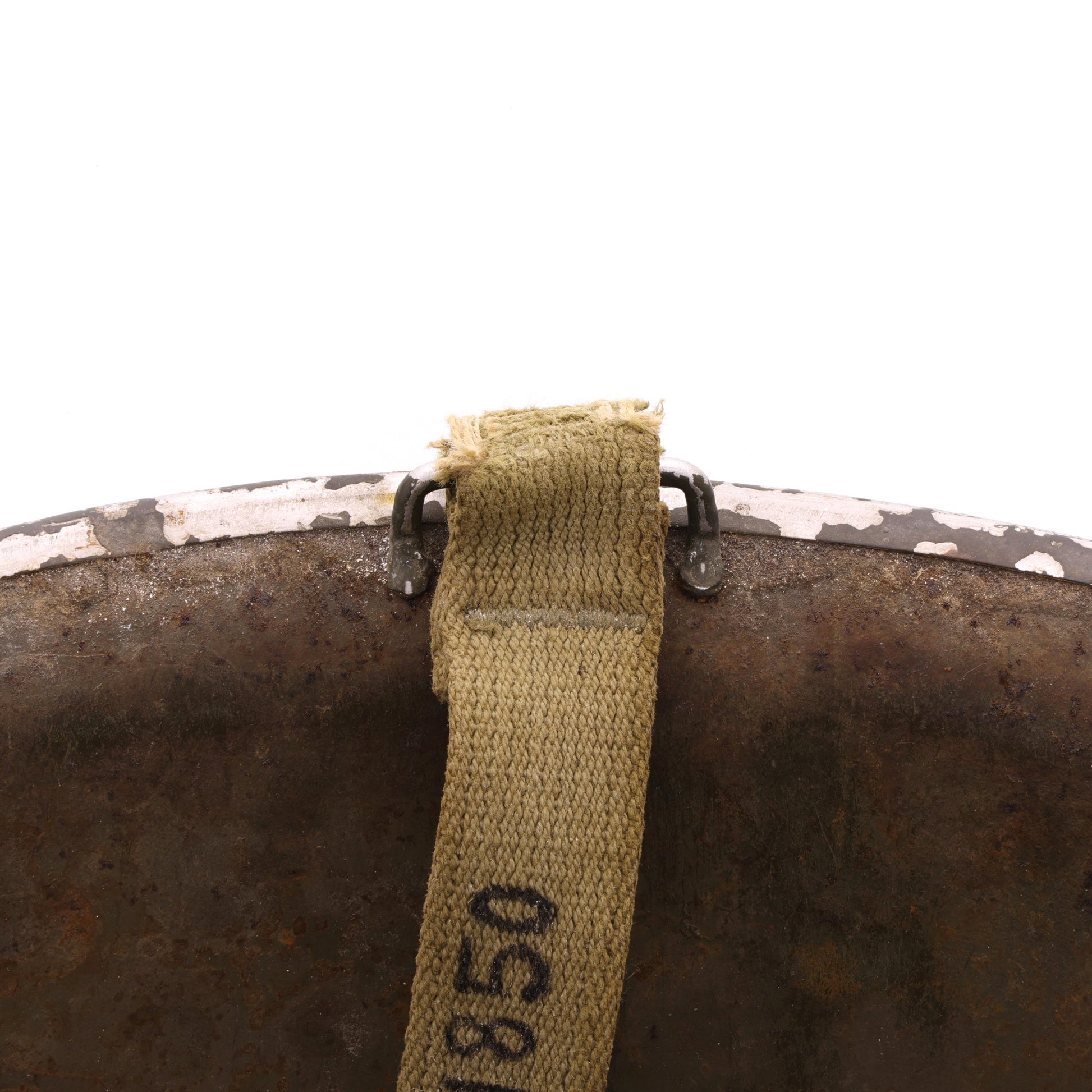 This helmet set is in good, used condition. The steel shell exhibits surface rust throughout, its shorter chinstrap features an apparent field repair, and the liner's interior components show signs of wear and damage.