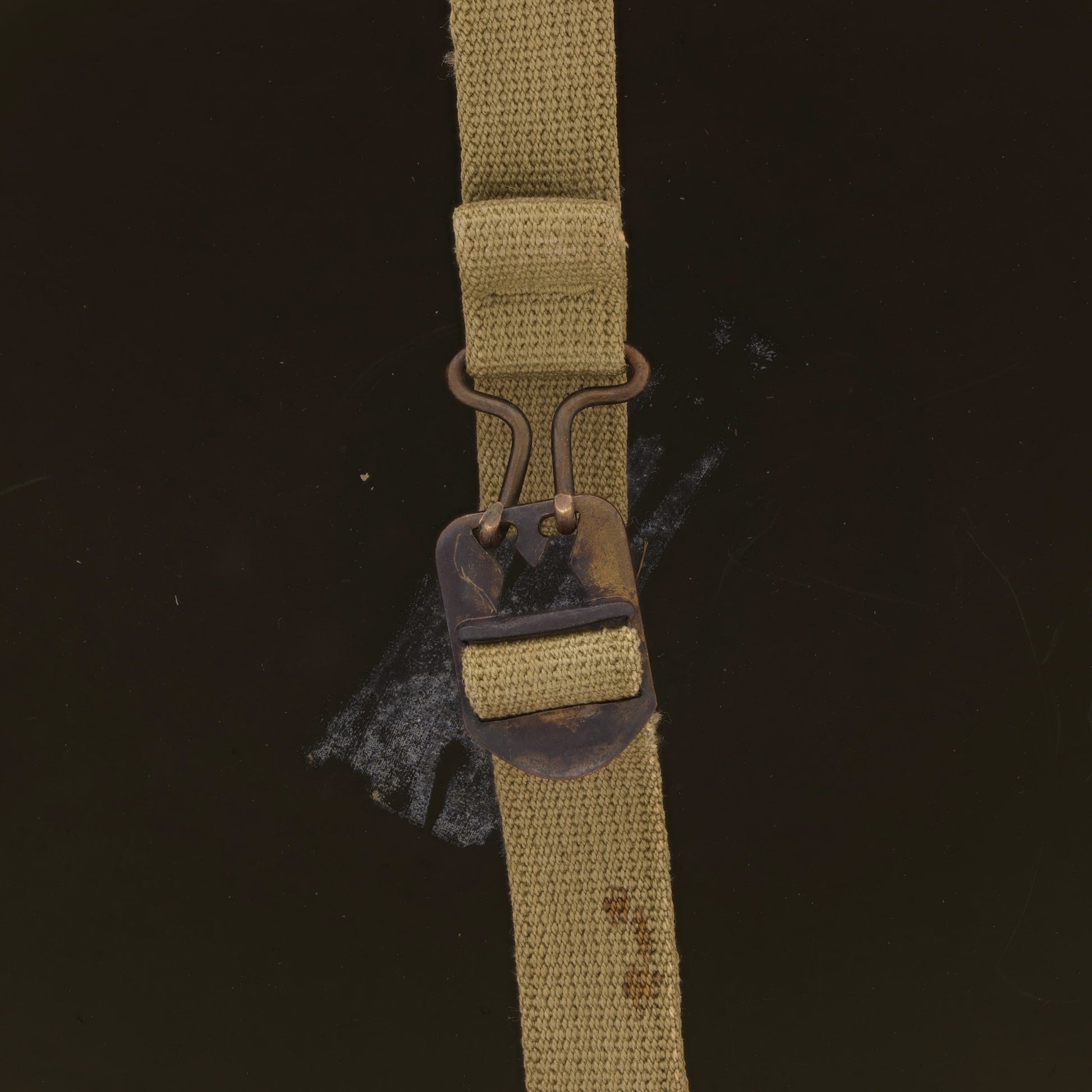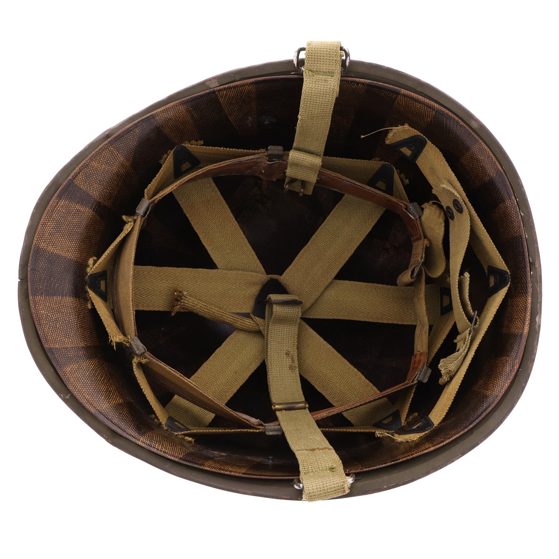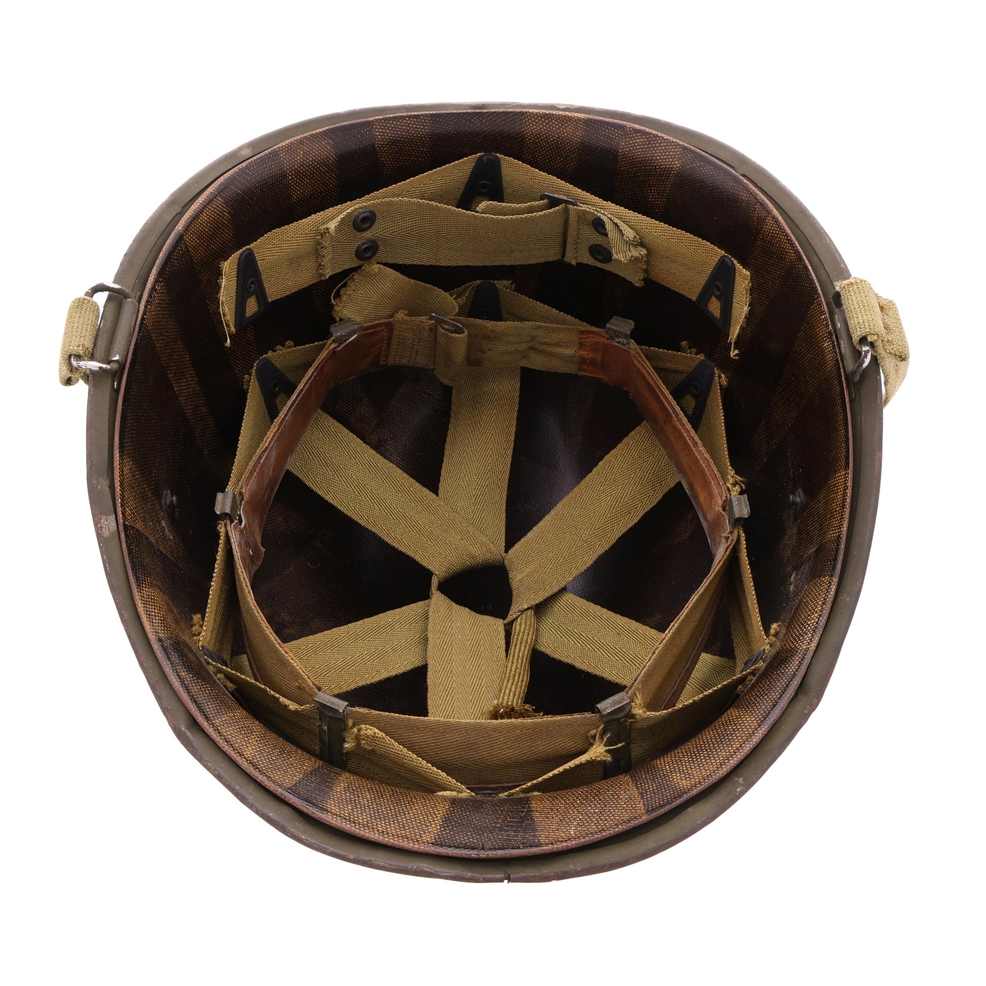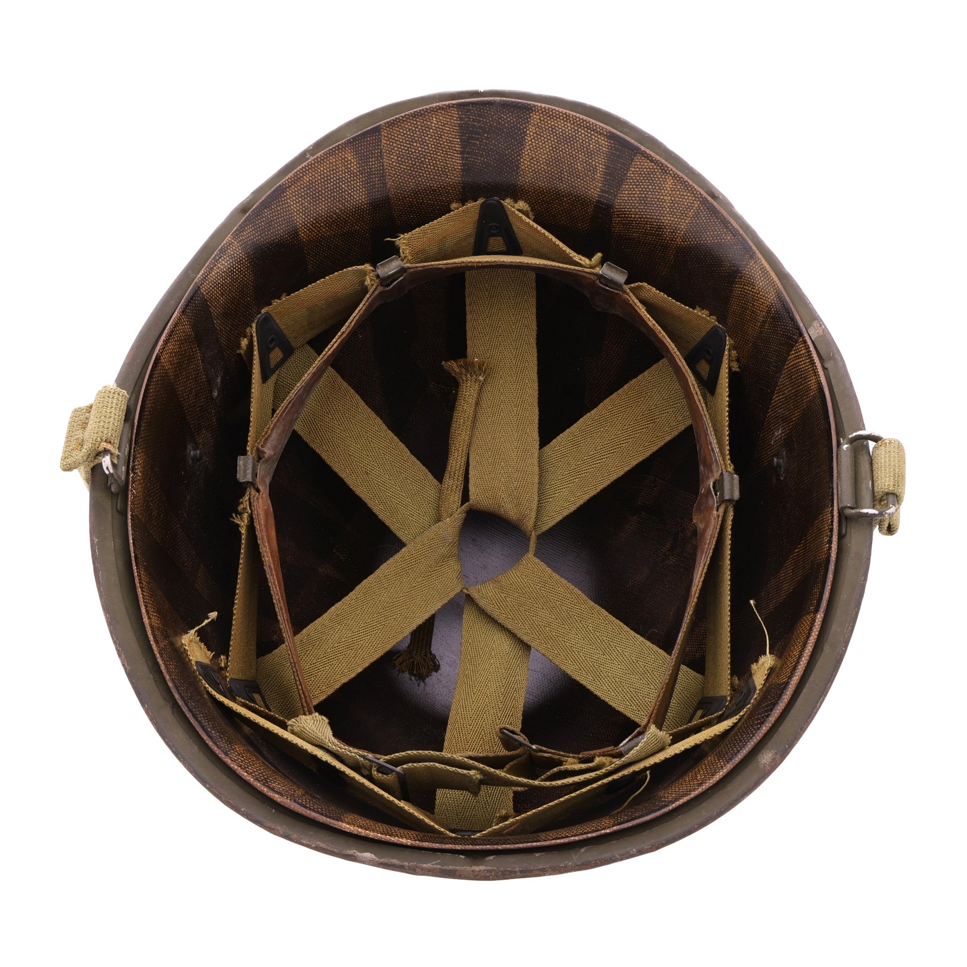 This is an original WWII U.S. M-1 helmet set. The front seam swivel loop helmet shell was manufactured by McCord Radiator & Manufacturing Co. of Detroit, Michigan and exhibits a lot number of "1017F", approximately dating its production to late-1944. The helmet retains its original olive drab factory finish, cork texture, and OD#3 (khaki) chinstraps with brass hardware and a raised bar buckle. The helmet's liner was produced by Westinghouse Electric & Manufacturing Company of Pittsburgh, Pennsylvania. It features blackened brass A-washers and an OD#3 suspension, approximately dating the liner's production from mid-1944 to 1945. The suspension comes complete with its original headband and neckband. Like the steel shell, the liner also retains its original olive drab factory finish.