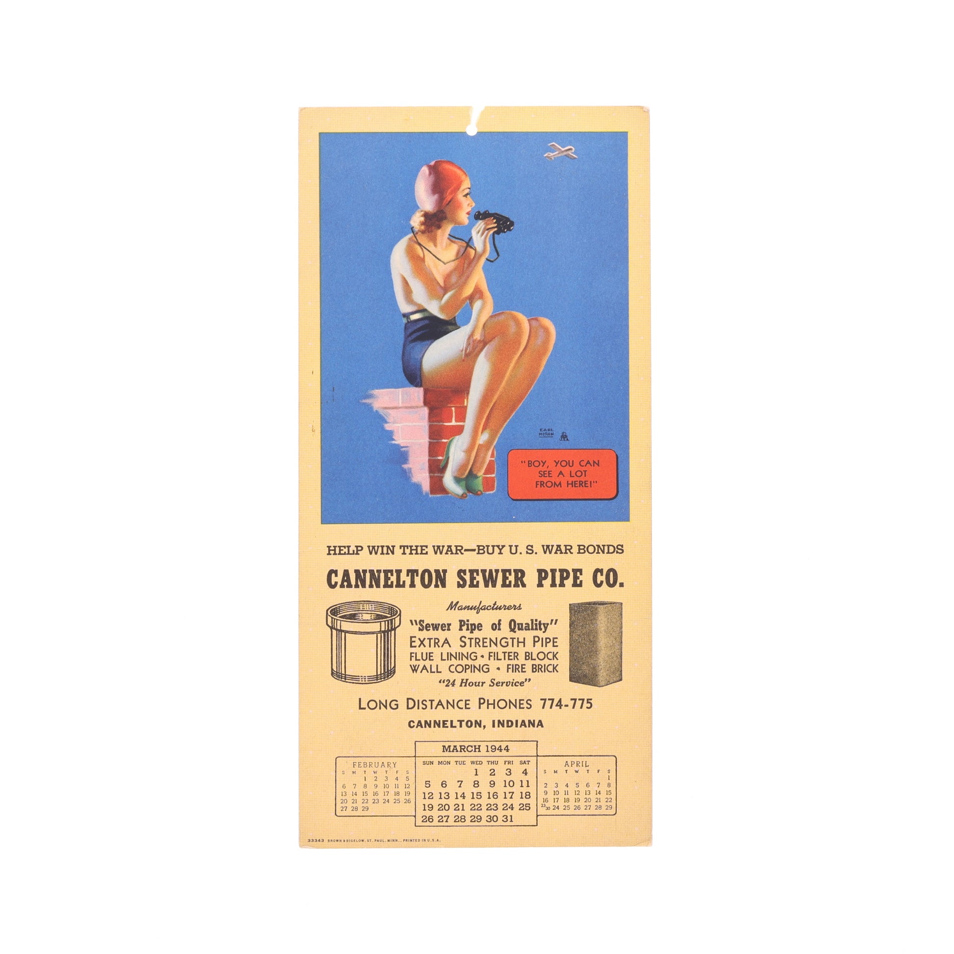 This is an original WWII U.S. pin-up girl calendar produced by Cannelton Sewer Pipe Co. of Cannelton, Indiana. Its colorful illustration depicts a young brunette swimsuit model above an advertisement for U.S. war bonds. The calendar covers February, March and April of 1944. It is constructed of cardstock and measures approximately 4.75 inches wide and 10 inches tall.