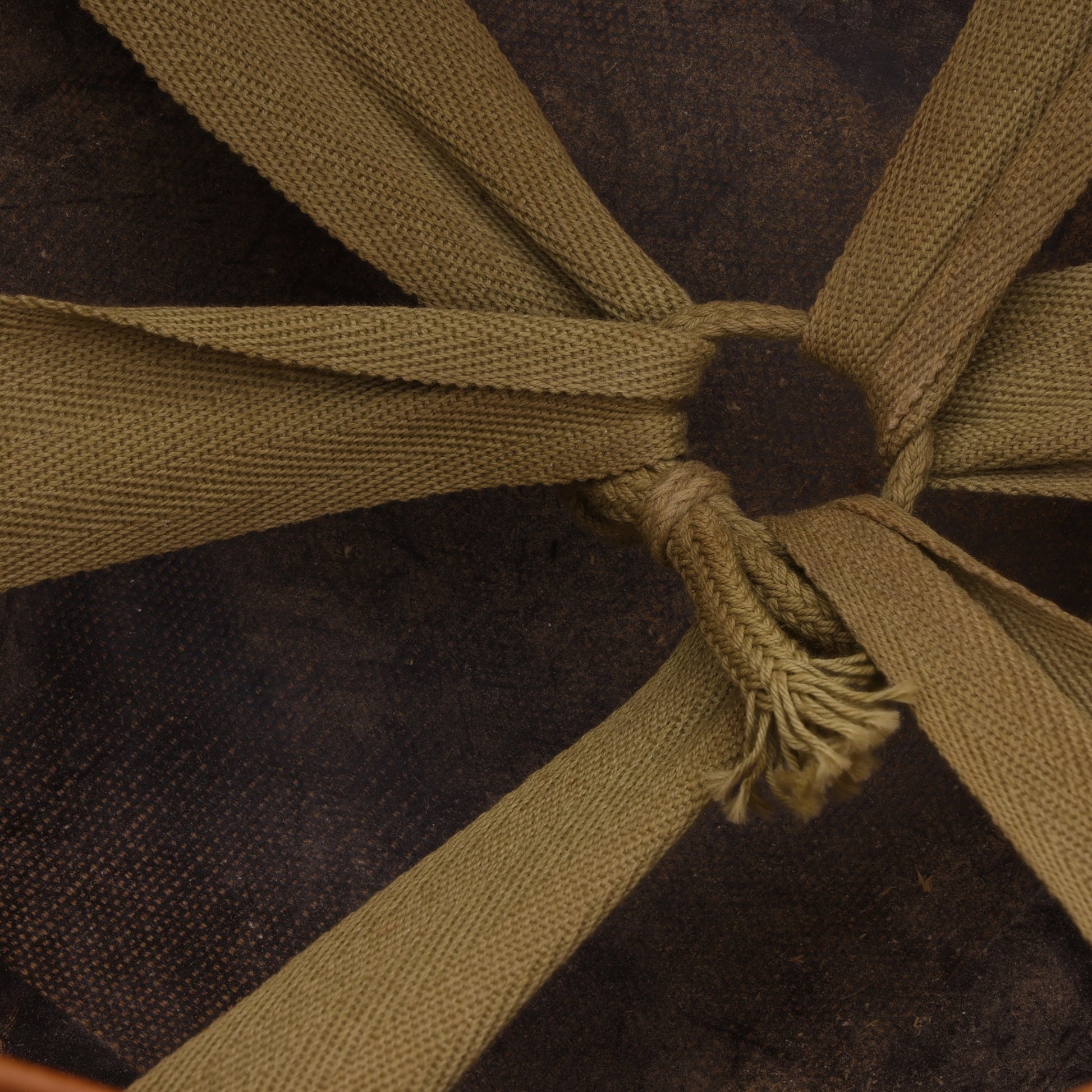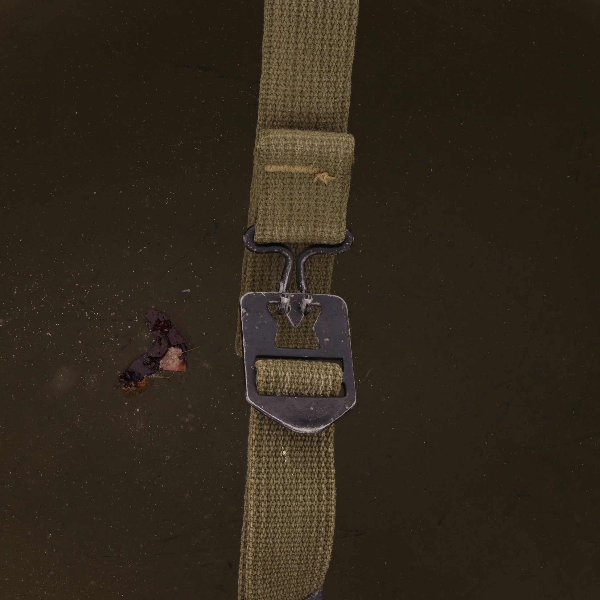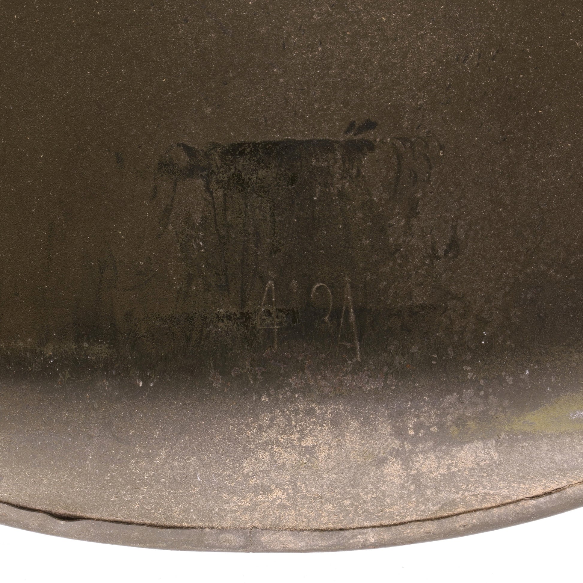 This is an original WWII U.S. M-1 helmet set. The front seam swivel loop helmet shell was manufactured by Schlueter Manufacturing Co. of St. Louis, Missouri and exhibits a lot number of "413A", approximately dating its production to late-1944. The helmet retains its original olive drab factory finish, cork texture, and OD#7 (green) chinstraps with steel hardware. The helmet's liner was produced by Westinghouse Electric & Manufacturing Company of Pittsburgh, Pennsylvania. It features blackened brass A-washers and an OD#3 (khaki) suspension, approximately dating the liner's production from mid-1944 to 1945. The suspension comes complete with its original headband, neckband, and blackened brass buckled leather chinstrap. The liner's exterior retains its original olive drab factory finish.