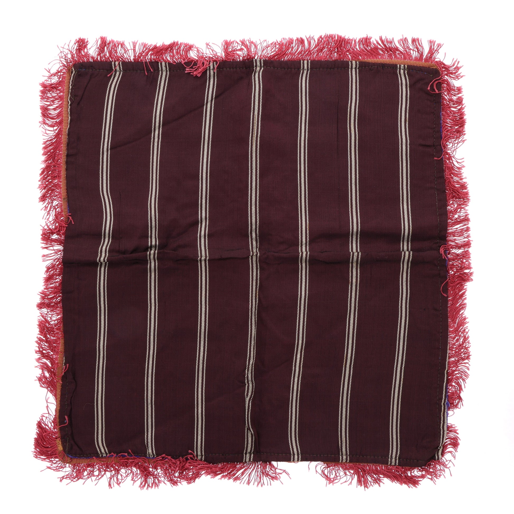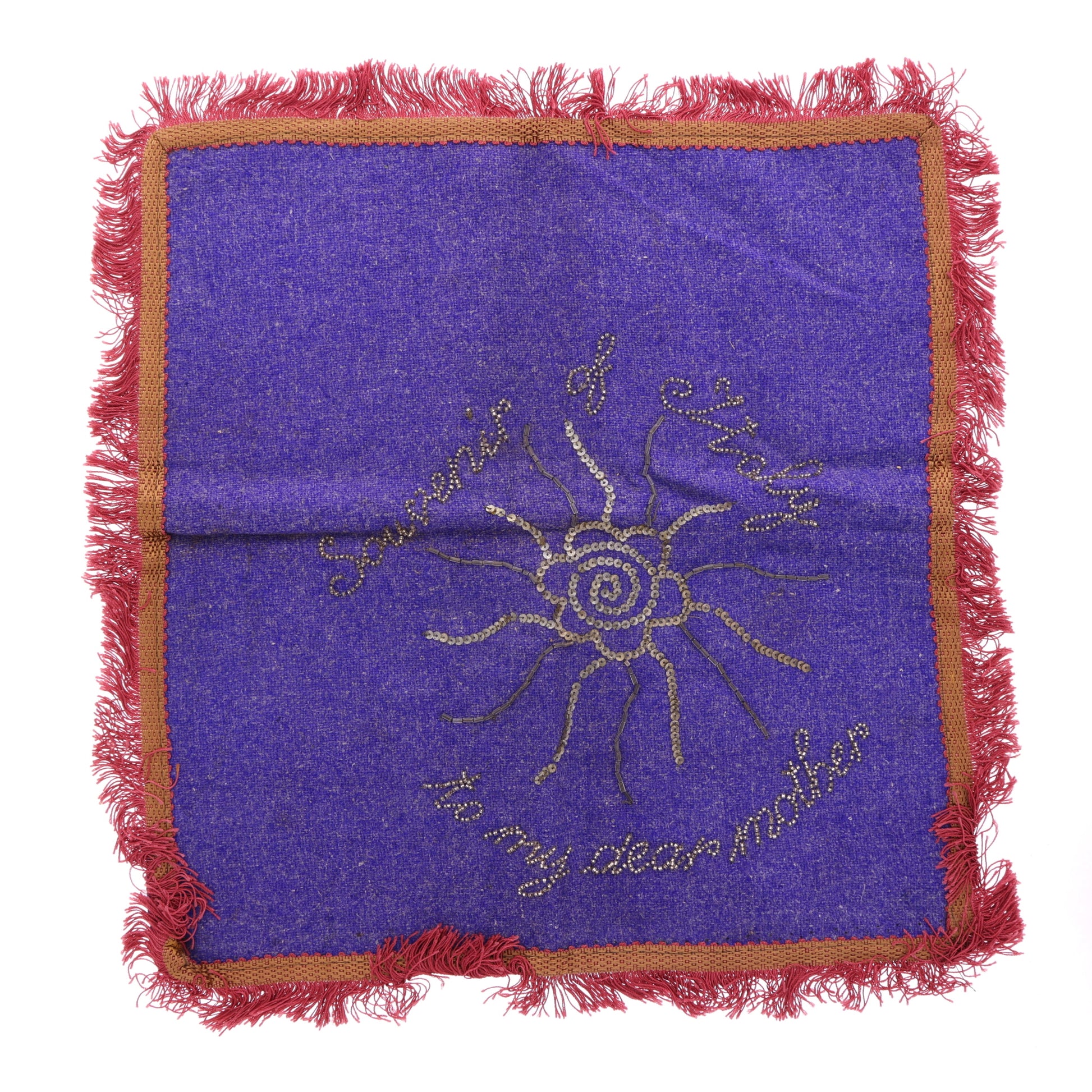 This original WWII Italian-made pillowcase was marketed to U.S. servicemen in Italy for their mothers back home. Surrounding a flower in sequences is the phrase "Souvenir of Italy to my dear mother", stitched in silver beads atop the purple fabric. The pillowcase's reverse is constructed of a burgundy and white striped silk. It is bordered in a red fringe. This pillowcase measures approximately 17 inches wide and 17 inches tall overall.