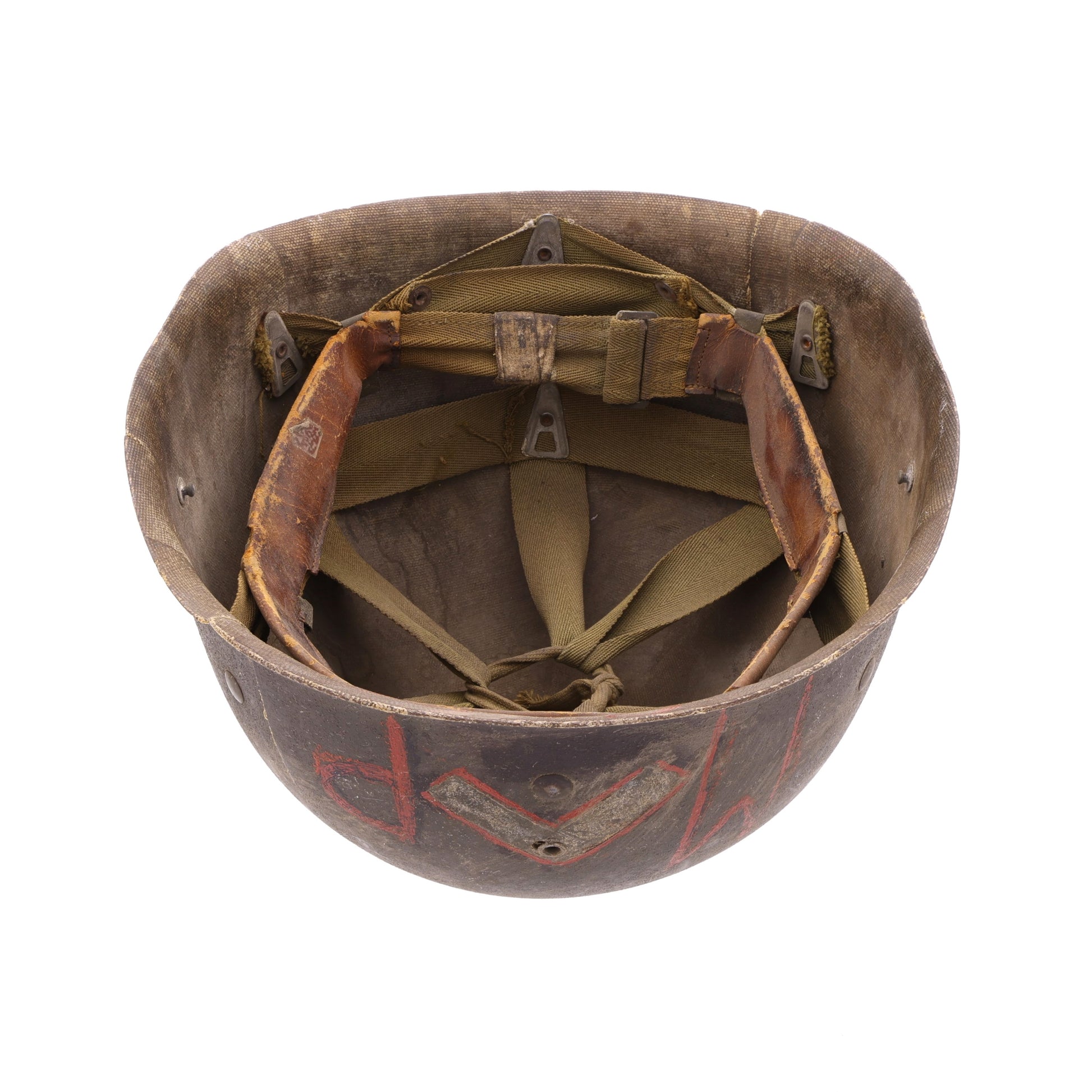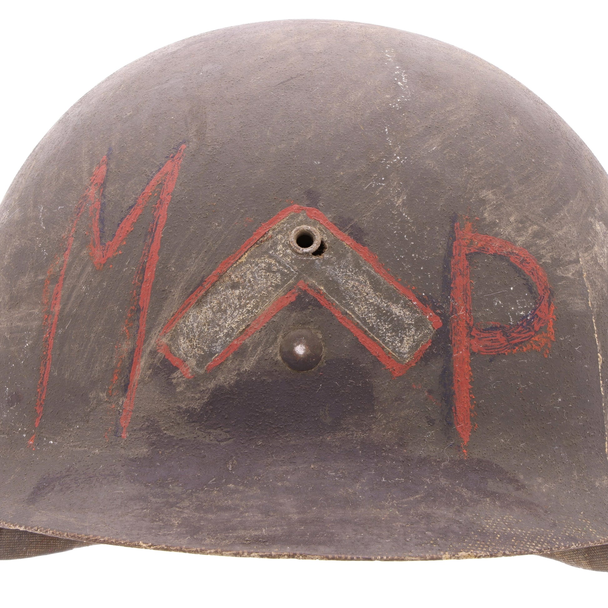 WWII U.S. St. Clair M-1 Helmet Liner with Painted Military Police Insignia & Pvt.'s Rank (1942)