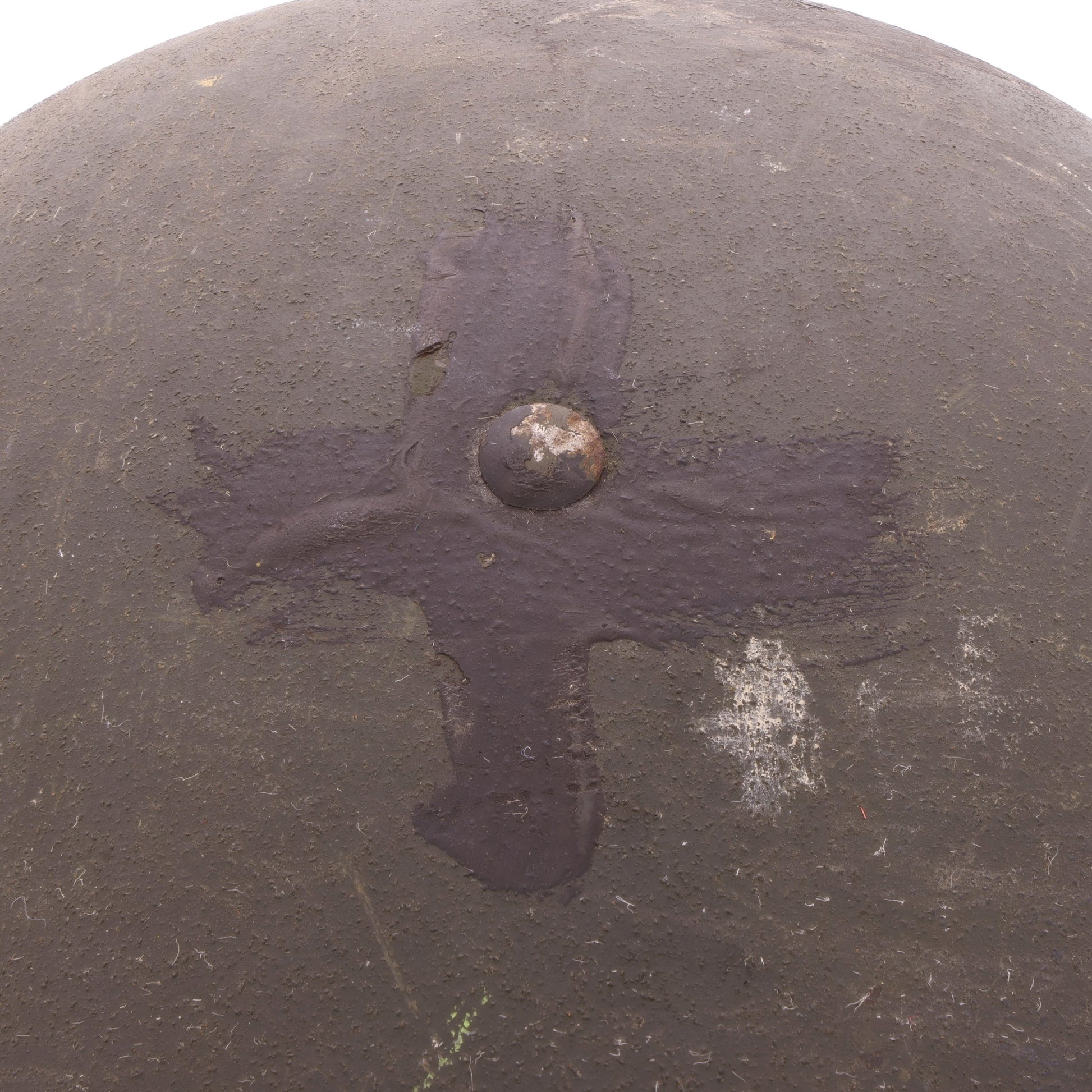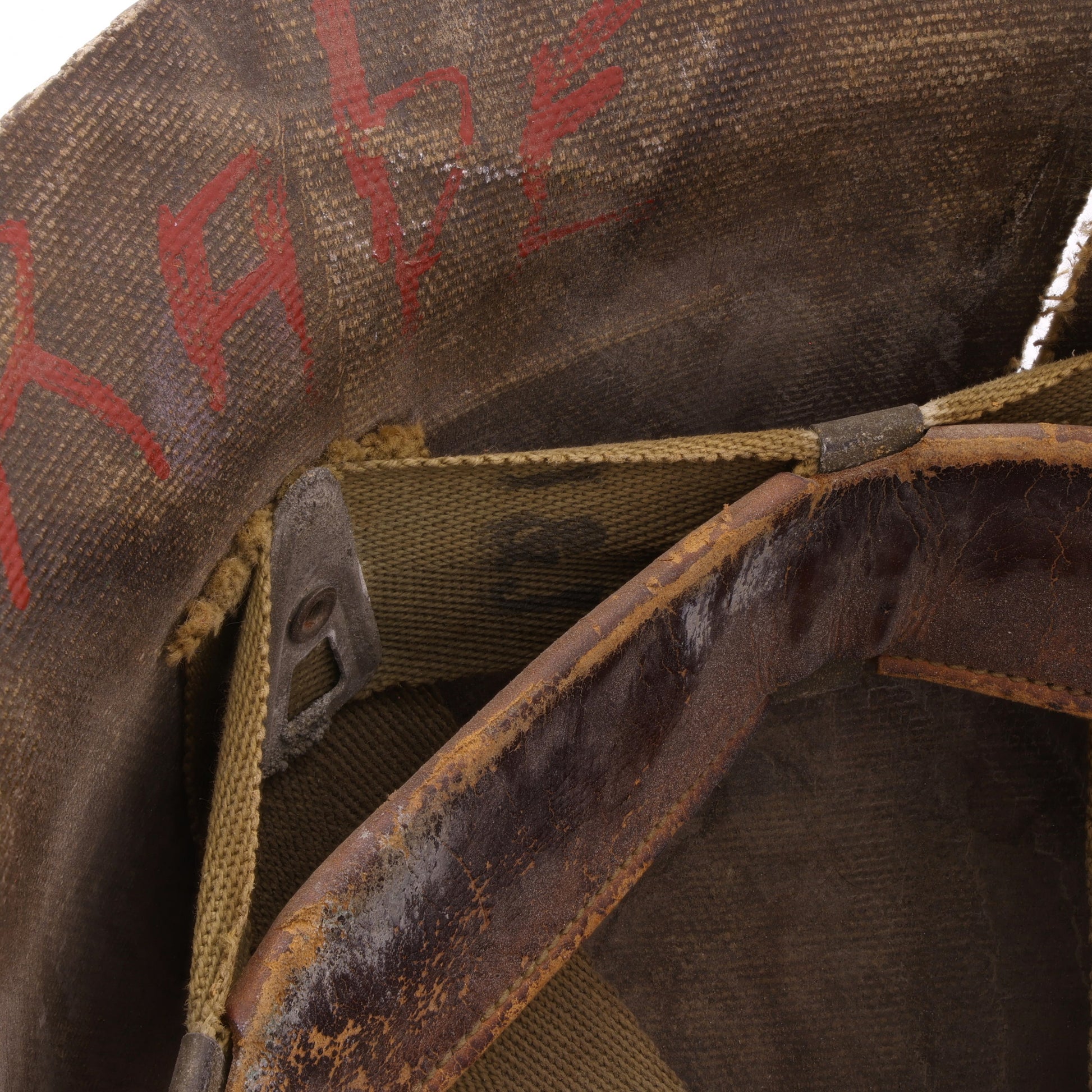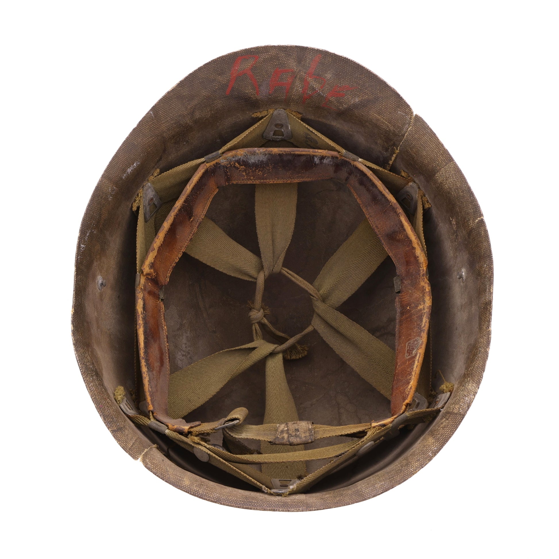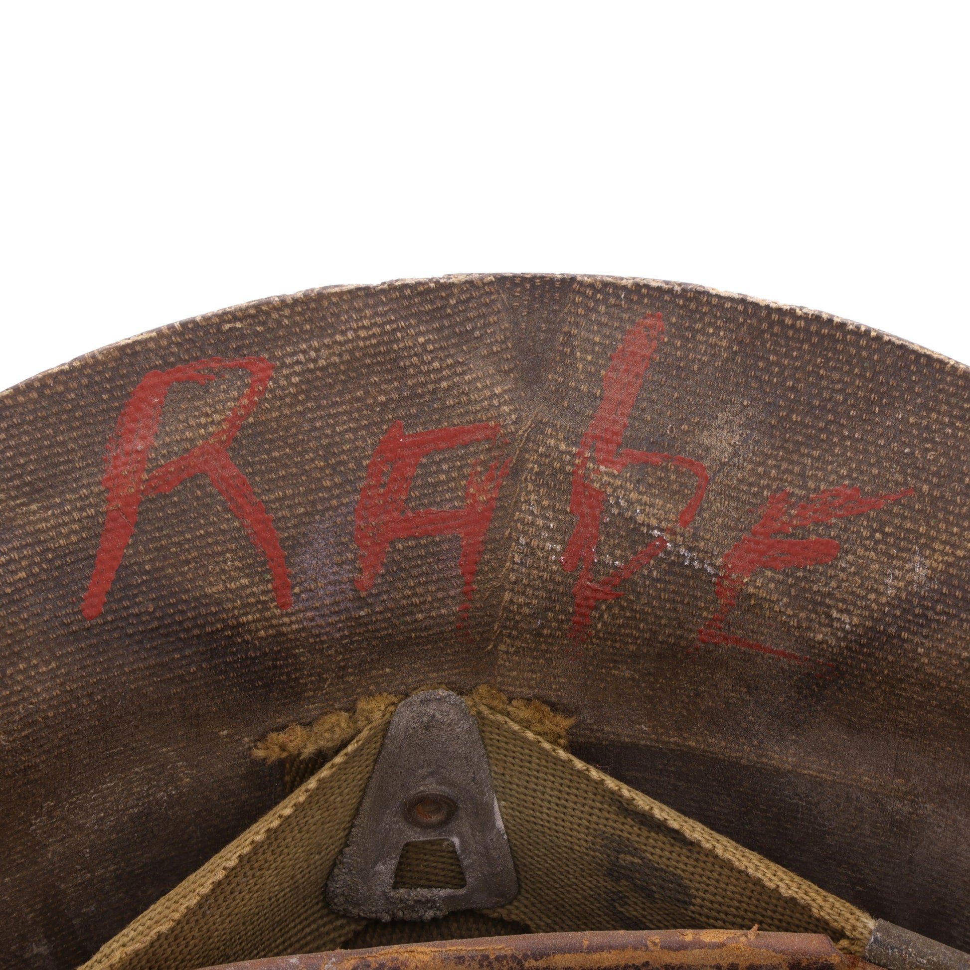 This original WWII U.S. M-1 helmet liner showcases original hand painted insignia of a private in the military police. Additionally, painted on the rear of the liner is a small black cross. Hastily painted insignia is sometimes mistaken for being post-war applied; however, we do not believe that to be the case with this liner. It was produced by St. Clair Rubber Company of Marysville, Michigan. It features non-painted steel A-washers and a Johnson & Johnson manufactured OD#3 (khaki) suspension. The suspension comes complete with its original headband and neckband. The headband has been secured in place with the use of original medical tape. The original owner's name, "Rabe", is painted on the interior visor in the same red paint as the exterior markings. The liner's exterior retains its original textured olive drab factory finish with non-textured rivet heads - a combination only seen on these low-pressure liners produced during a very short period in late 1942.
