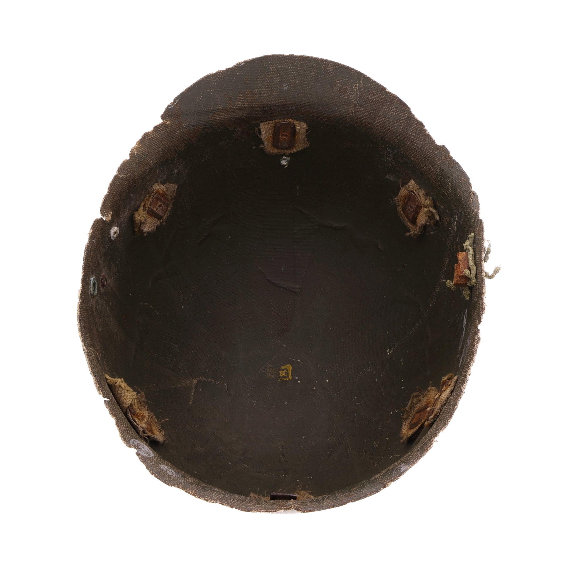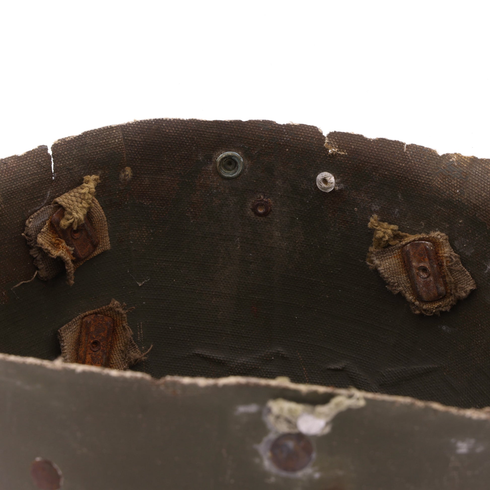 This is an original and exceedingly rare WWII U.S. M-2 "D-bail" paratrooper helmet liner. It was produced by St. Clair Rubber Company of Marysville, Michigan. Interestingly, Westinghouse was the only company that provided ready-to-use paratrooper helmet liners during the war; "an extremely limited number of St. Clair liners" began their lives as infantry models and were later converted by the McCord Radiator & Manufacturing Co. of Detroit, Michigan prior to being issued (Oosterman, 218). Unfortunately, this liner's rayon suspension is completely missing and its factory installed A-yokes have been severed, however remnants are still visible beneath the non-painted steel rectangular washers. These features, in combination with the nickel-plated brass sockets that accommodate the corresponding snaps on a paratrooper helmet shell's chinstrap, approximately date the liner's production to mid-1942. Interestingly, a set of pop rivets were added to its sides to attach a field-improvised chinstrap likely after its stationary leather chinstrap broke. Attached to these pop rivets are remnants of a British-made camouflage helmet net. The exterior retains its original olive drab factory finish. This liner will display quite nicely when paired with an M-2 "D-bail" helmet.