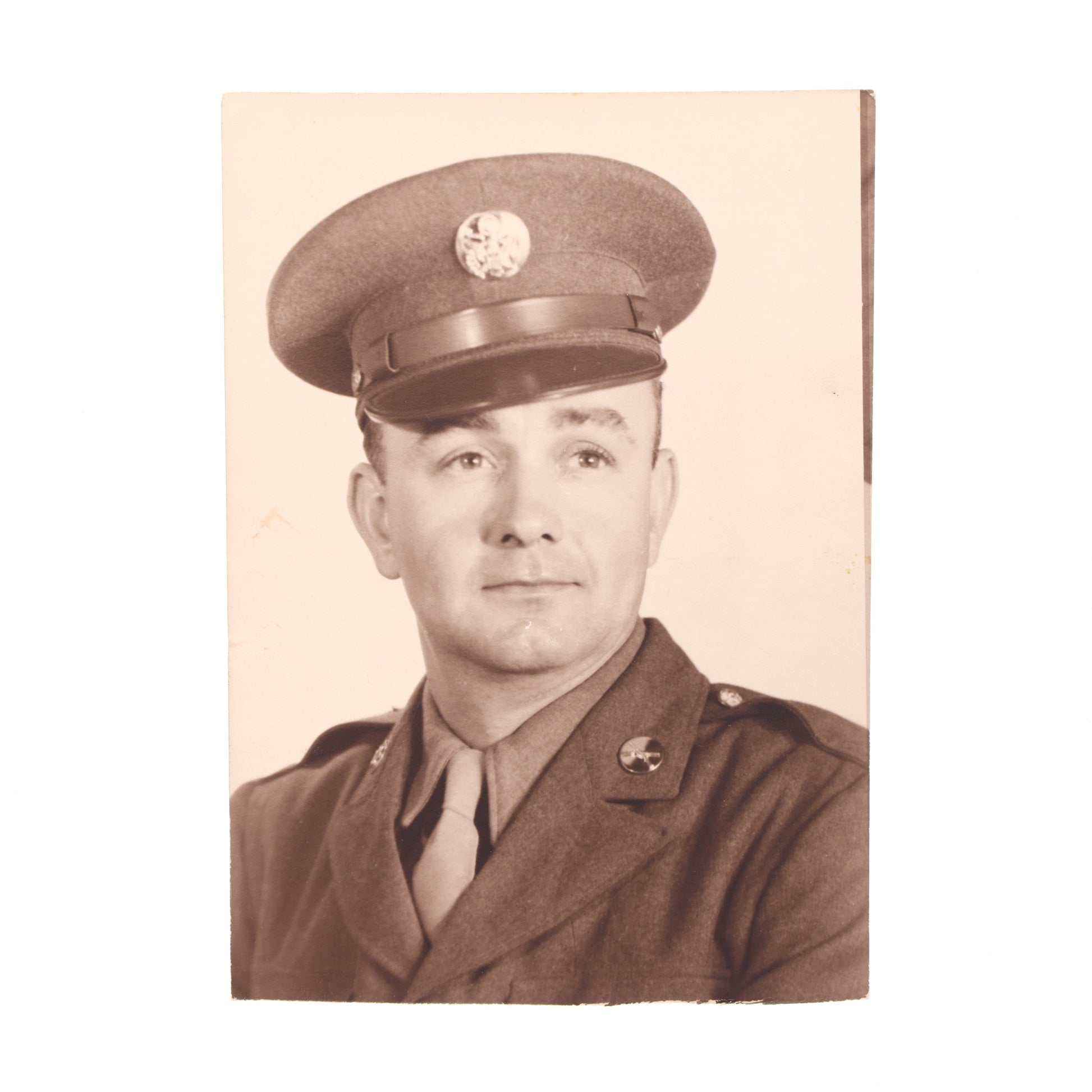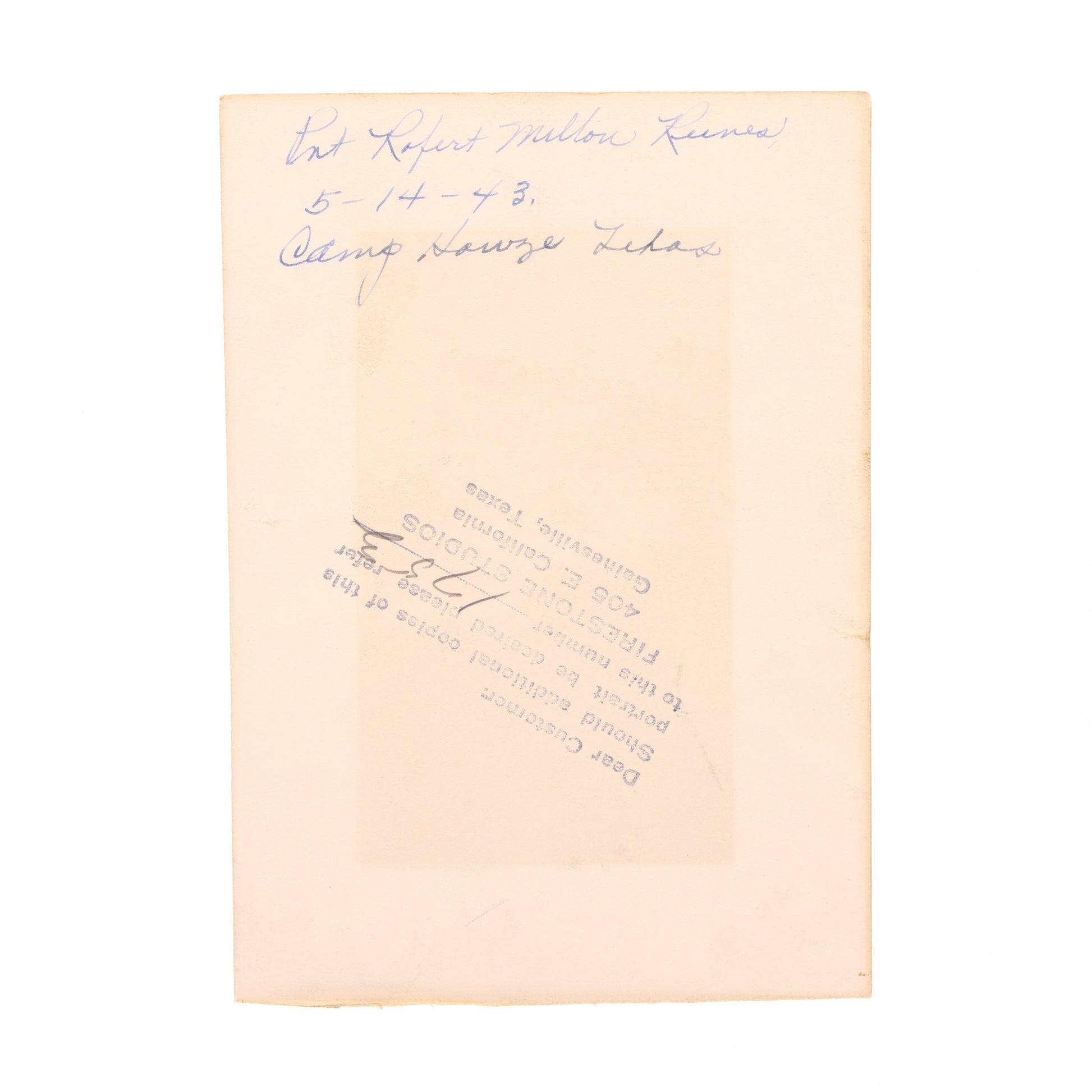 This original WWII U.S. studio photograph captures Private Robert Milton Reeves in his Army dress uniform. Atop his head is the standard enlisted man's service cap and affixed to his jacket are infantry collar discs. Interestingly, the photograph's reverse shows it was taken on May 14, 1943, while Pvt. Reeves was based at Camp Howze of Gainesville, Texas. Camp Howze was both an infantry training facility and prisoner of war camp for captured German soldiers. The image was developed by Firestone Studios, of 405 E. California St., Gainesville, Texas. The photograph measures approximately 5 inches wide and 7 inches tall.
