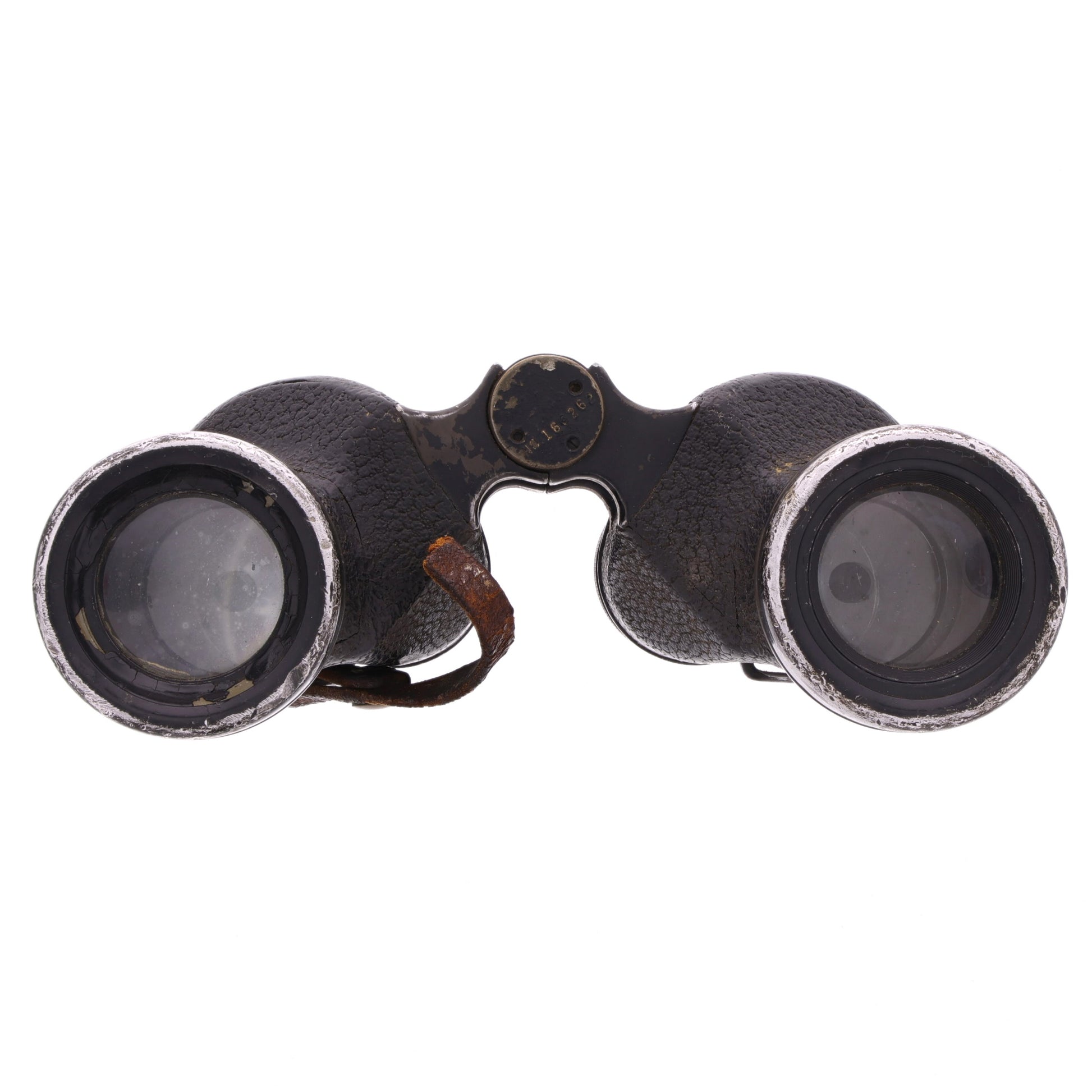 These binoculars are in good, used condition. The optics show some debris, the imitation leather covering is cracked, and the coating on the user's right objective lens bezel is chipped.