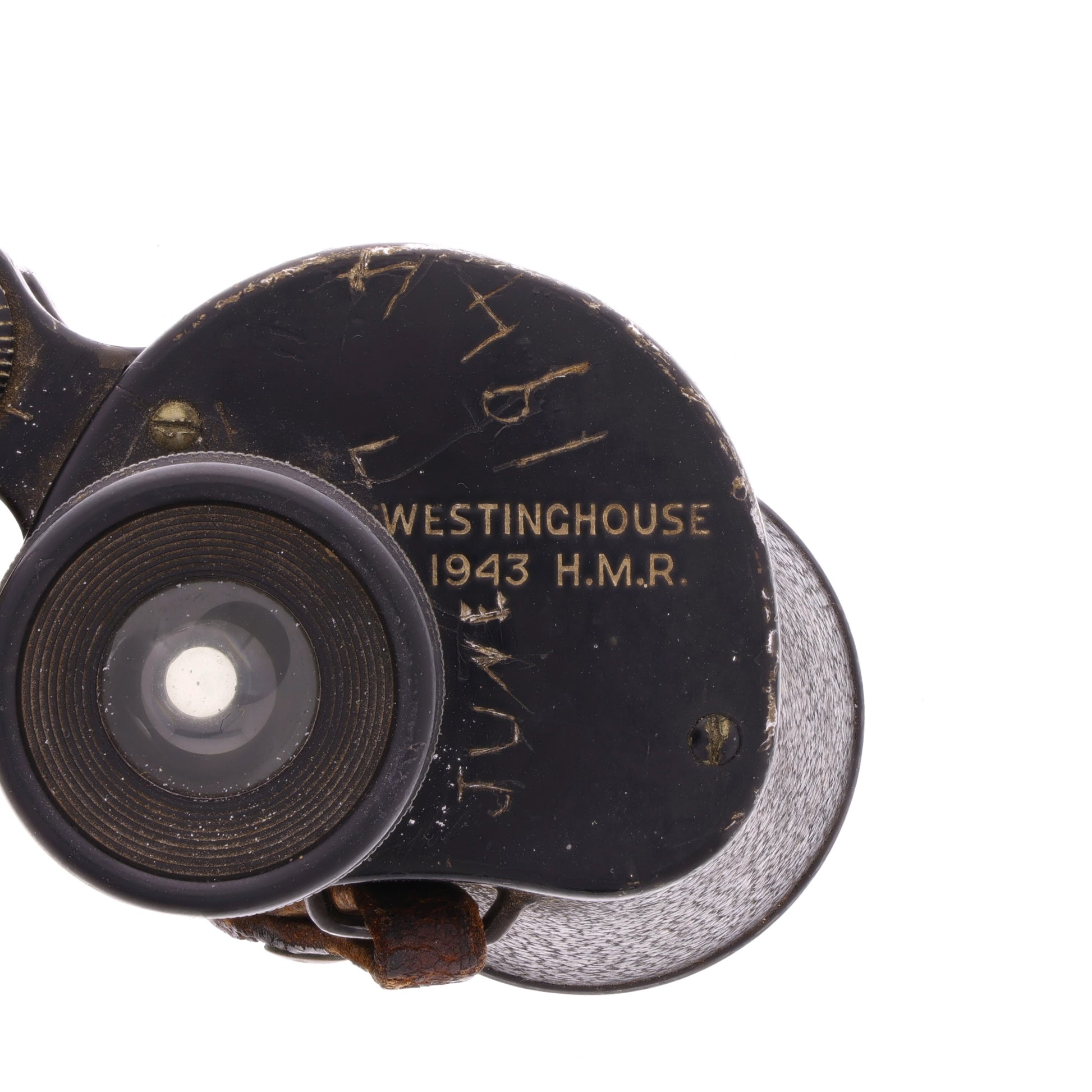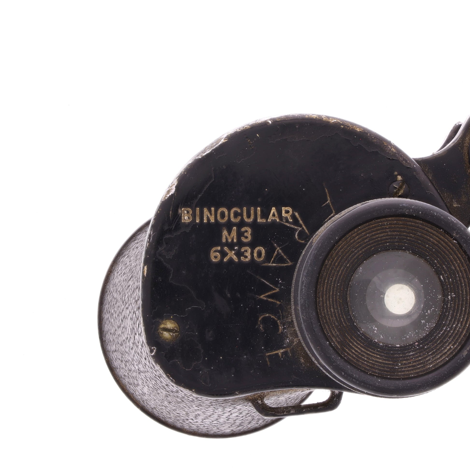 This is an original pair of WWII U.S. M3 6x30 binoculars. These binoculars were produced in 1943 by Westinghouse Electric & Manufacturing Company of Pittsburgh, Pennsylvania, and are marked "BINOCULAR, M3, 6X30" and "WESTINGHOUSE, 1943 H.M.R.", along with the serial number of "No. 166262". The "H.M.R." marking is believed to denote "High Moisture Resistance". In addition to their factory markings, their original owner etched into the surface a D-Day+1 inscription: "FRANCE" and "JUNE 7, 1944". Still attached are remnants of its original leather carrying strap.