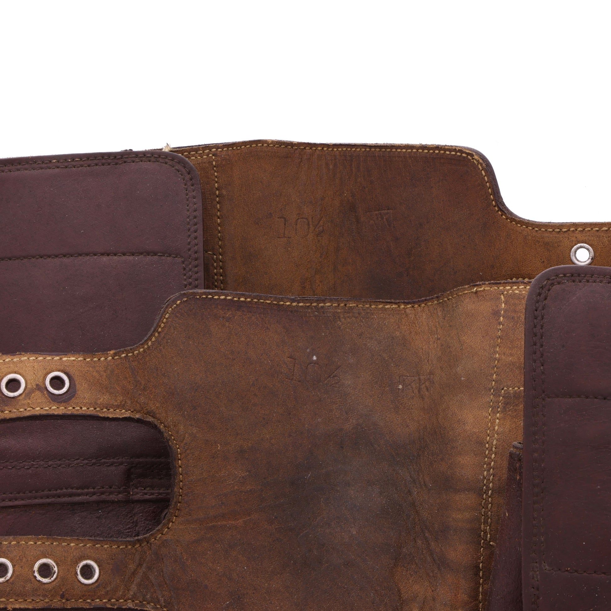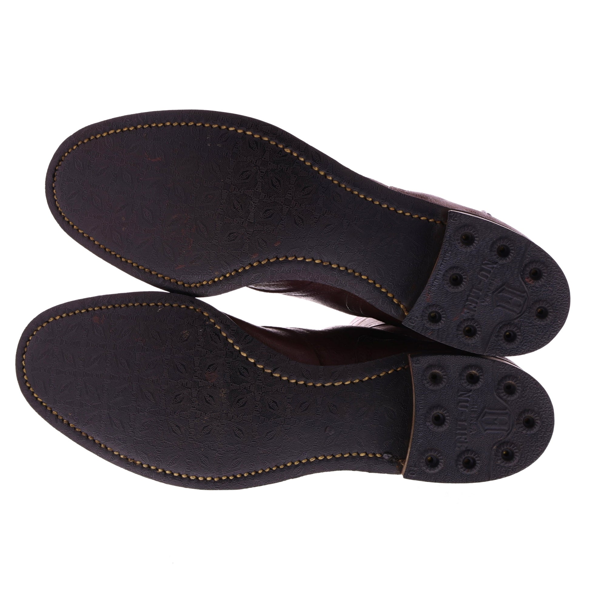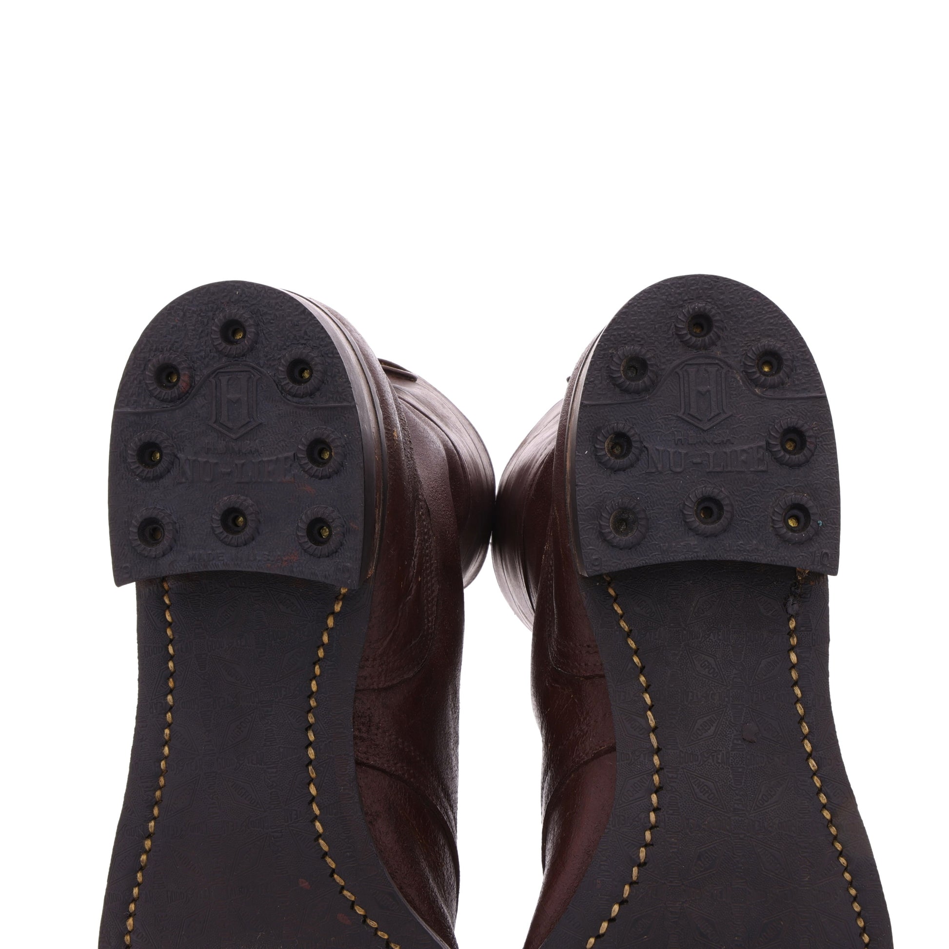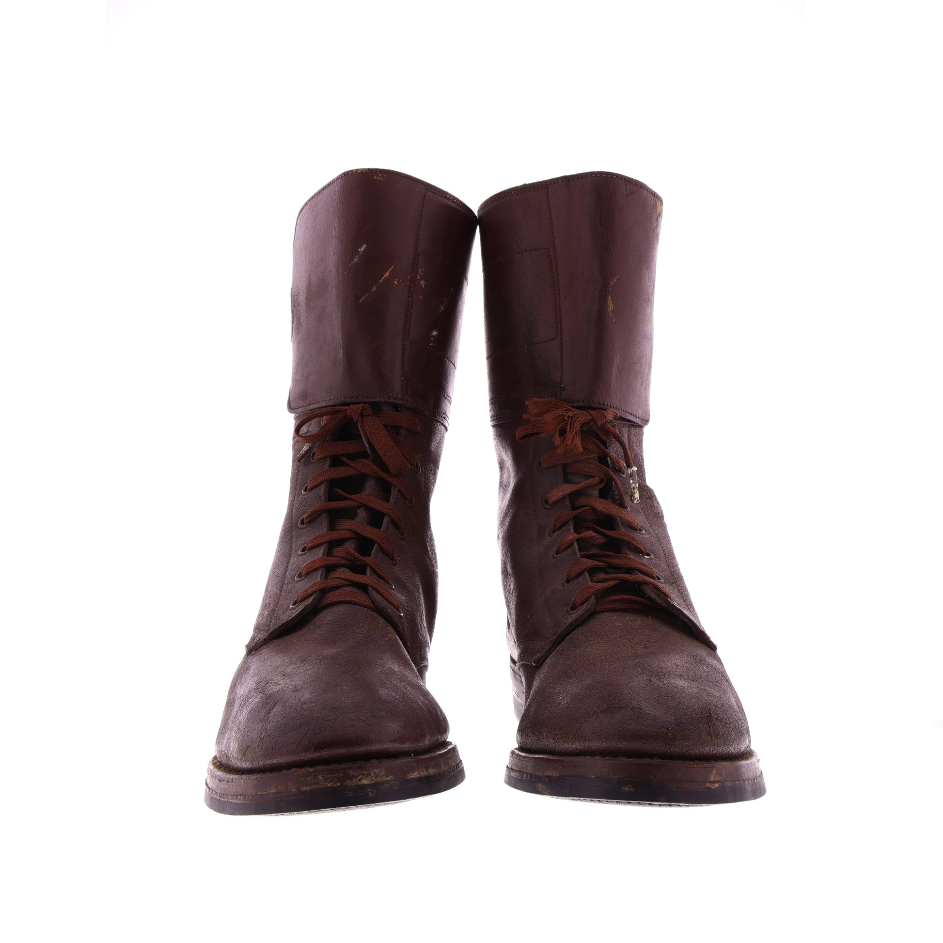 This is an original pair of WWII U.S. Women's Army Corps (WAC) or nurse's M-1943 double buckle boots in size 10.5. Next to their size stamping, the leather is embossed "KK". They exhibit Nu-Life marked heels, with Goodyear Tire & Rubber Company's Wingfoot branded soles.