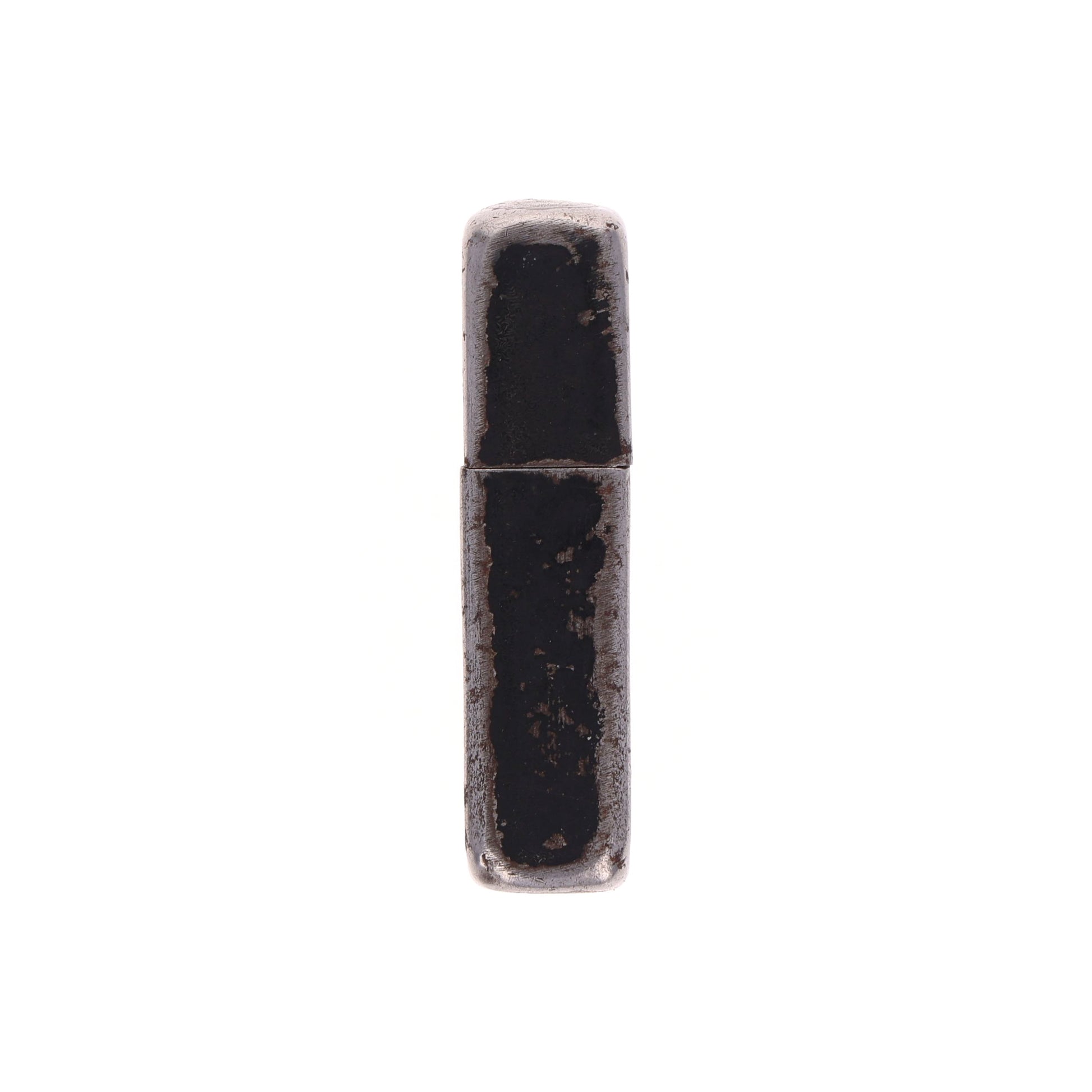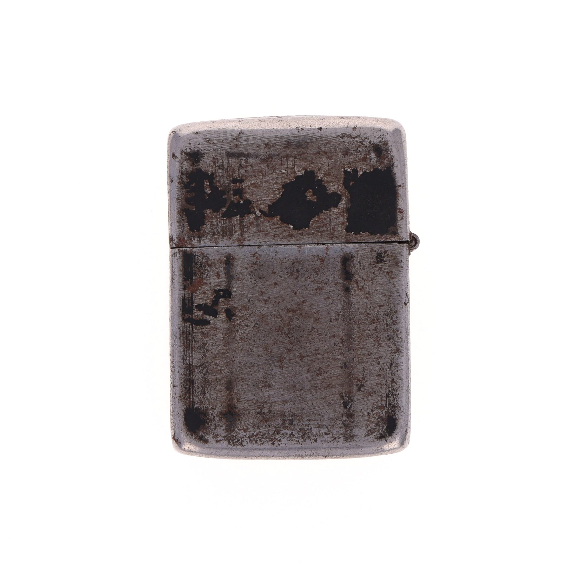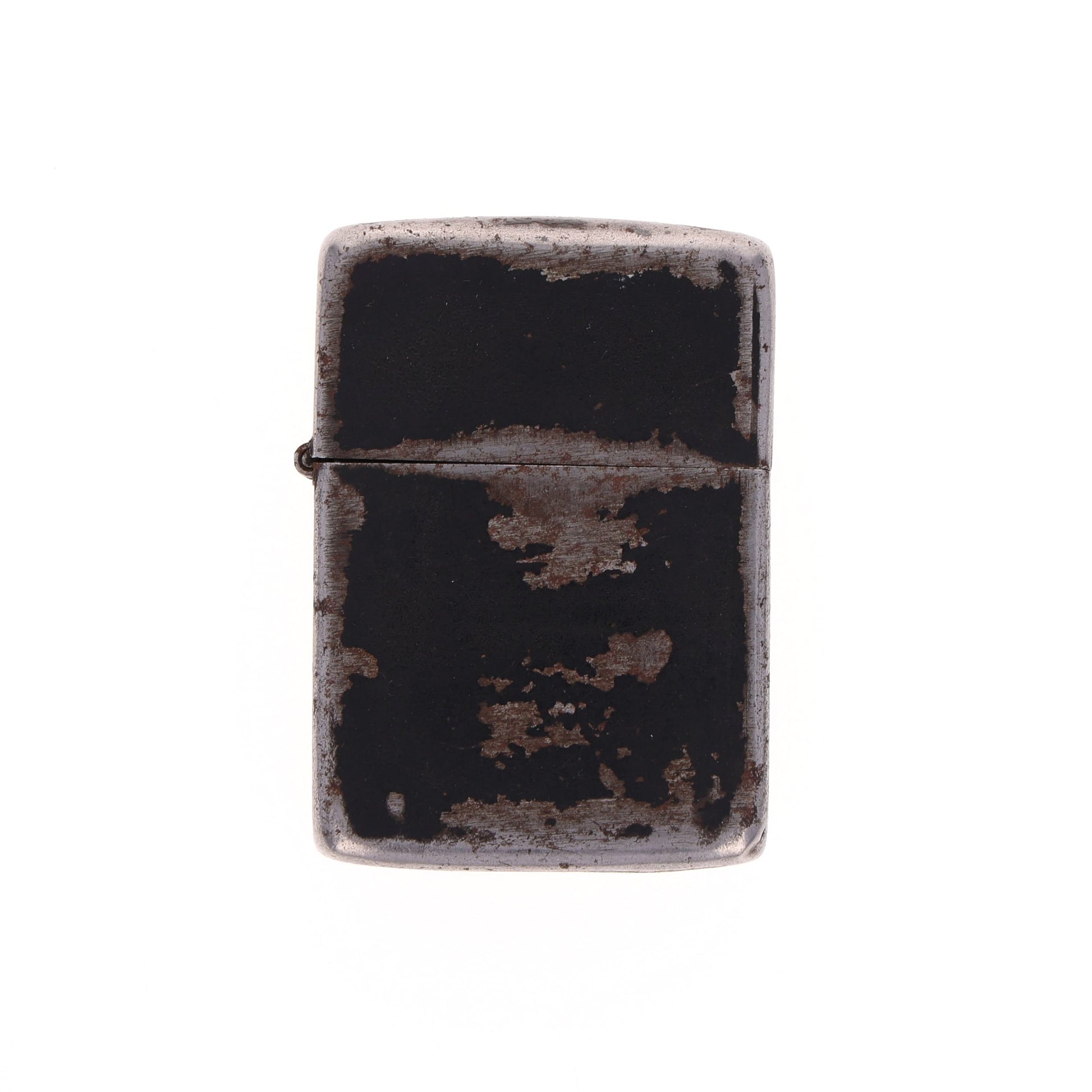 This original WWII "Windproof" lighter was produced by Zippo Manufacturing Co. in Bradford, Pennsylvania. The case markings are somewhat concealed underneath the original black crackle finish. Zippo manufactured two main varieties of black crackle finish lighters during the war. This particular example, with a three-barrel hinge, 14-hole chimney, rounded bottom, and "PAT. 2032695" insert stamp, denotes wartime production ranging from 1943 to 1945.