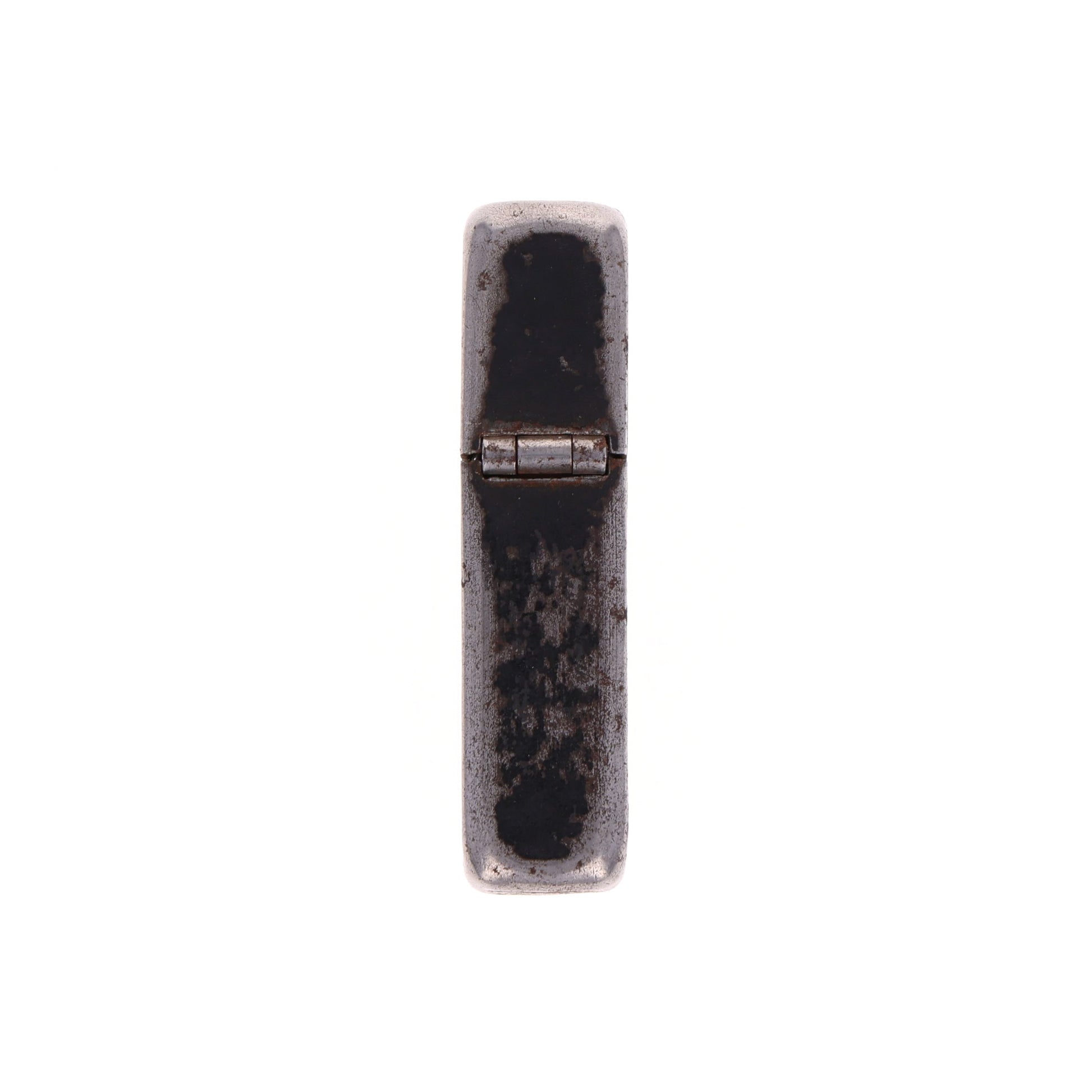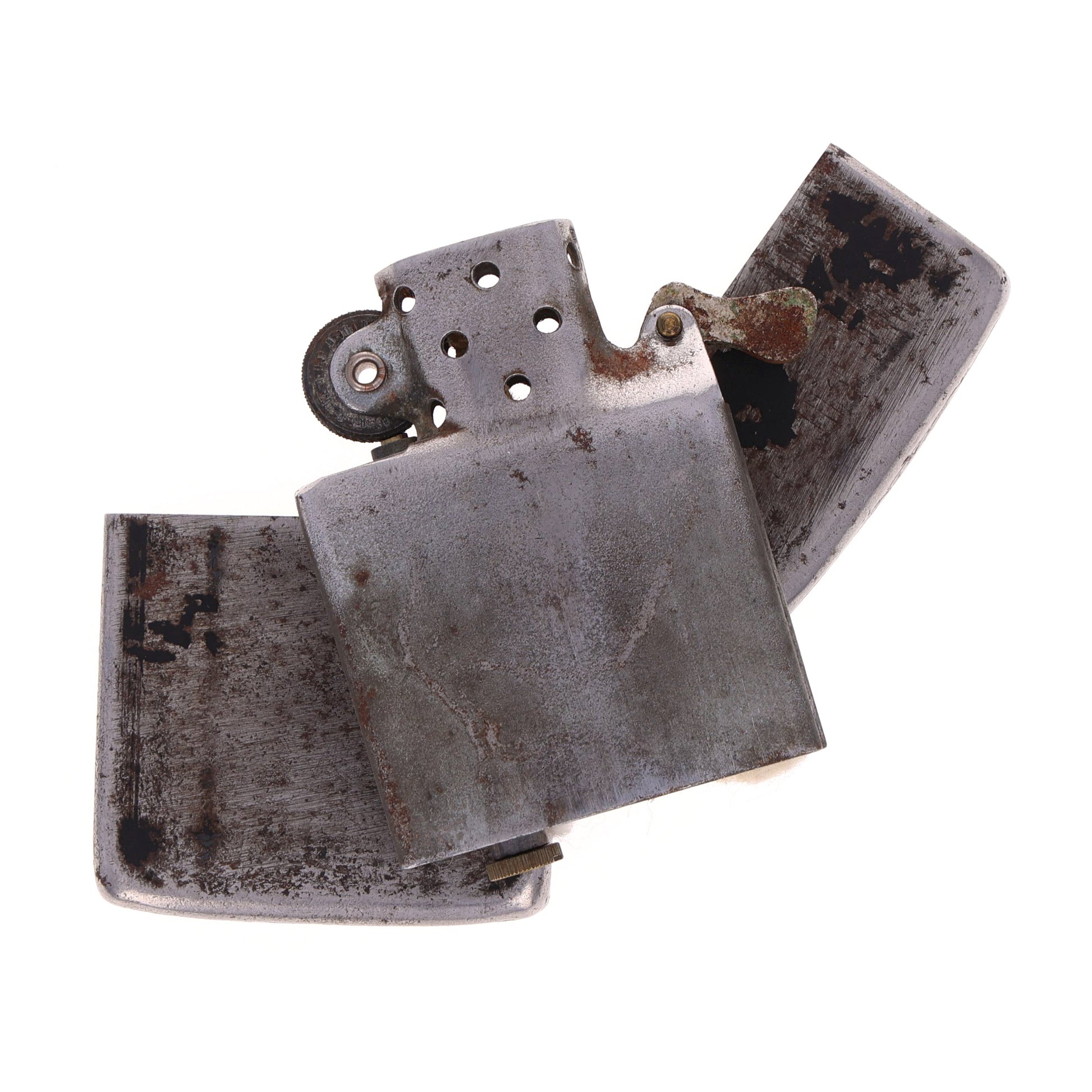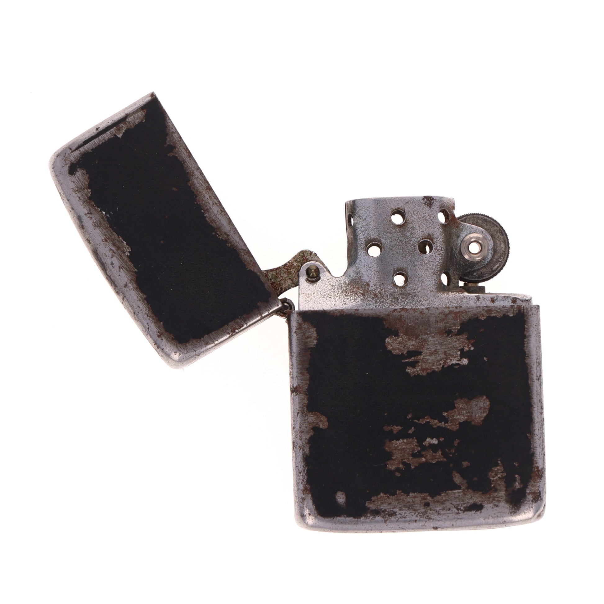 The factory finish is heavily worn on one side; however, the hinge still opens and closes without issue. This lighter will require a flint and fluid to function.