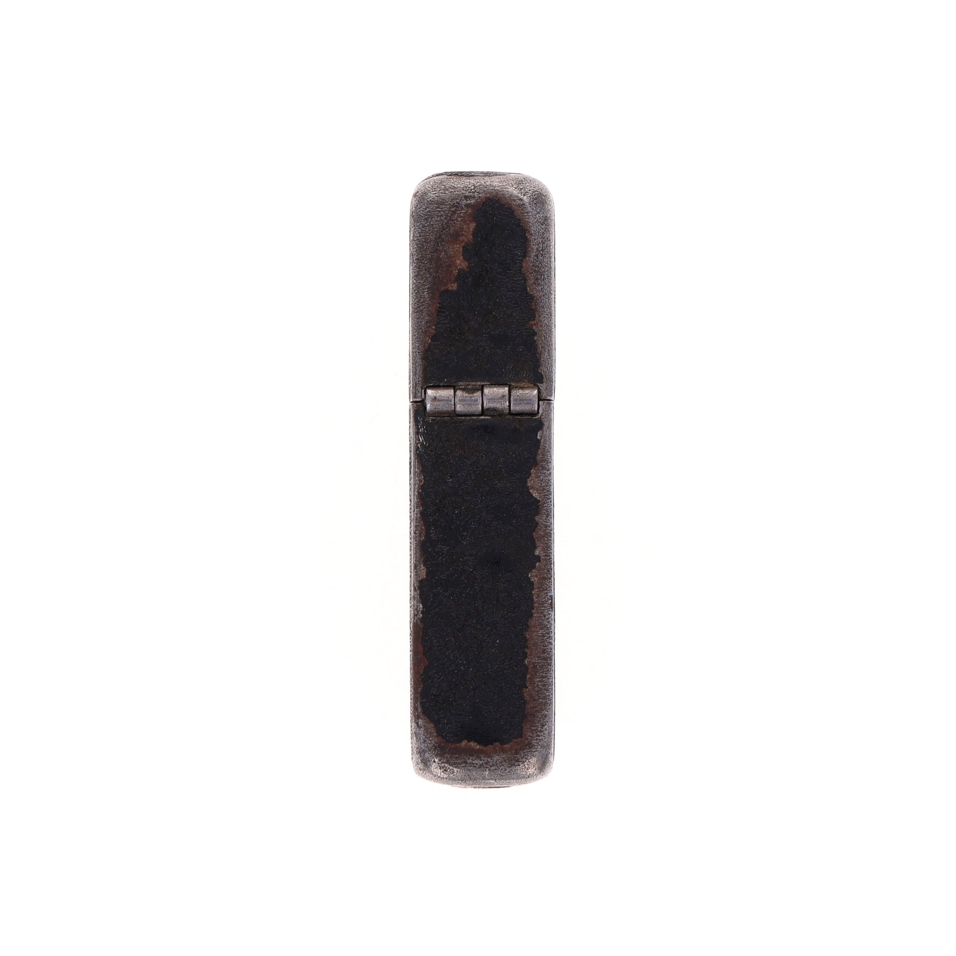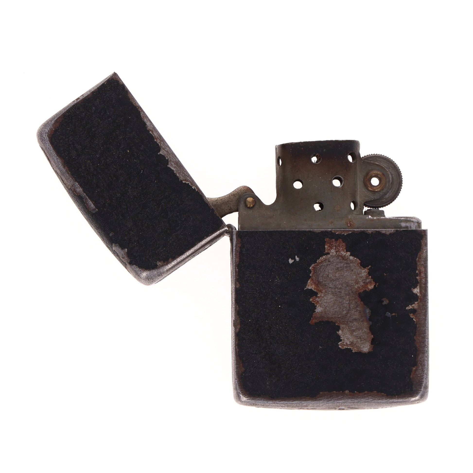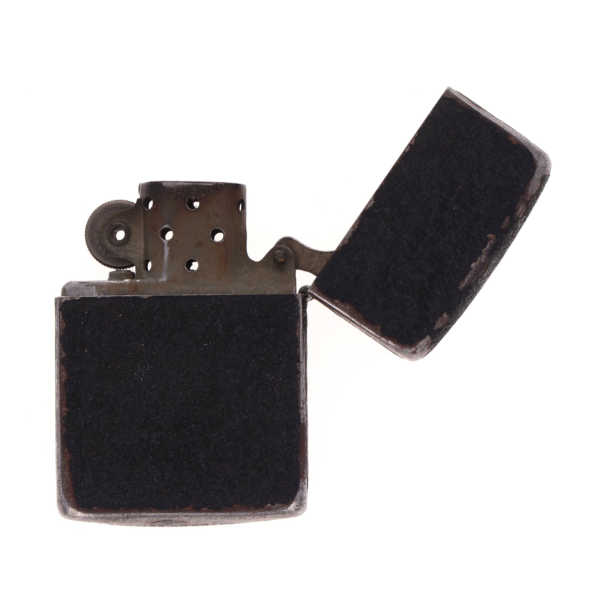 This original WWII "Windproof" lighter was produced by Zippo Manufacturing Co. in Bradford, Pennsylvania. The case markings are just visible underneath the original black crackle finish. Zippo manufactured two main varieties of black crackle finish lighters during the war. This particular example is the earlier and far rarer variation. With a four-barrel hinge, 14-hole chimney, rounded bottom, and "PAT. 2032695" insert stamp, it dates to 1942.
