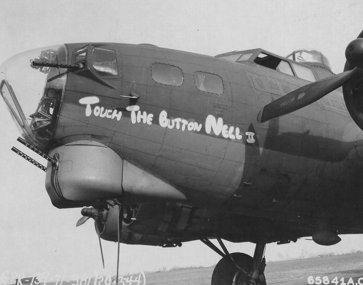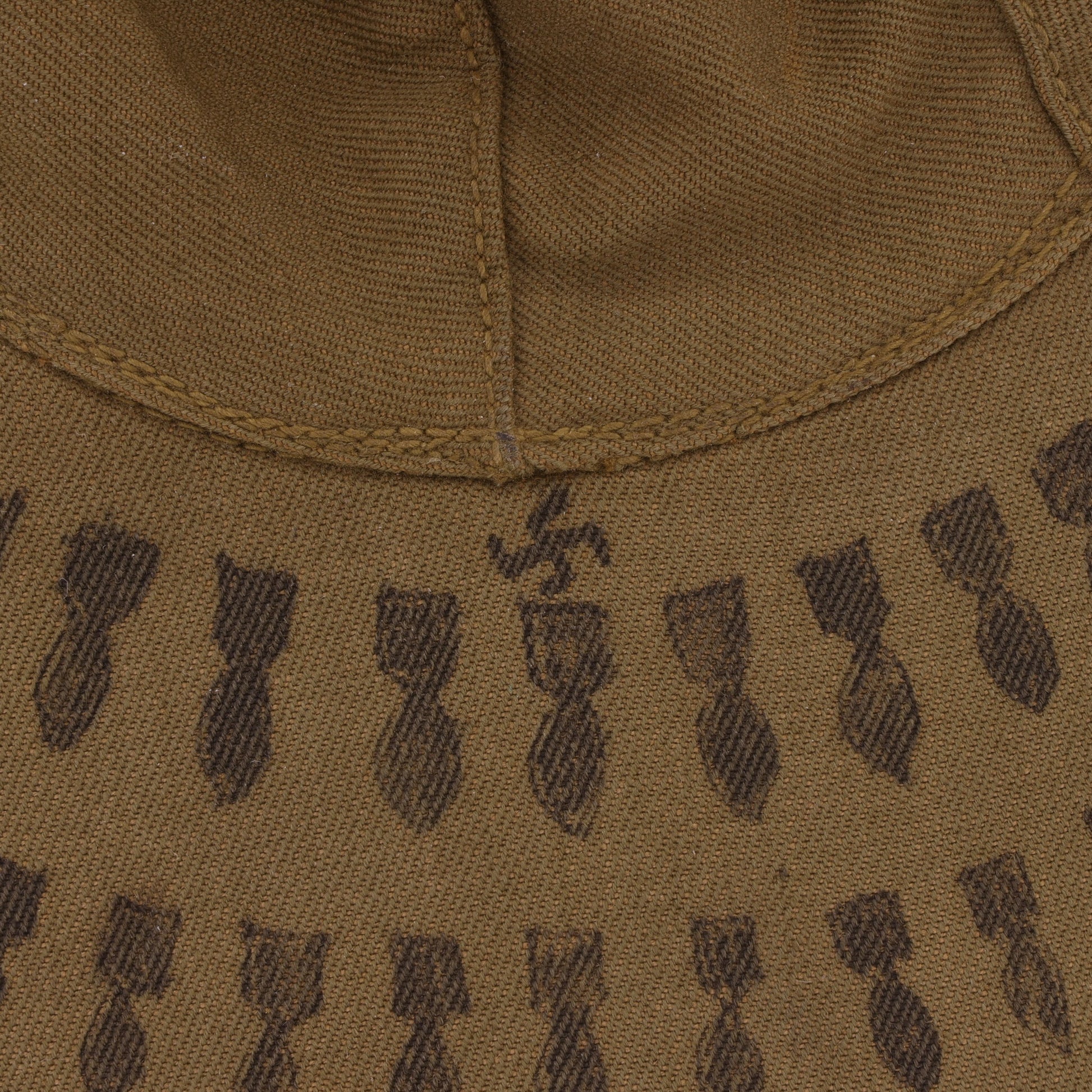 This is an original WWII U.S. Army Air Force B-1 summer flying cap manufactured by Zip-A-Bag Corp. of New York, New York. These were standardized in 1939 and quickly became a favorite among American airmen. Its interior crown is inscribed "A.A. LEVINE 1st LT. A.C., 535 SQD. 381 GR., O-757725". View the Veteran's Information section for more details regarding Lt. Abraham "Alvin" Levine's life and military service. Thankfully, we have a handwriting sample in the form of Levine's draft registration cards (below); when comparing those to the hat's inscription, it becomes readily apparent the two were certainly done by the same hand. The cap's visor is decorated with a small swastika and 30 bombs, signifying 30 successful bombing missions over Nazi-occupied Europe - a poignant personalization given Lt. Levine's Jewish background. Written on the visor's underside is the name of Lt. Levine's Douglas B-17G Flying Fortress, "TOUCH THE BUTTON NELL II", done in the same bubble font as the aircraft's nose art (shown in the final image). This cap is constructed of a summer weight khaki cotton, features a lacquered leather headband, and is a desirable size 7 3/8.