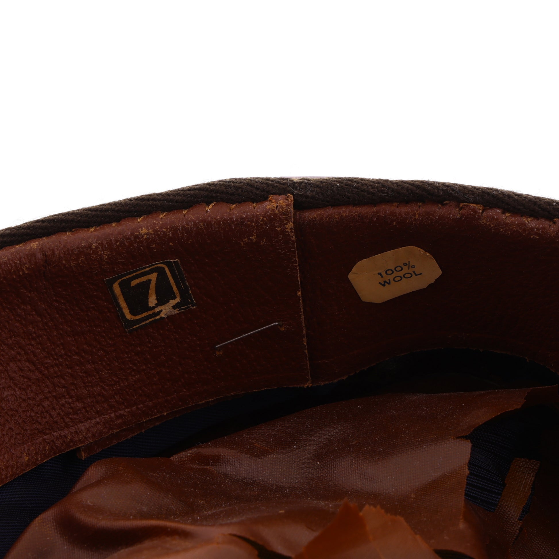 This cap is in good, used condition. Unfortunately, however, the "E-Z Cushion" marked headband's stitching has come undone by the wearer's forehead, the plastic headliner is cracking, and the wool exhibits some moth holes.