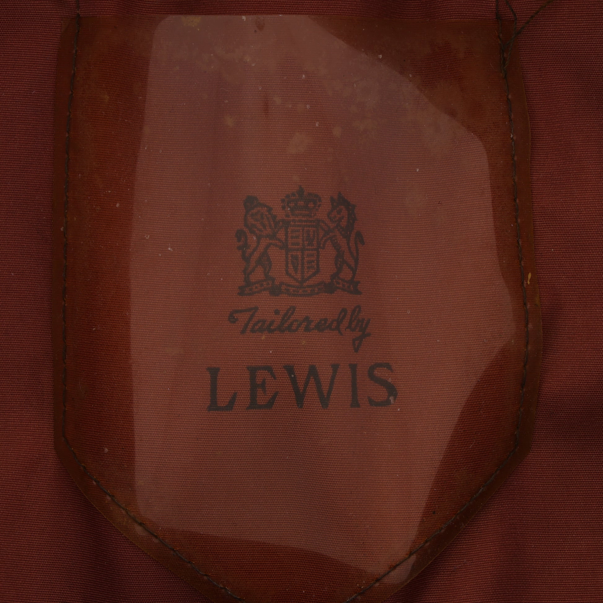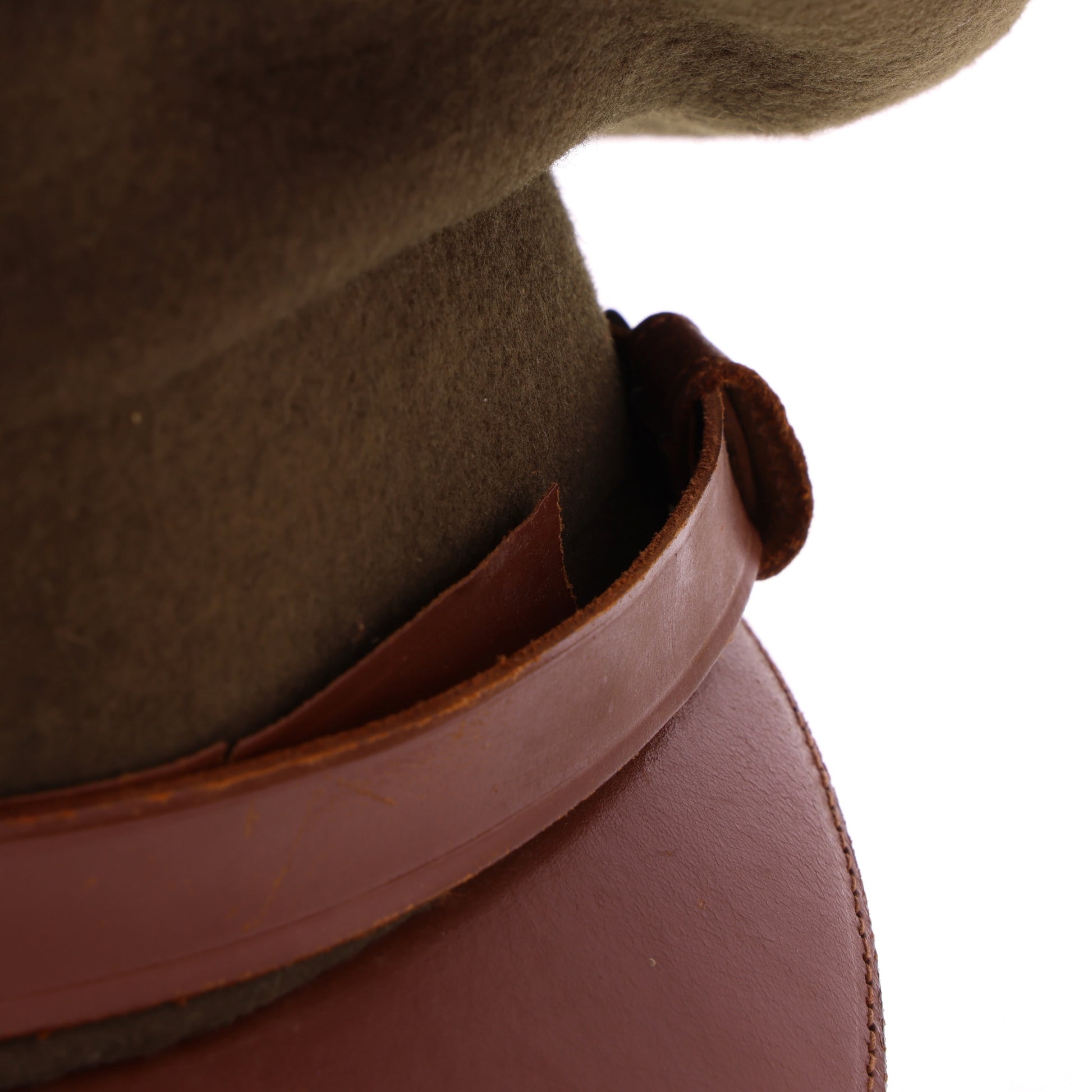 This is an original WWII U.S. Army Air Force enlisted man's service cap, marketed as "The Fly-Weighter" by Lewis, which is believed to be Lewis Hat Company of Truro, Nova Scotia. Its original owner removed the cap's interior wire stiffener, allowing the hat to be reshaped and "crushed" into a silhouette more popular among American airmen. It is constructed of olive drab wool felt and features a russet brown leather visor and chinstrap. The front is decorated with a brass enlisted man's device. Beneath the headband is a size tag of 7 1/4.
