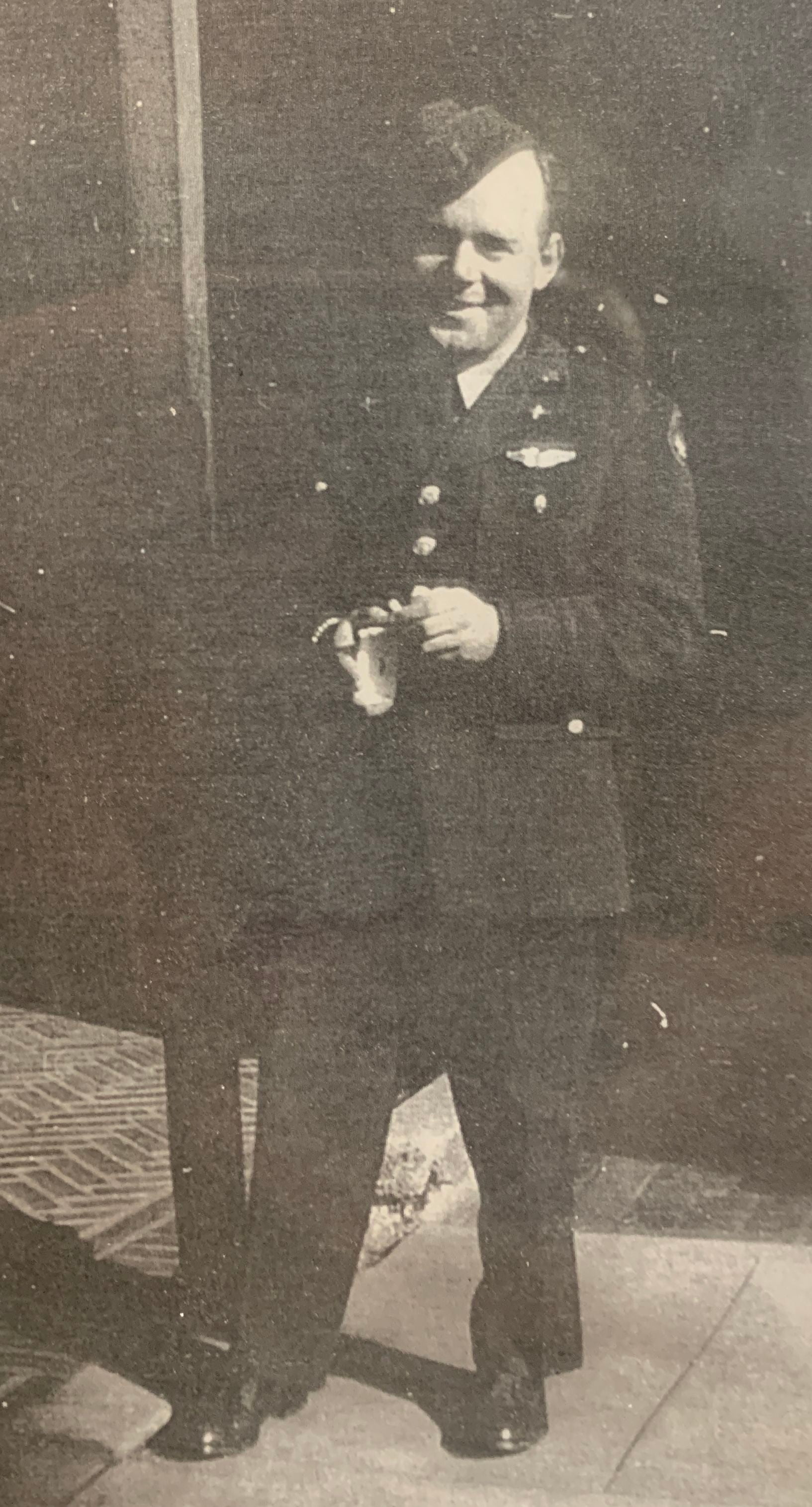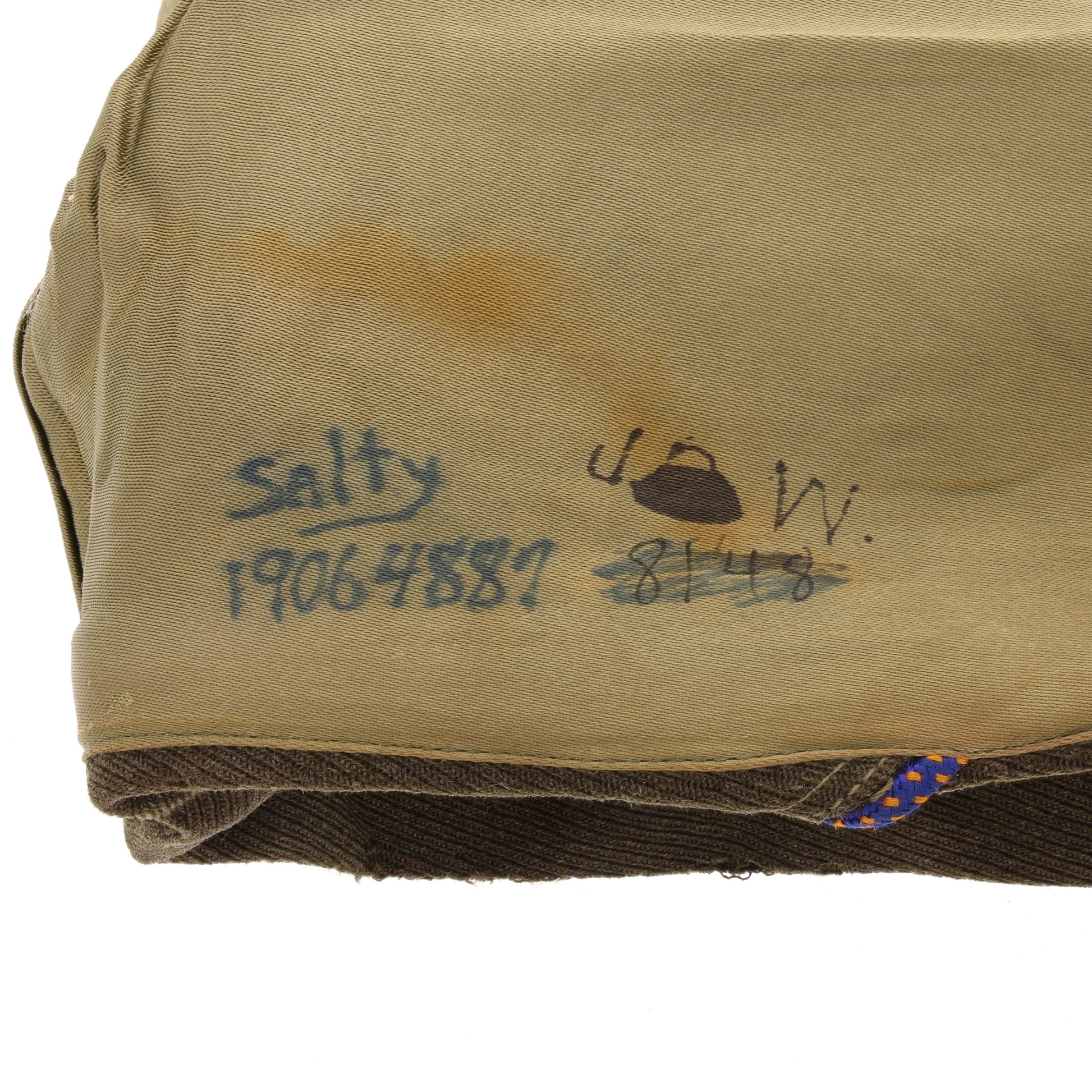 This is an original WWII U.S. garrison cap, with the "ultramarine" and "golden orange" piping, denoting use by the Army Air Force. Its lining is inscribed with the veteran's nickname and serial number, "Salty, 19064887". View the Veteran's Information section for more details regarding Lt. Paul A. “Salty” Tarantino's life and military service. This cap is constructed of "chocolate" gabardine wool. Unfortunately, its manufacturer's and size label could not be located, however it was hand-marked "6 7/8" and bares a "C456" material supplier's stamping. The lining is also marked with the partially crossed out initials and last four digits of another serviceman's serial number, "J._.W., 8148", indicating Lt. Tarantino acquired this cap secondhand. The last image appears to show Lt. Tarantino wearing the same garrison cap. It is an incredibly rare opportunity to own an identified item, with a wartime photograph of that specific item actually being used.