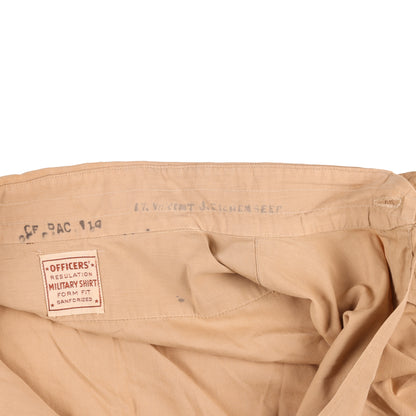 This is an original WWII USAAF officer's service shirt, with epaulets. It is identified to Lieutenant Vincent J. Eichenseer. Unfortunately, many officers' records remain inaccessible to the public, as is the case with Lt. Eichenseer. It is constructed of a khaki cotton material. We could not locate a size marking but please refer to the Measurements section for more details. It retains its original USAAF shoulder sleeve insignia. Stitched beneath the collar is a label which reads "OFFICERS', REGULATION, MILITARY SHIRT, FORM FIT, SANFORIZED". Inscribed on the tail is a different serviceman's laundry number, "M-7705". A search of the National Archives unfortunately reveals too many results to be conclusive.