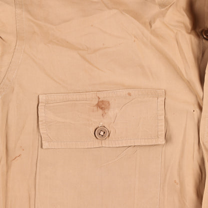 This shirt is in fair, heavily used condition. It exhibits several stains, holes, and tears - including significant damage to the wearer's left shoulder. All of its original buttons remain intact.