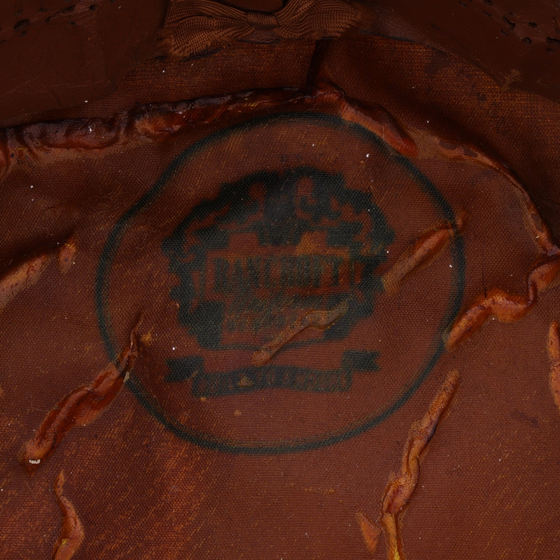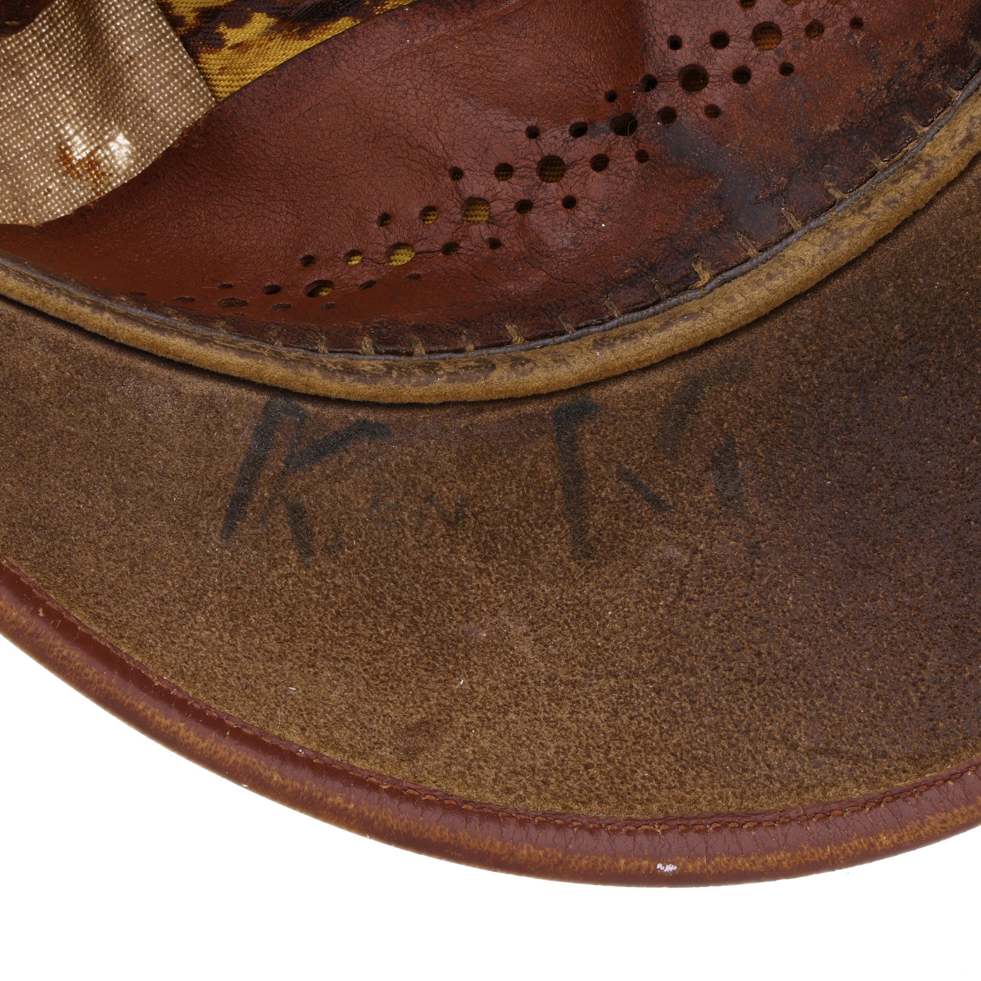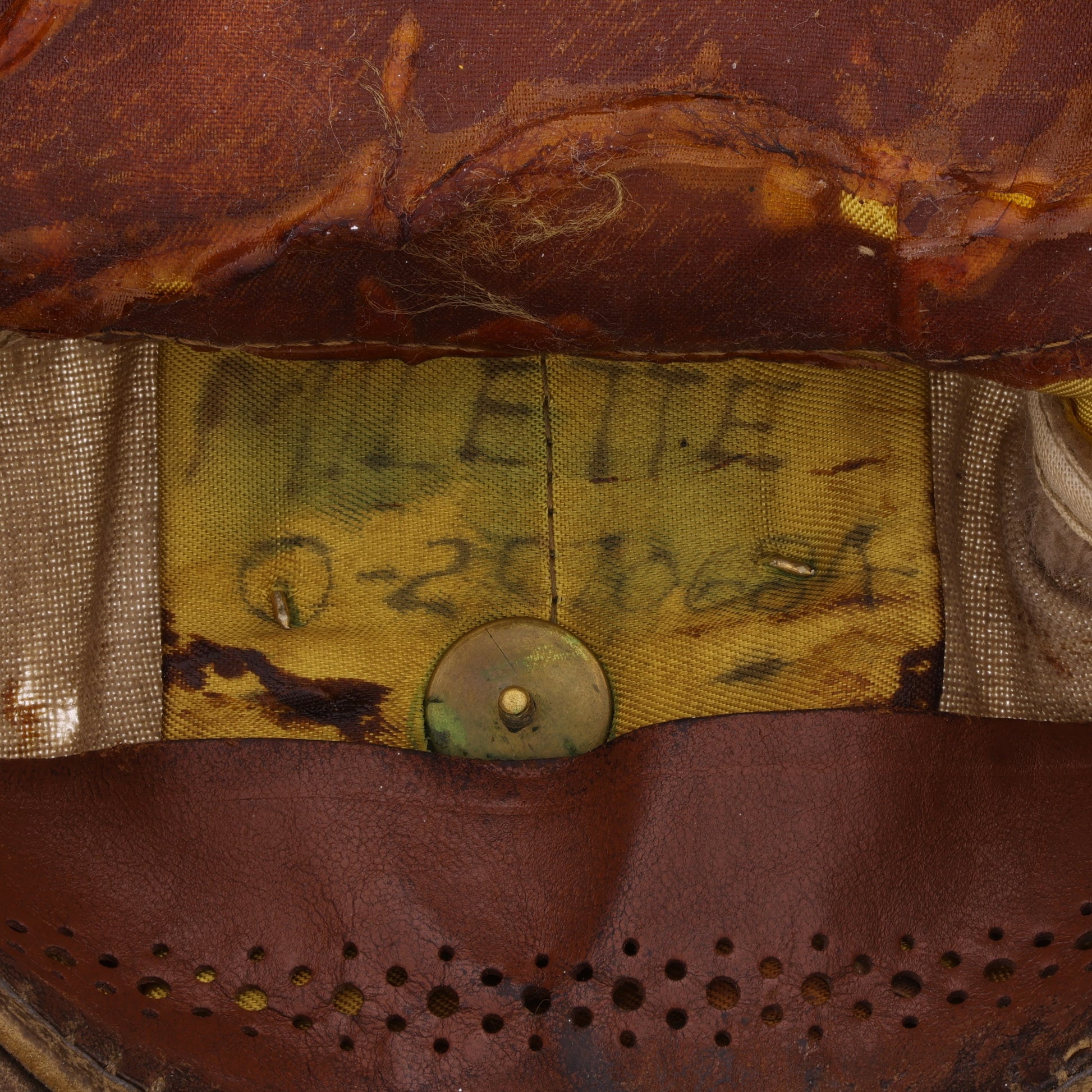 This is an original WWII U.S. Army Air Force officer's "Flighter" crusher cap manufactured by Bancroft Cap Co. of Framingham, Massachusetts. It is inscribed with its original owner's name and serial number, "MILETTE, O-2070684". View the Veteran's Information section for more details regarding Lt. Kenneth A. Milette's life and military service. This cap is constructed of a summer weight khaki cotton and features a russet brown leather chinstrap and single ply "crushable" visor. Its headband is marked “BY BANCROFT, Visor Pat. Pend.”, which denotes production from May 12, 1943, to February 13, 1945, before which Flighters were simply labeled "BY BANCROFT" and after which they were also marked "U.S.PAT.NO.2369275". With its circular headliner emblem, this cap was likely produced towards the end of that timeframe. The visor's underside is stenciled with Lt. Milette's initials, "K.M.", while the headband is marked "MILETTE". The cap's front is decorated with a gold-plated brass oversized officer's device. Unfortunately, no size tag could be located; however, it has been measured and is a confirmed size 6 3/4.