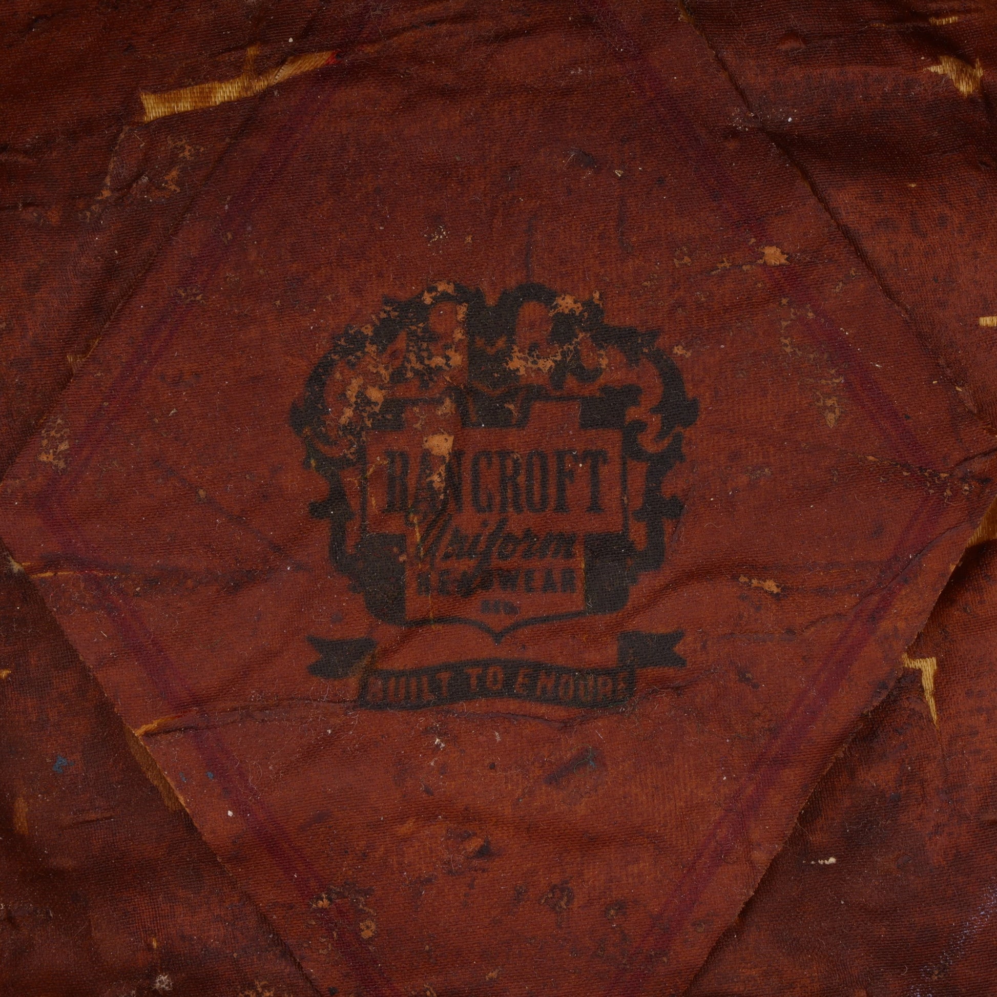 This cap is in good, well used condition. The khaki material exhibits moth holes, and the headliner has stiffened and deteriorated.
