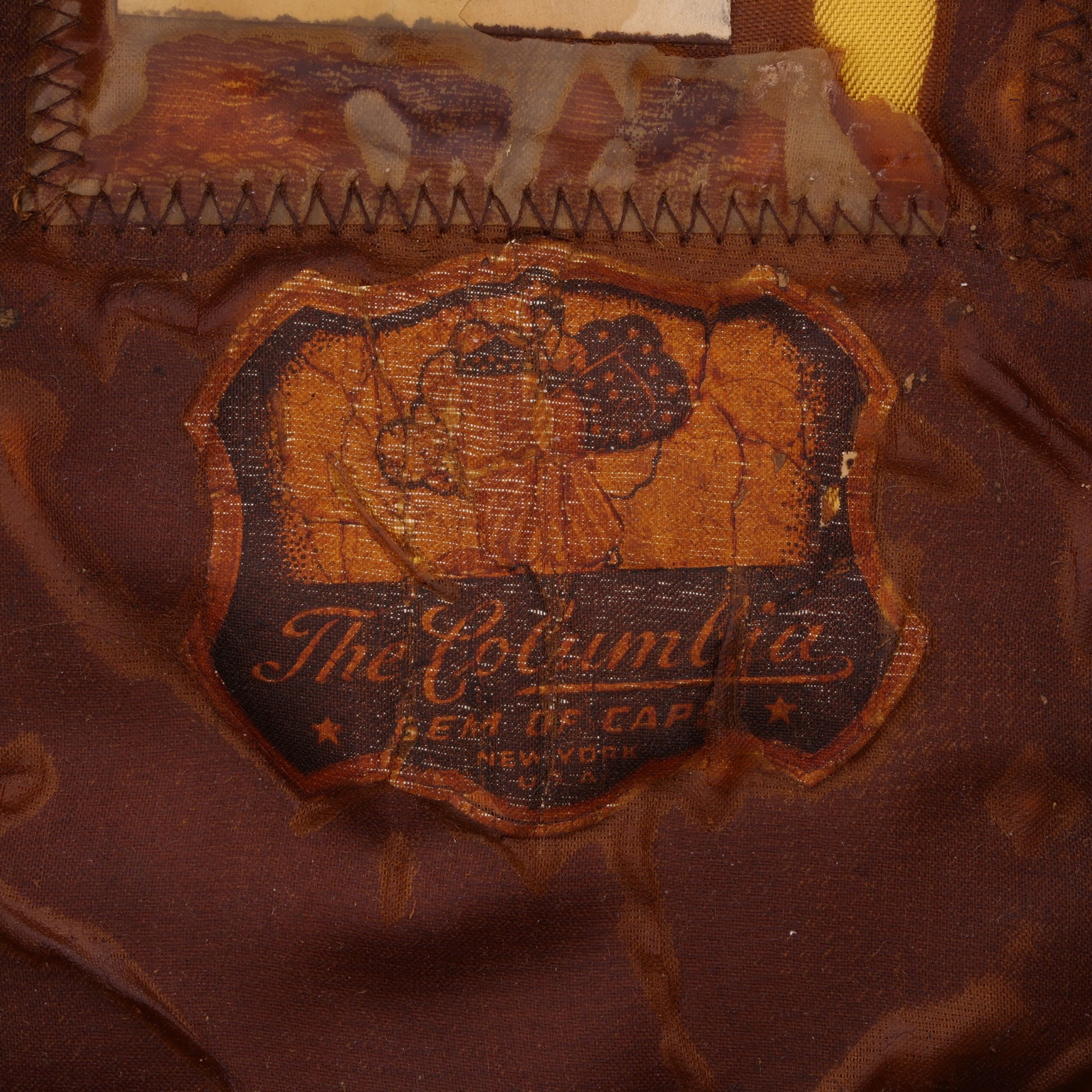 This cap is in good, used condition; however, the headband's stitching has failed near the wearer's forehead. When first acquired, its chinstrap was unfortunately torn. We have since replaced it with an original, undamaged example. The damaged piece will be included should the new owner decide to return it to its prior state.