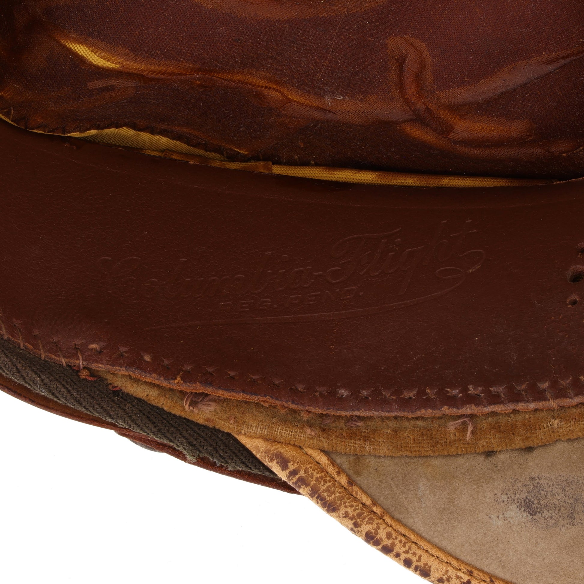 This is an original WWII U.S. Army Air Force officer's "Columbia-Flight" crusher cap manufactured by The Columbia, "Gem of Caps", of New York. It is inscribed with its original owner's name and serial number, "Scott J. Limes, T-1250106". View the Veteran's Information section for more details regarding Flight Officer Limes' life and military service. This cap is constructed of gabardine wool and features a russet brown leather chinstrap and single ply "crushable" visor. The headband is embossed "Columbia-Flight, REG. PEND." When first acquired, this cap was missing its device. Sourcing a faithful replacement proved to be challenging. Given Limes' "T"-prefix serial number, we know he achieved the rank of flight officer. Flight officers were authorized to wear the standard "Eagle Rising" device of Army warrant officers; however, photographic evidence exists of many flight officers wearing non-authorized officer's devices as well. After closely examining the imprint left on the wool behind where the device would have been secured, we are confident Limes was among the flight officers who skirted the regulations, and did in fact wear an oversized officer's device. Unfortunately, no size tag could be located; however, the cap has been measured and is a confirmed size 6 3/4.