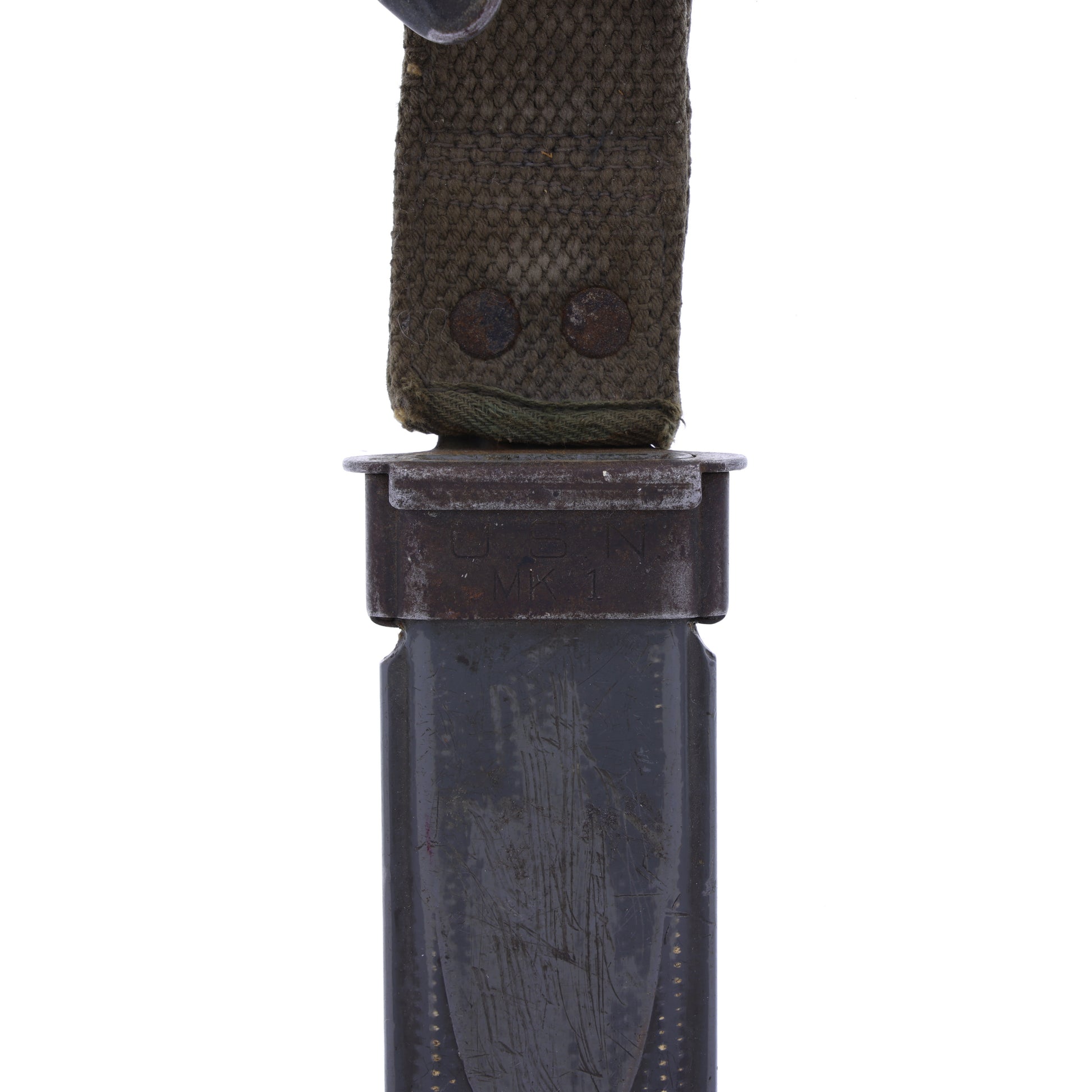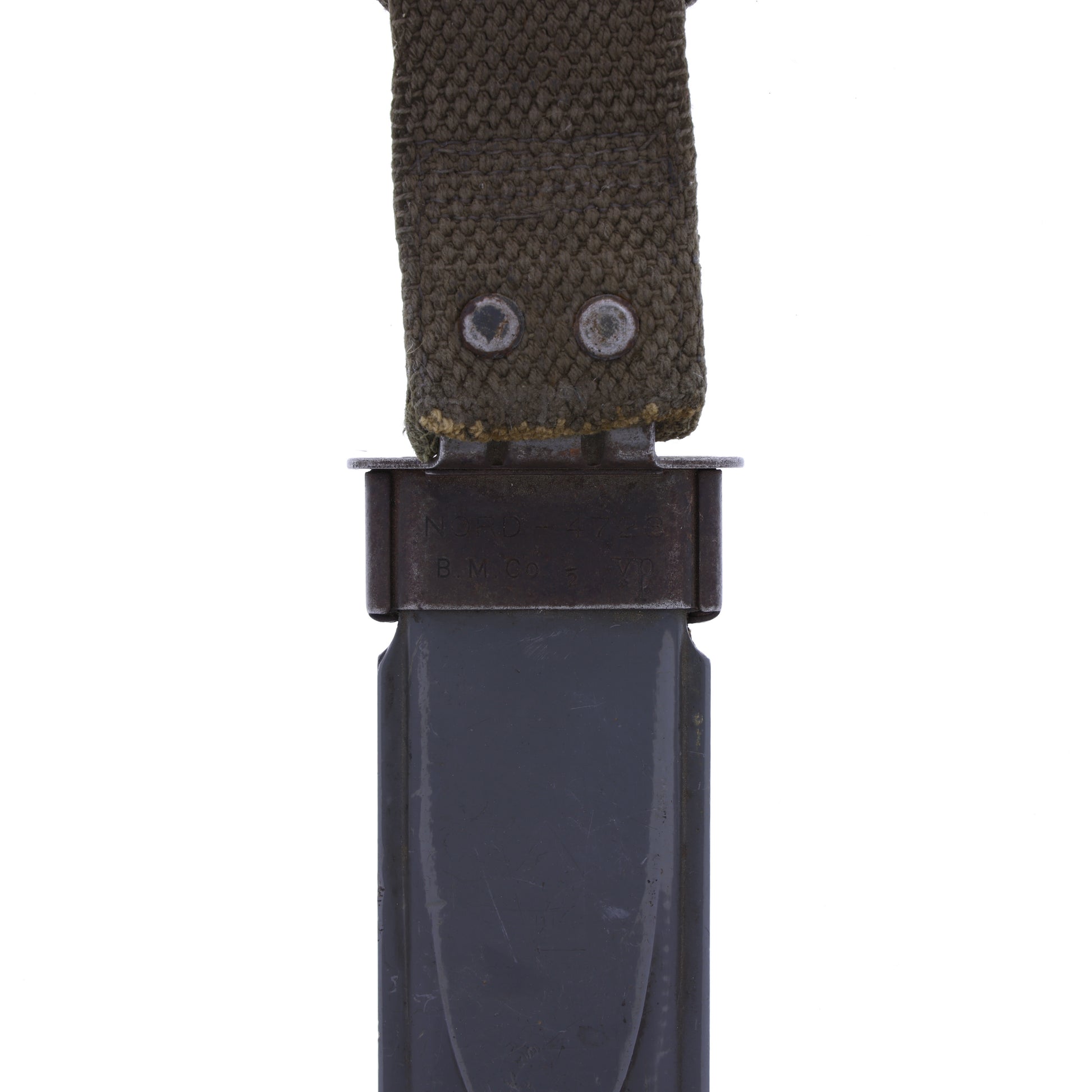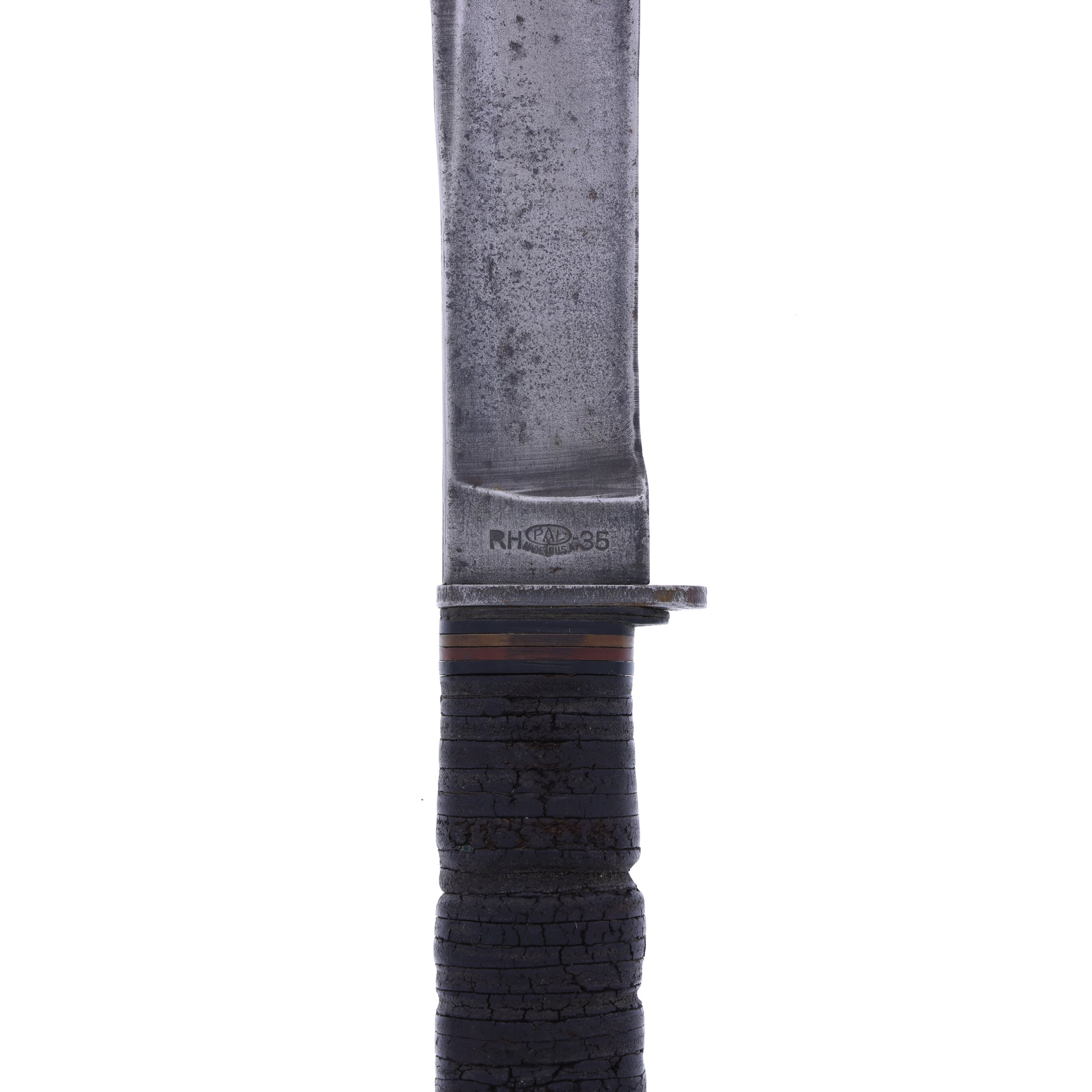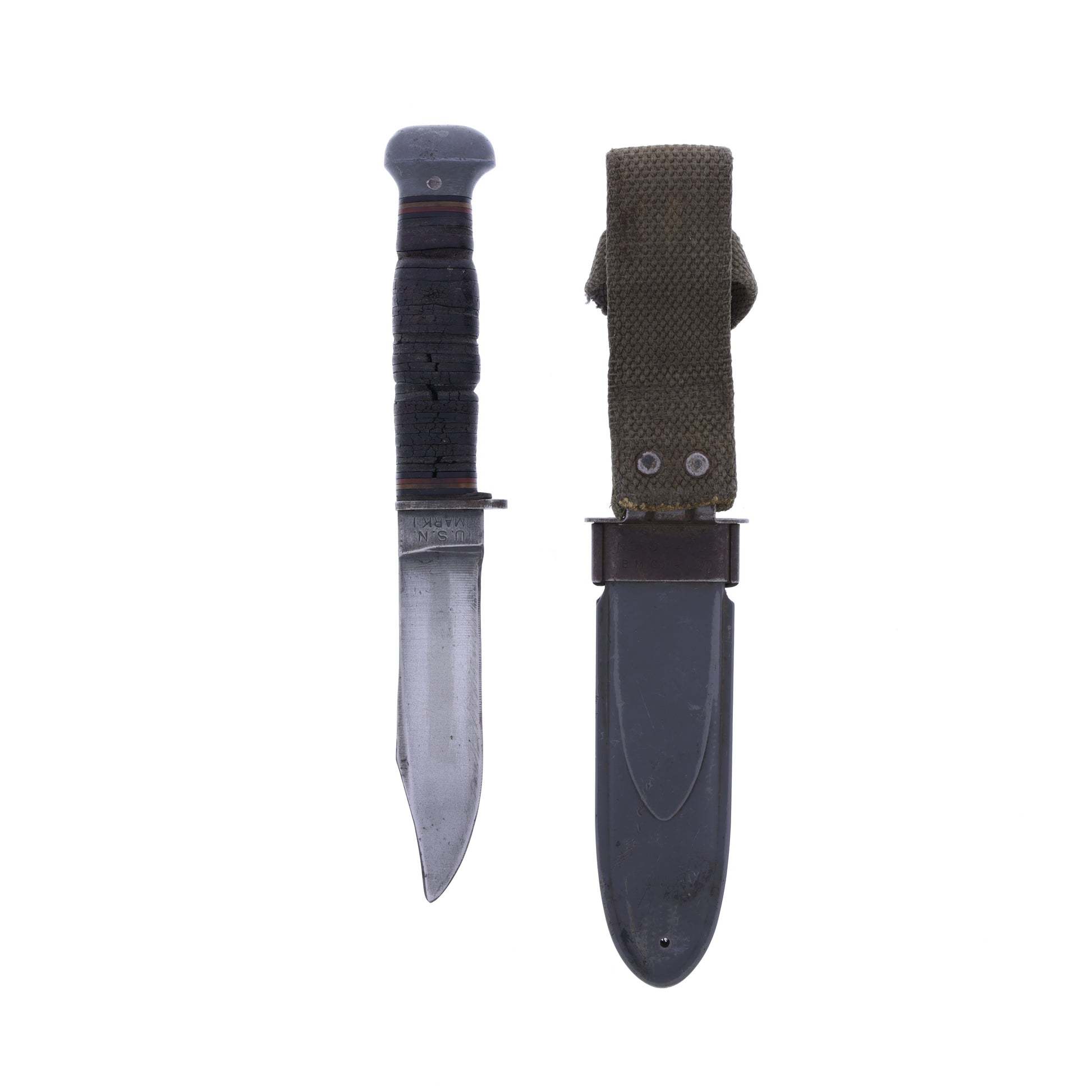 This original WWII USN MK I knife was manufactured by PAL Blade Company of Plattsburg, New York. These were the favorites of naval aviators and sailors alike. The ricasso is stamped "RH-35". Interestingly, PAL began as the sold off cutlery division of Remington Arms Company, and "RH" stands for "Remington Hunting". It comes complete with its original scabbard, which was manufactured by Beckwith Manufacturing Company. It is from the "NORD 4723" contract, which dates to November 1943.